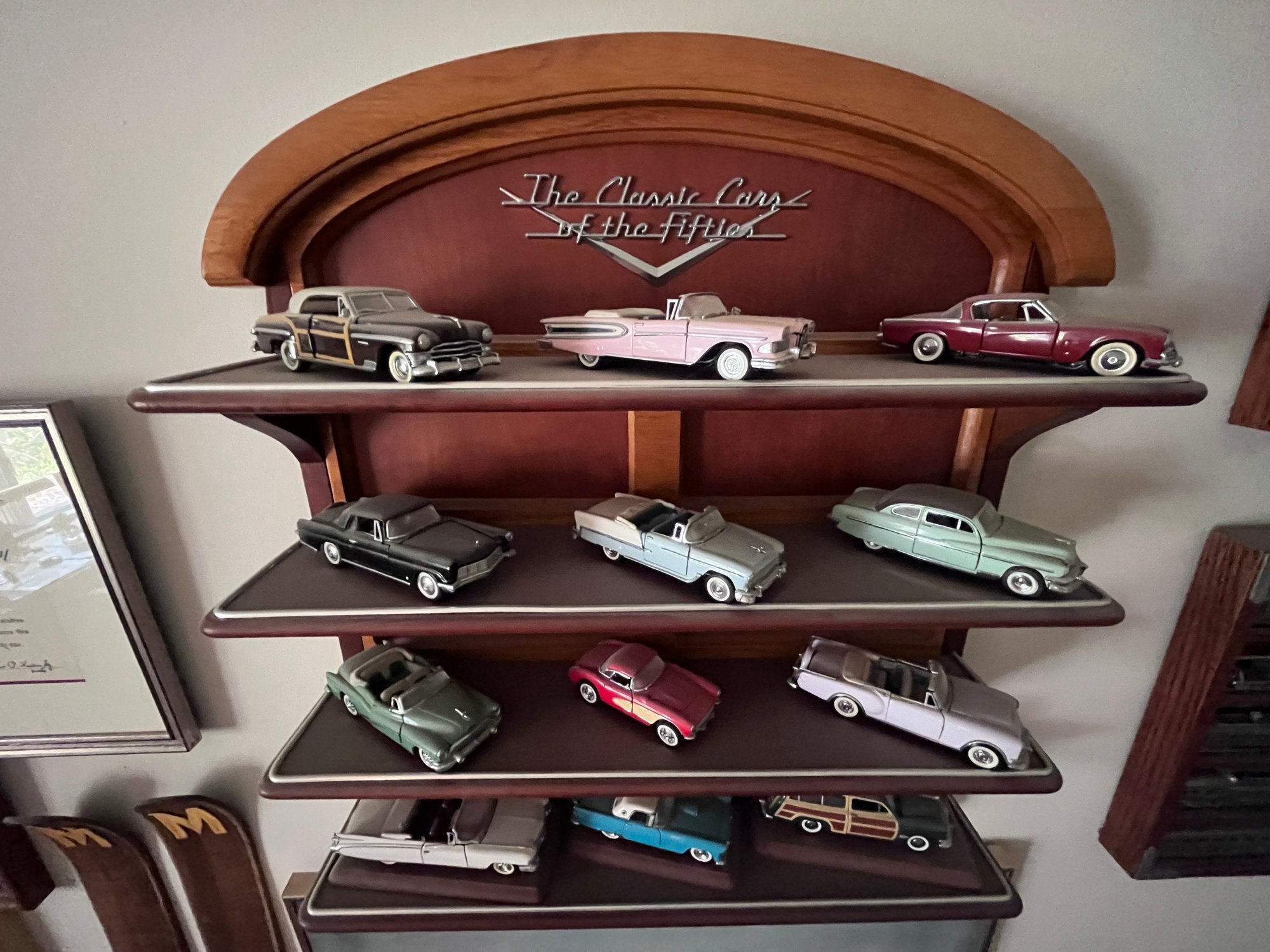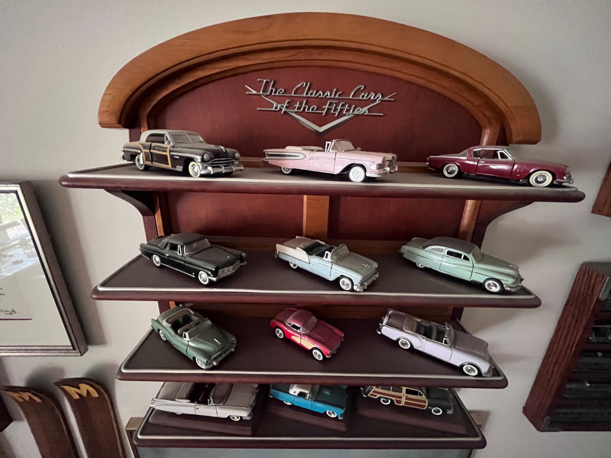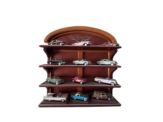 Franklin Mint "Classic Cars of the Fifties" diecast model cars displayed on their wooden shelf.