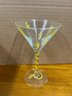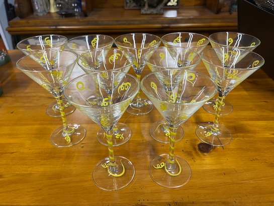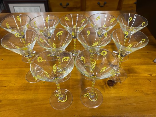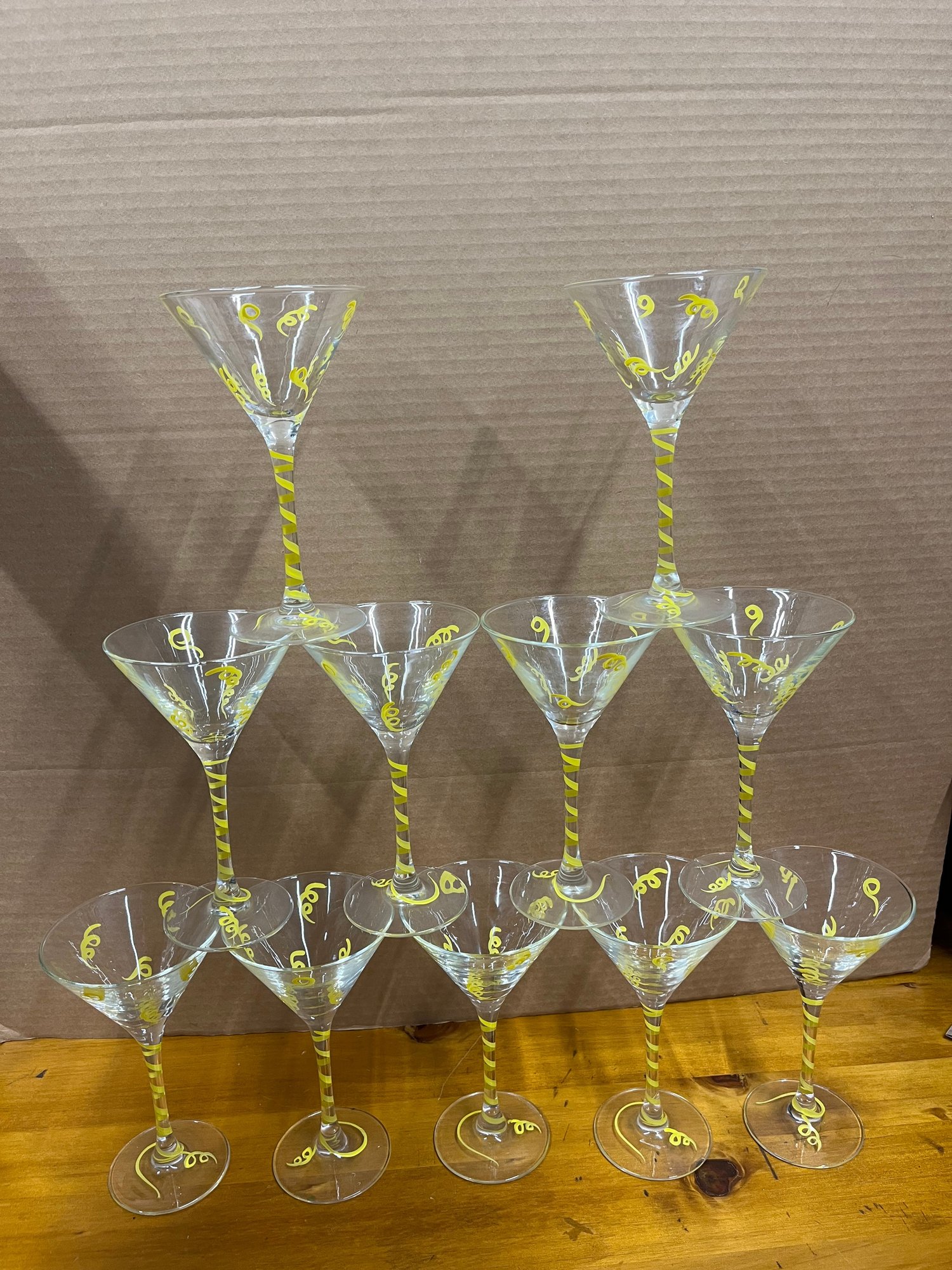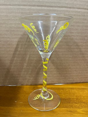 Hand-blown martini glass featuring distinctive yellow hand-painted yellow swirl designs on the clear glass bowl and base.