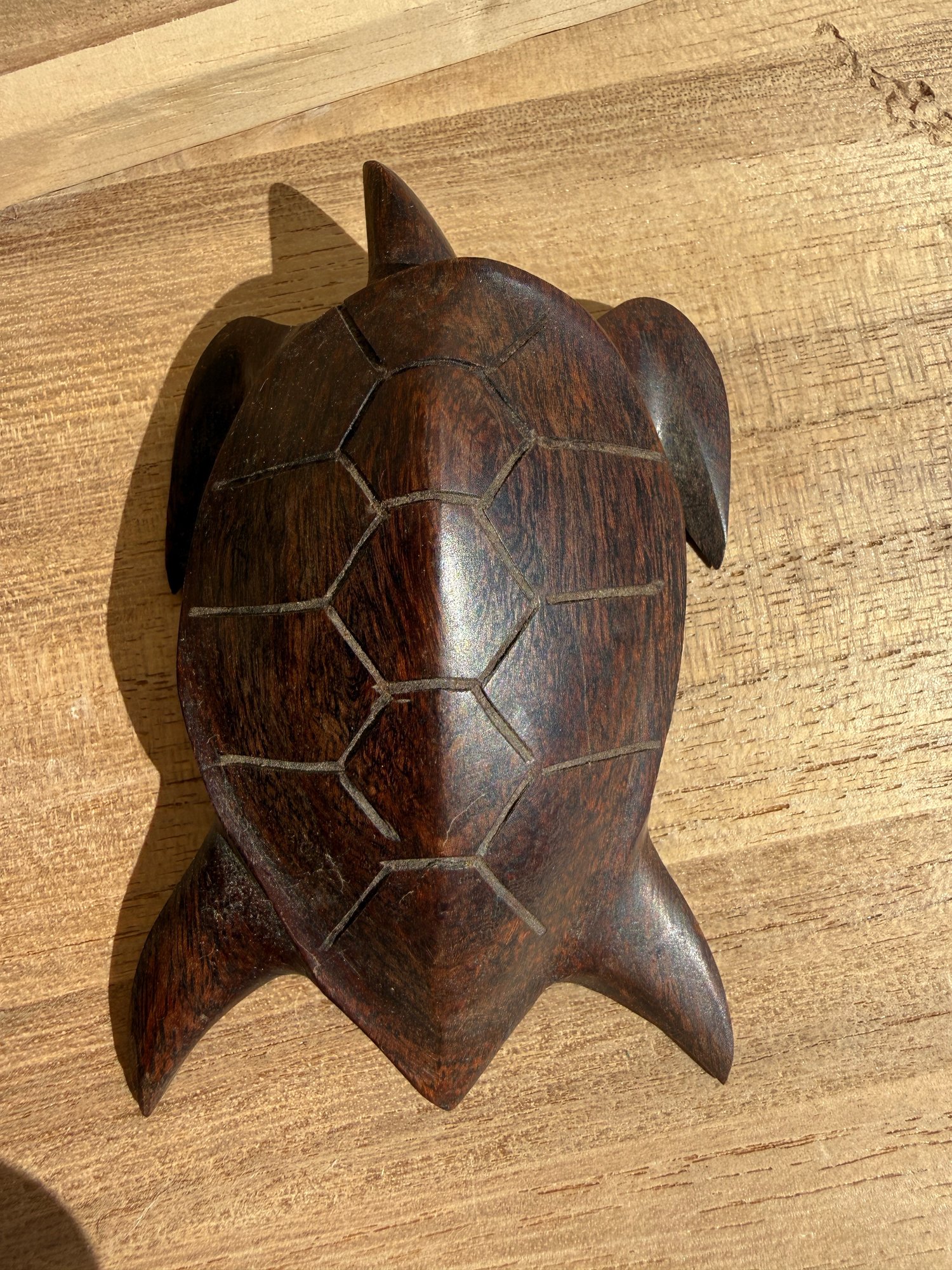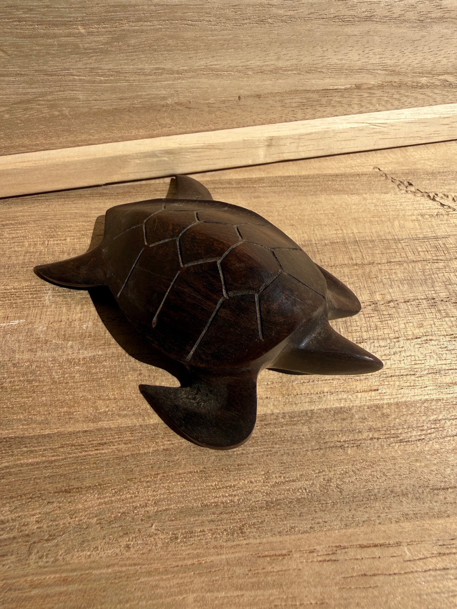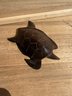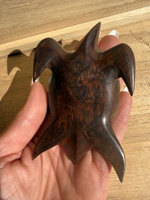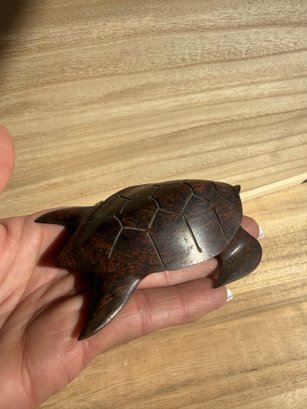 a vintage, hand-carved wooden sea turtle figurine, most likely made from ironwood.