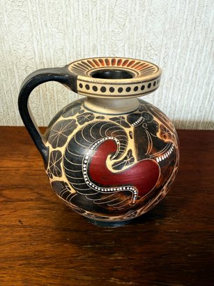 Handcrafted ceramic pitcher styled after ancient Corinthian pottery from Greece, featuring traditional decorative motifs.