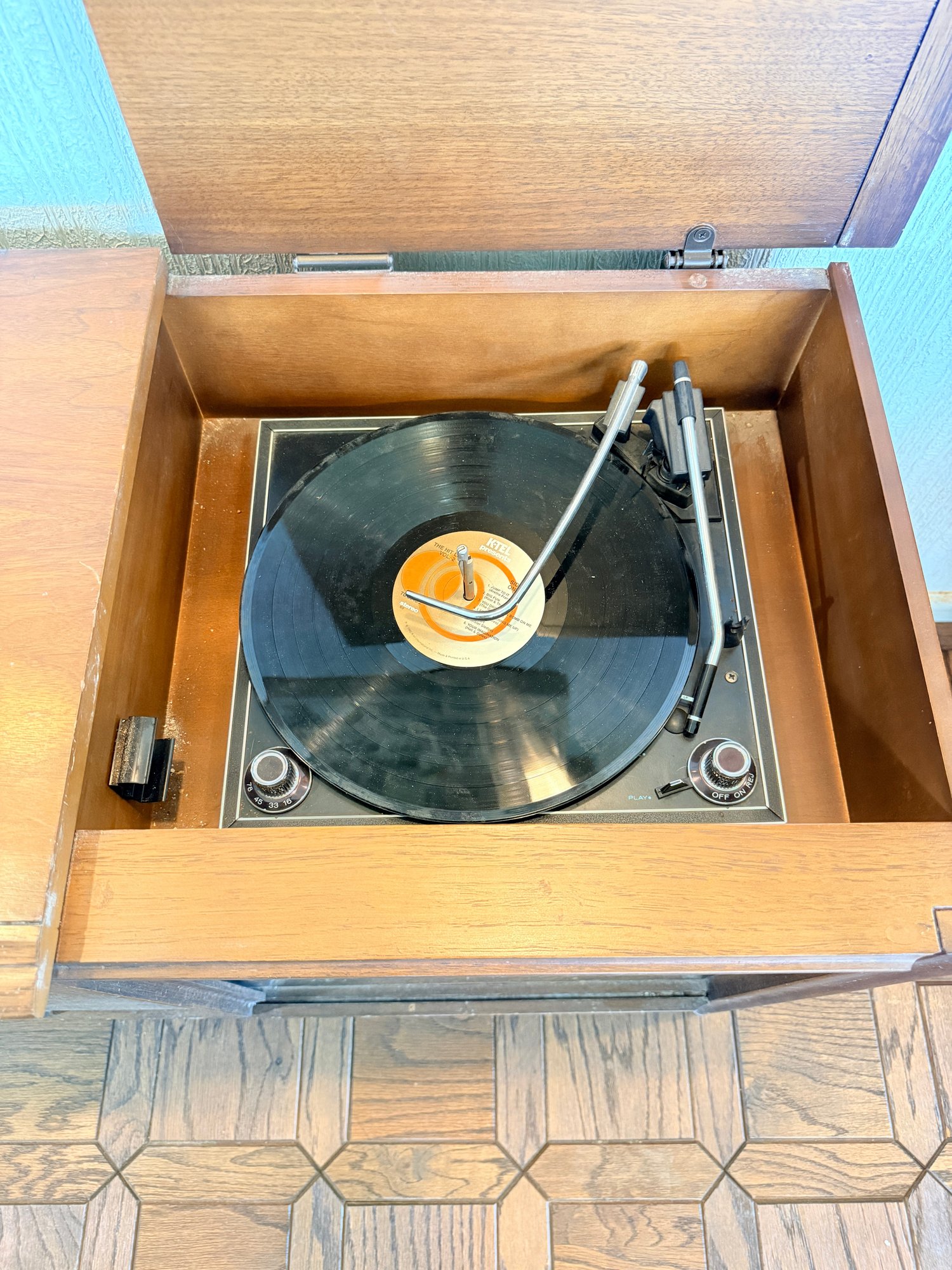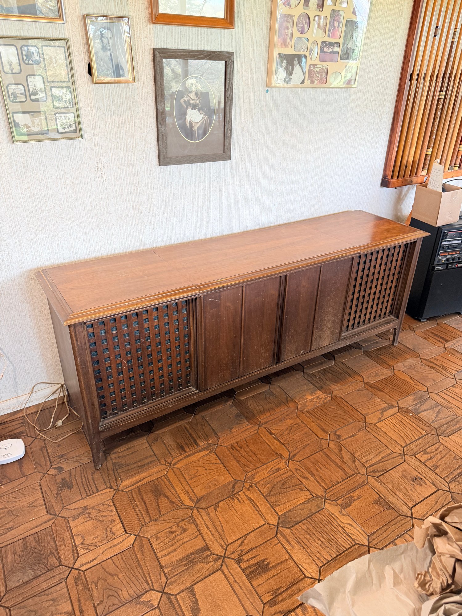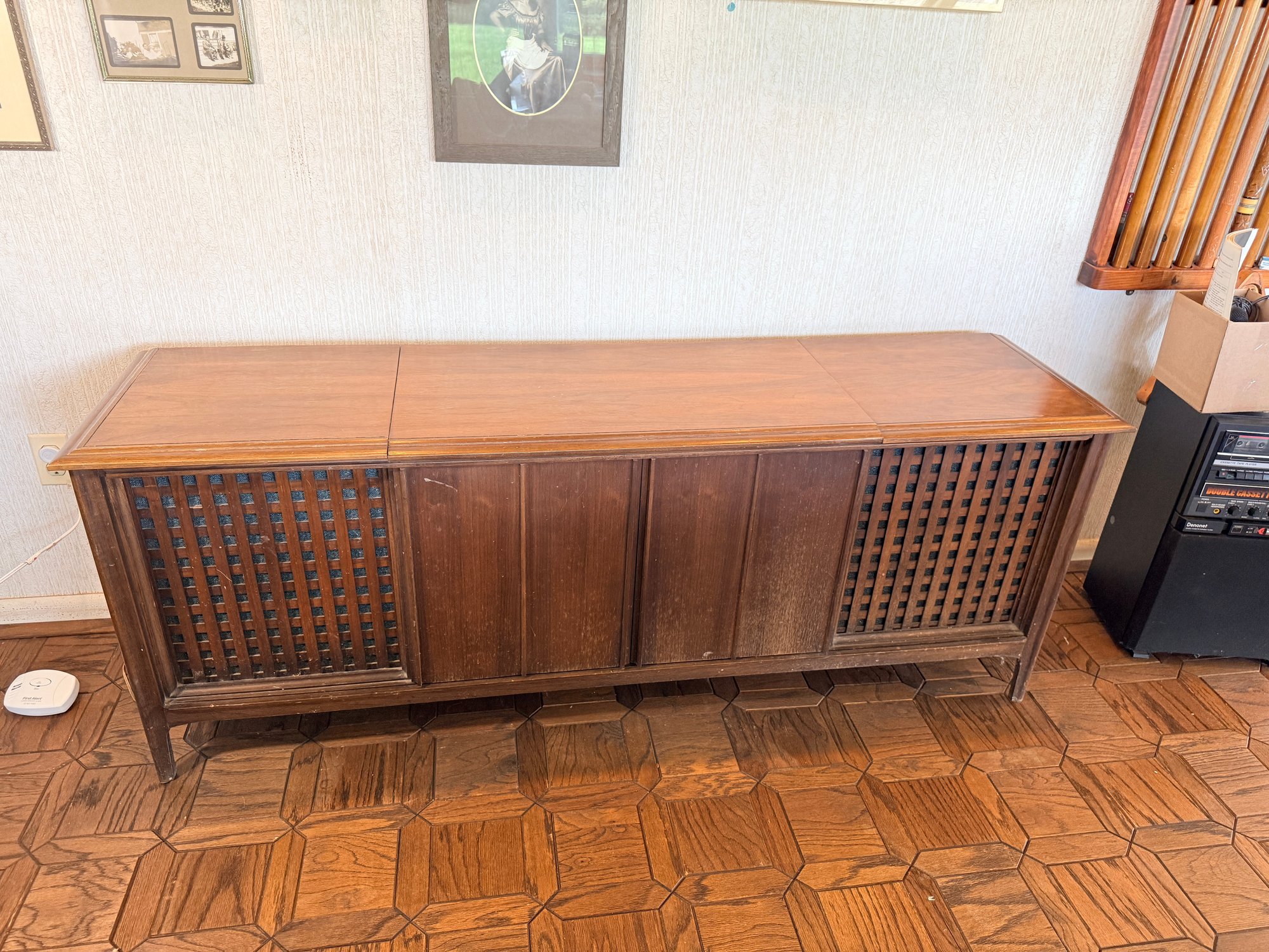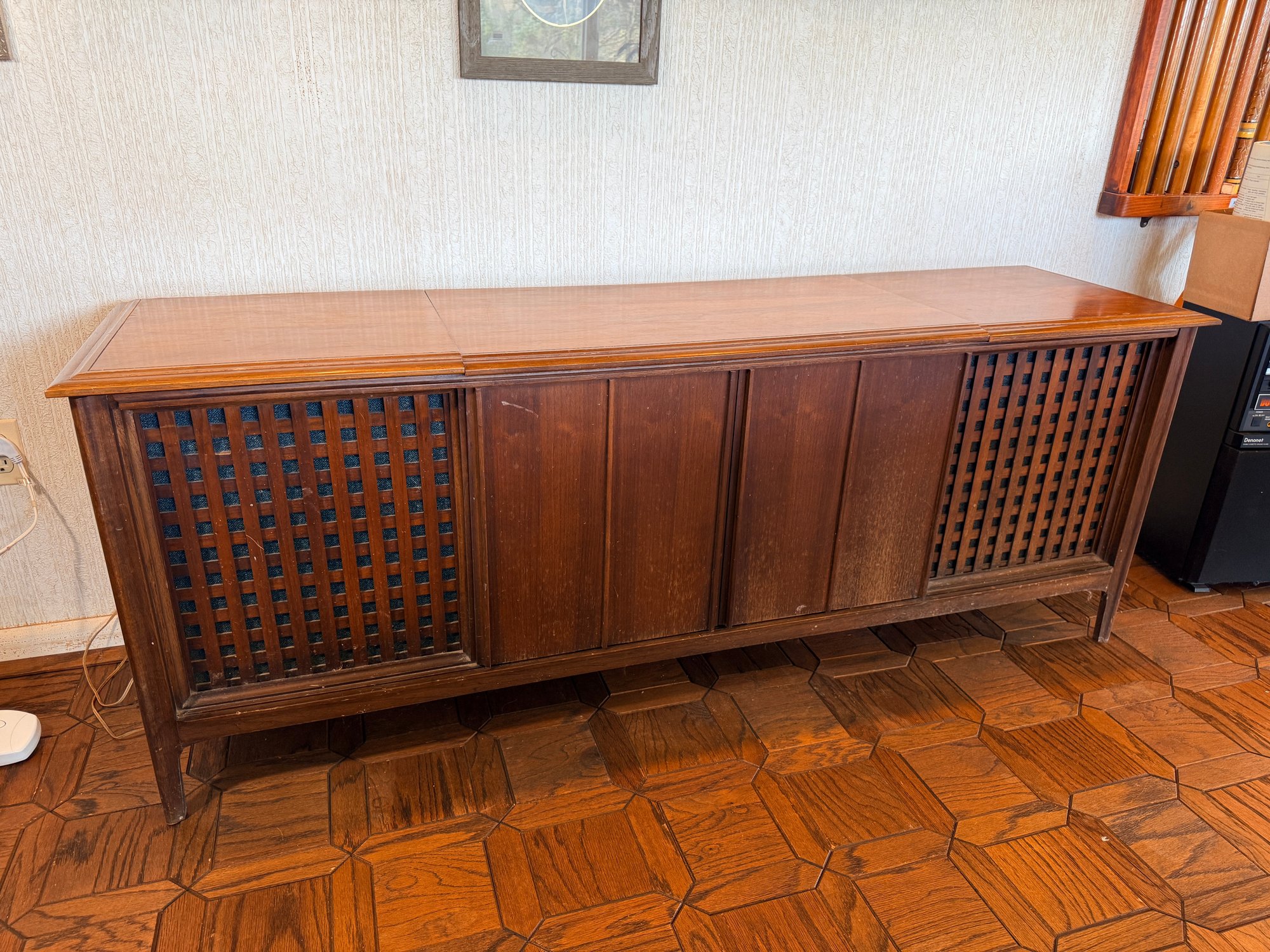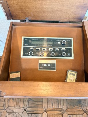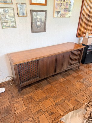 This mid-century modern solid state stereo console is a sought-after piece for vintage audio enthusiasts and interior designers.