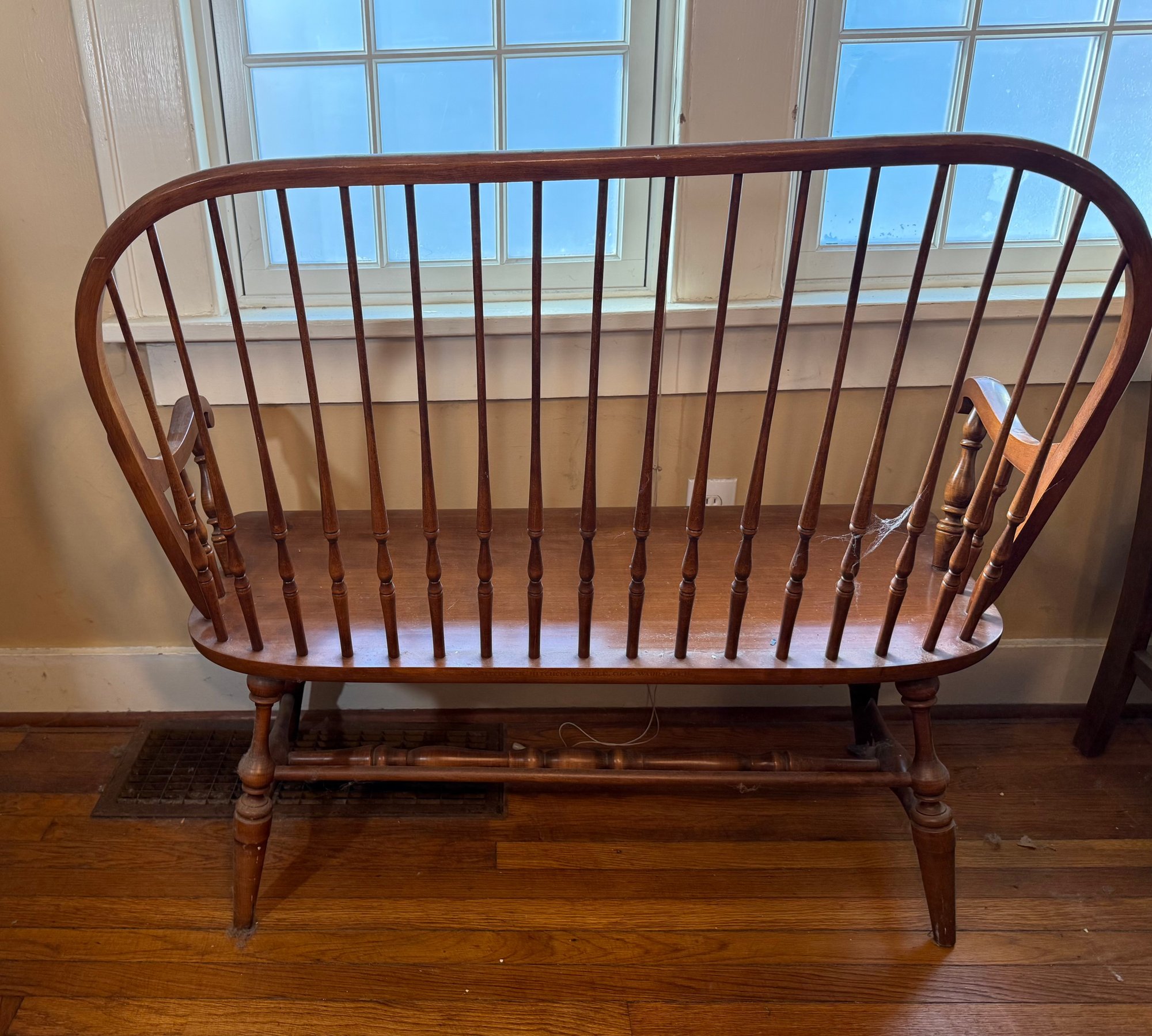 Style: Classic Windsor design, featuring a sack-back or comb-back with numerous turned spindles and scroll arms.