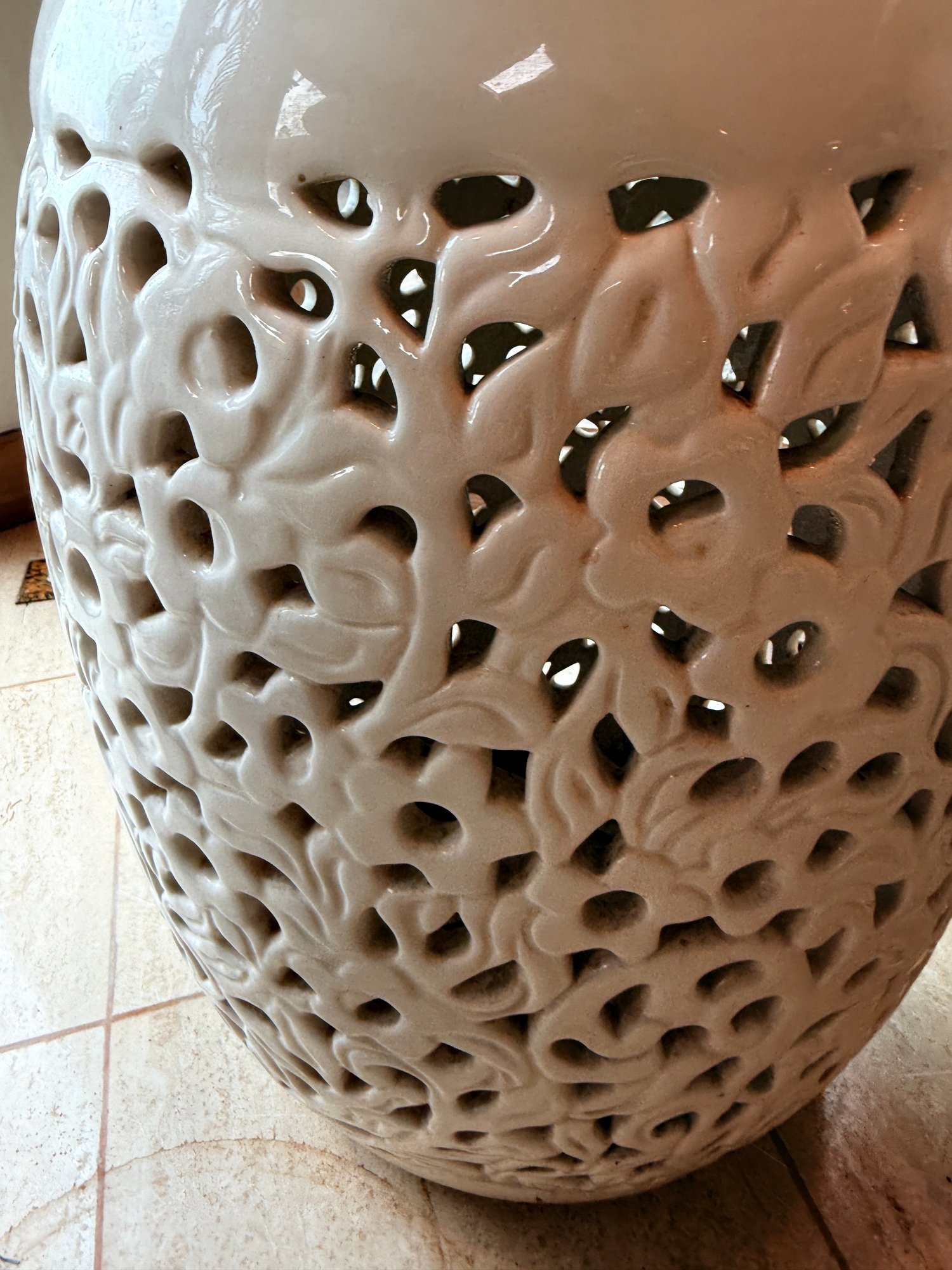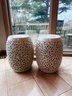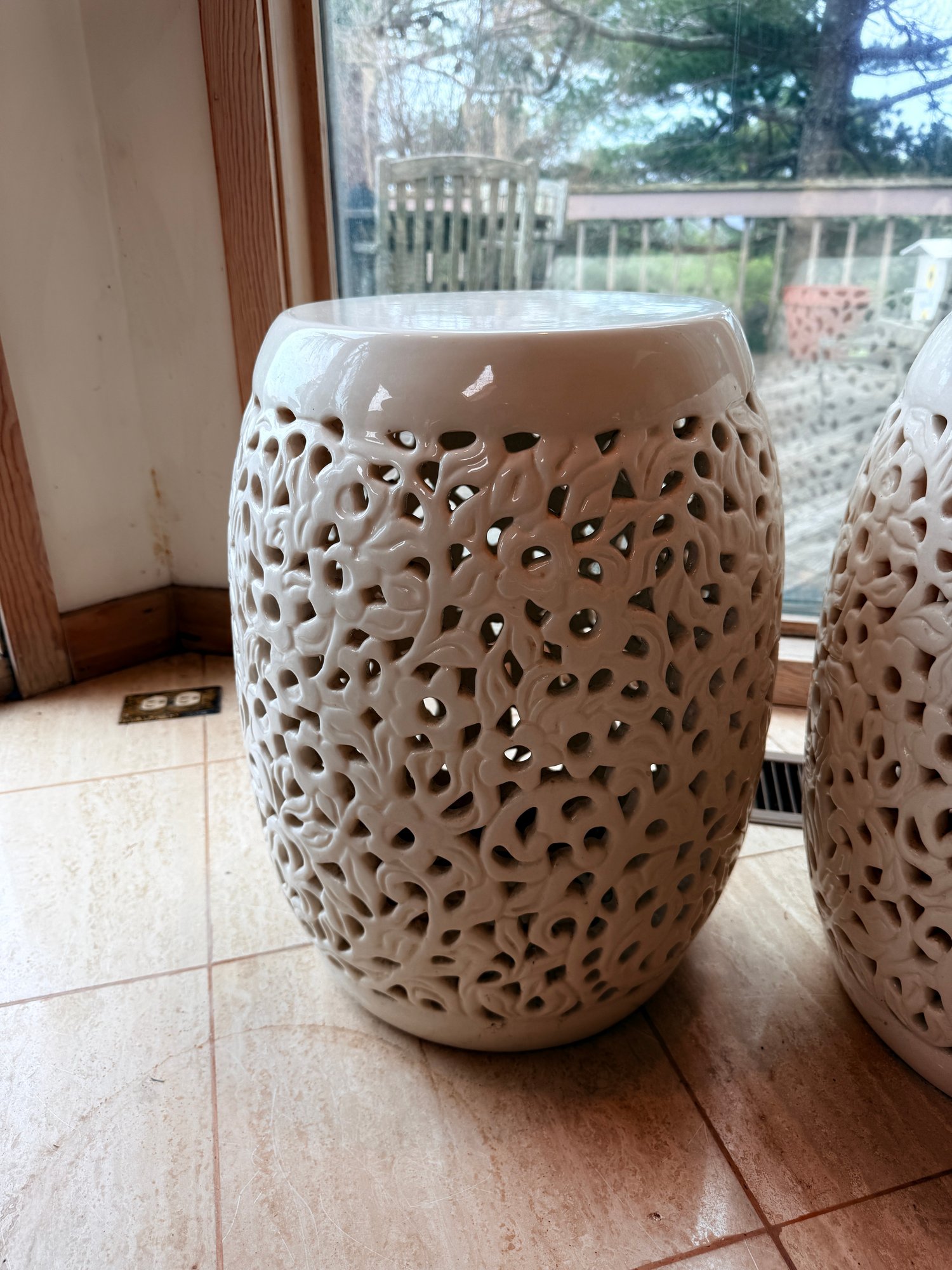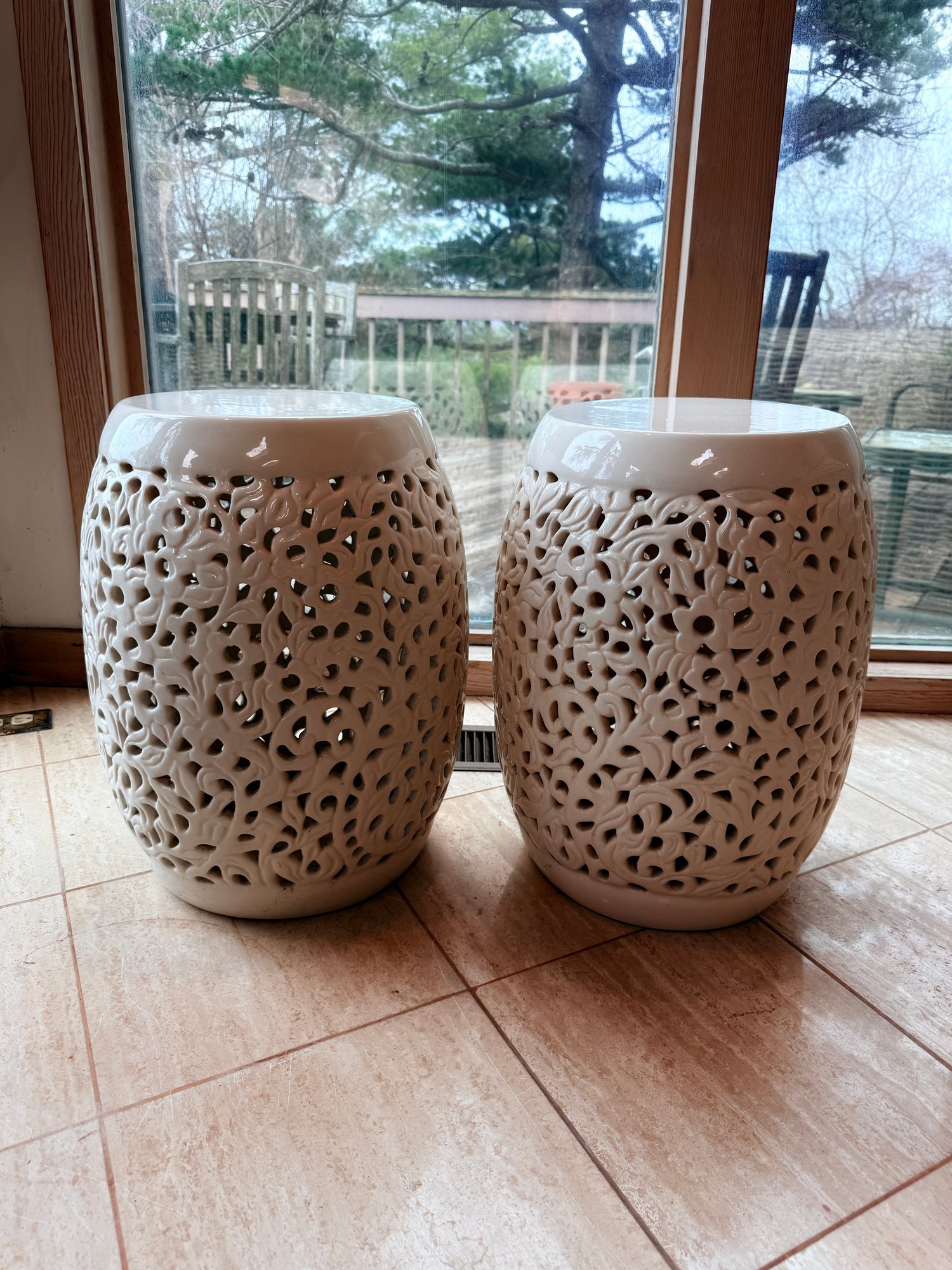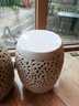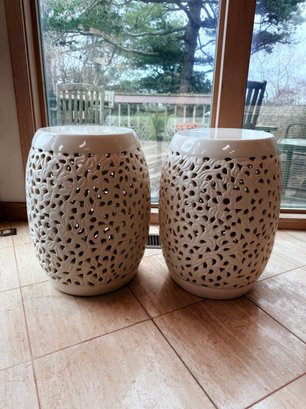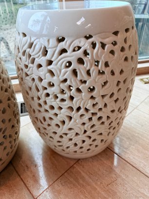White reticulated ceramic garden stools, a classic Chinoiserie-style decorative piece often referred to as "Blanc de Chine". These stools are highly versatile, serving as both functional furniture and elegant sculptural accents for indoor or outdoor spaces.