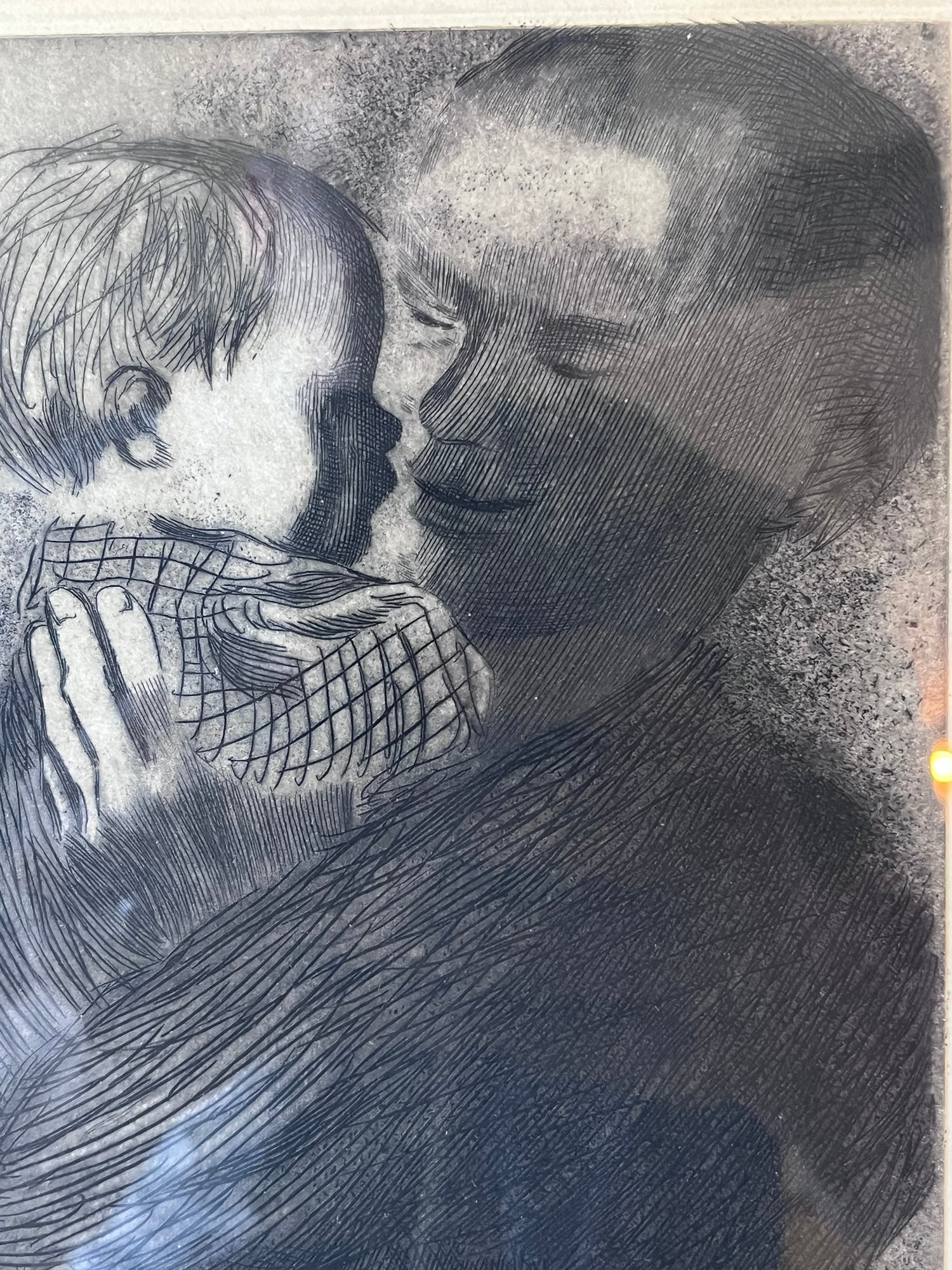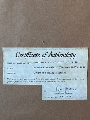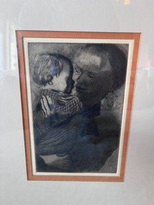 Beautiful framed etching restrike titled “Mother and Child” after renowned German artist Käthe Kollwitz (1867–1945). Powerful and emotional composition depicting a mother holding a child, one of Kollwitz’s most recognized and collected themes.