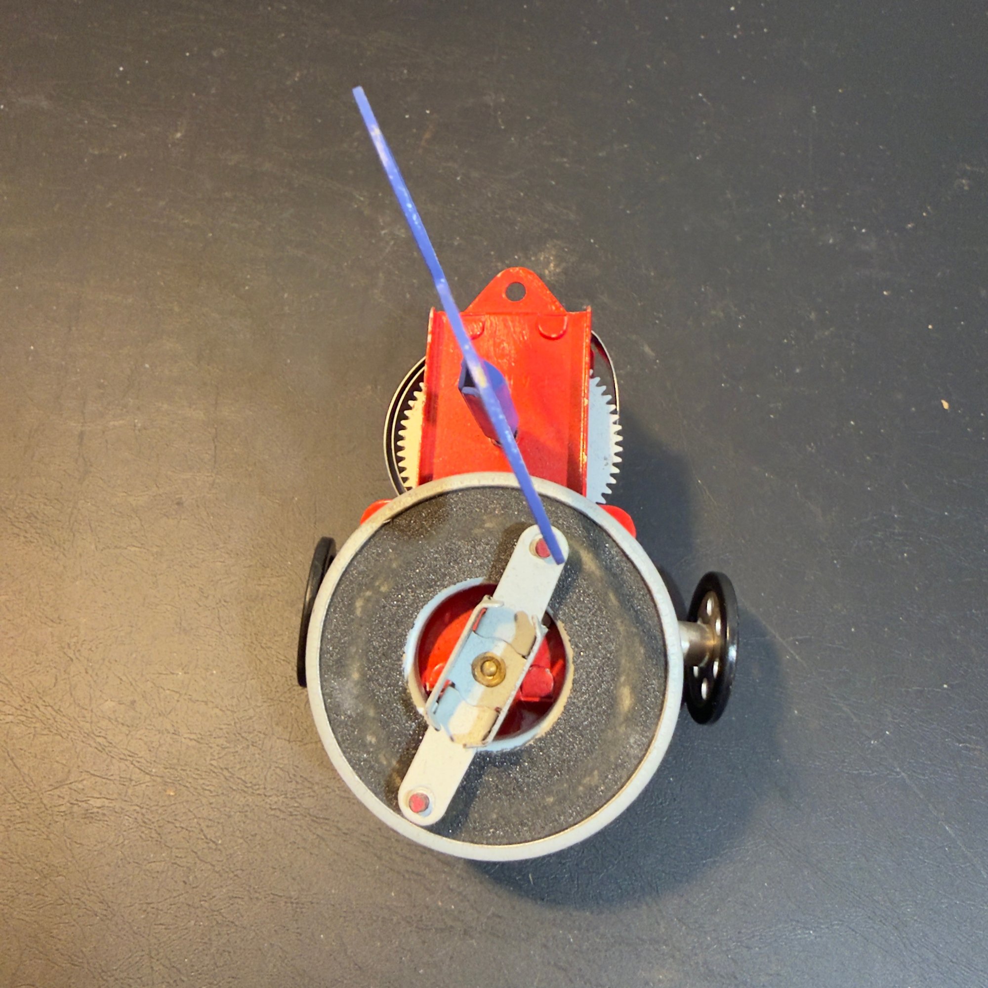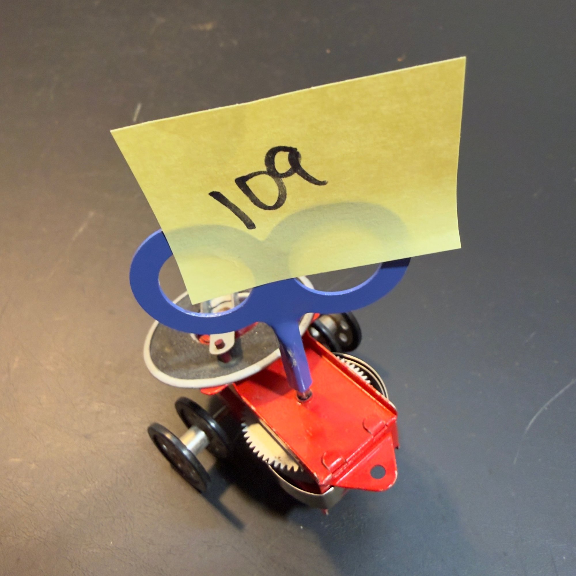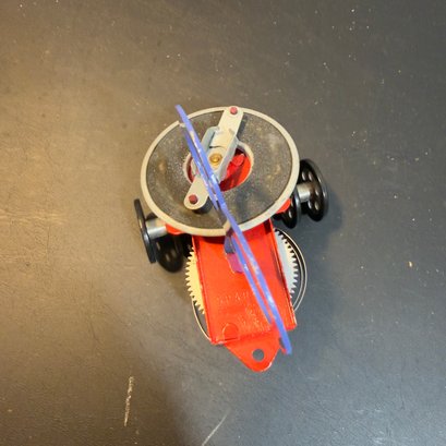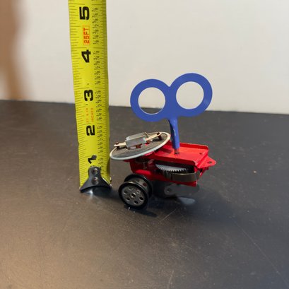 A small, red wind-up mechanism with a prominent blue key, designed to wobble or march around.