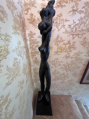 Striking large vintage modernist figural sculpture featuring an elongated abstract female nude form with expressive hand-sculpted texture and dramatic vertical lines. Mounted on a black pedestal plinth base, this piece has exceptional presence and would make a statement in any room.