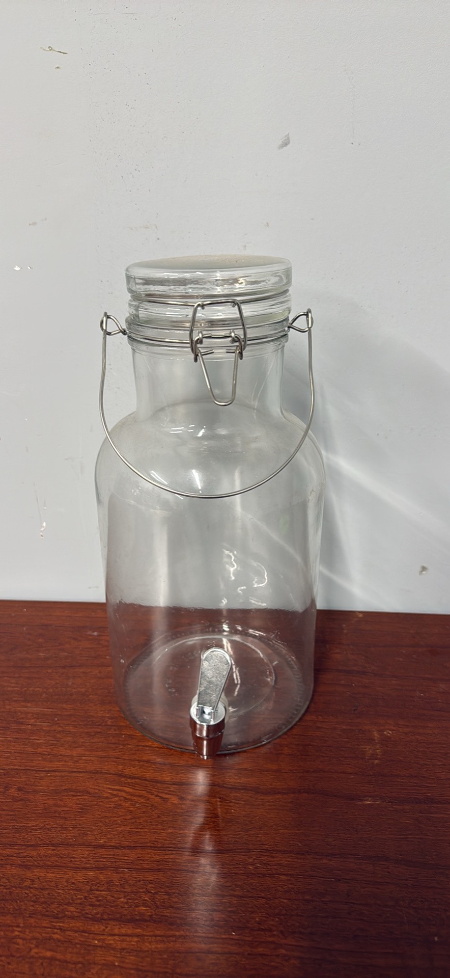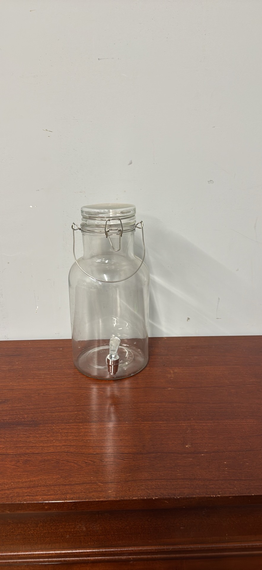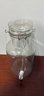 Clear glass drink dispenser. Has a cool canister style top with a metal clasp and handle. Comes with a metal spigot at the bottom. Great for parties or just everyday!