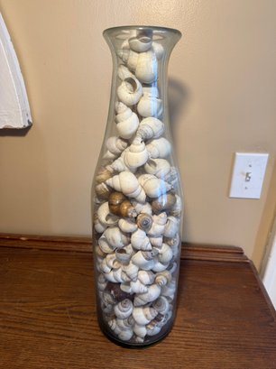 Description: This elegant, tall glass vase is filled with a variety of natural seashells, offering a charming coastal accent for any home decor. The shells exhibit a mix of soft cream, white, brown, and tan tones, with varying natural patterns and sizes, typically measuring an inch or smaller. The collection includes button-top Umbonium shells and potentially "shark eye" moon snail shells, known for their smooth appearance.