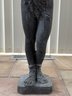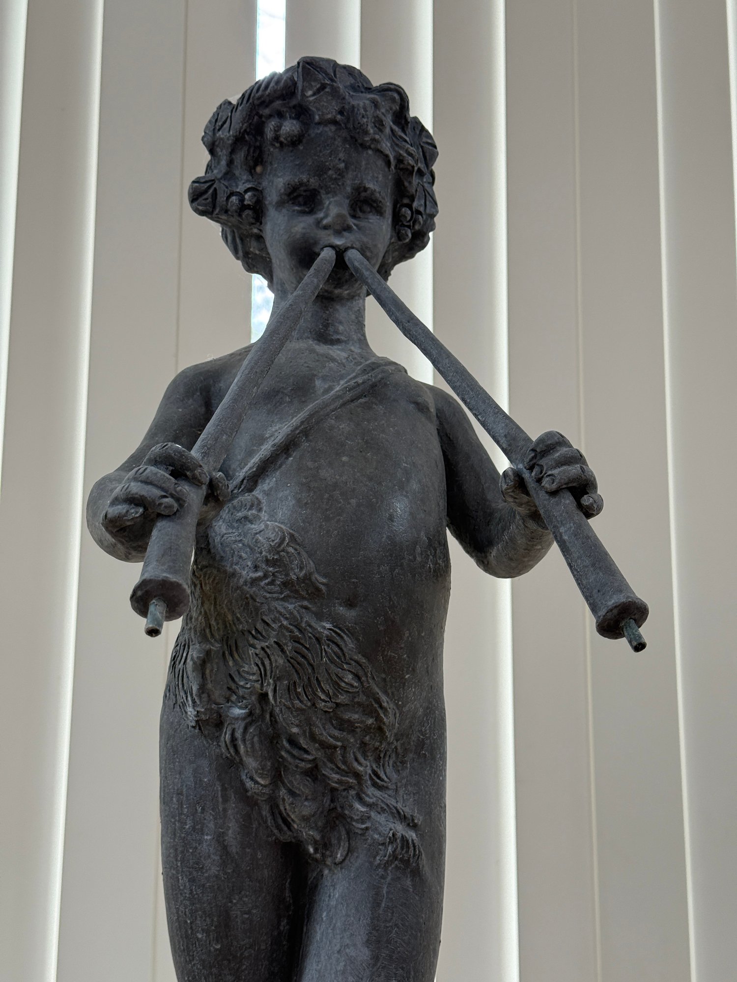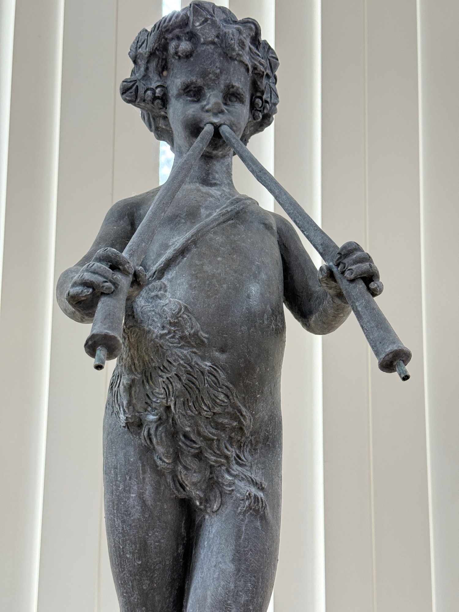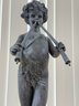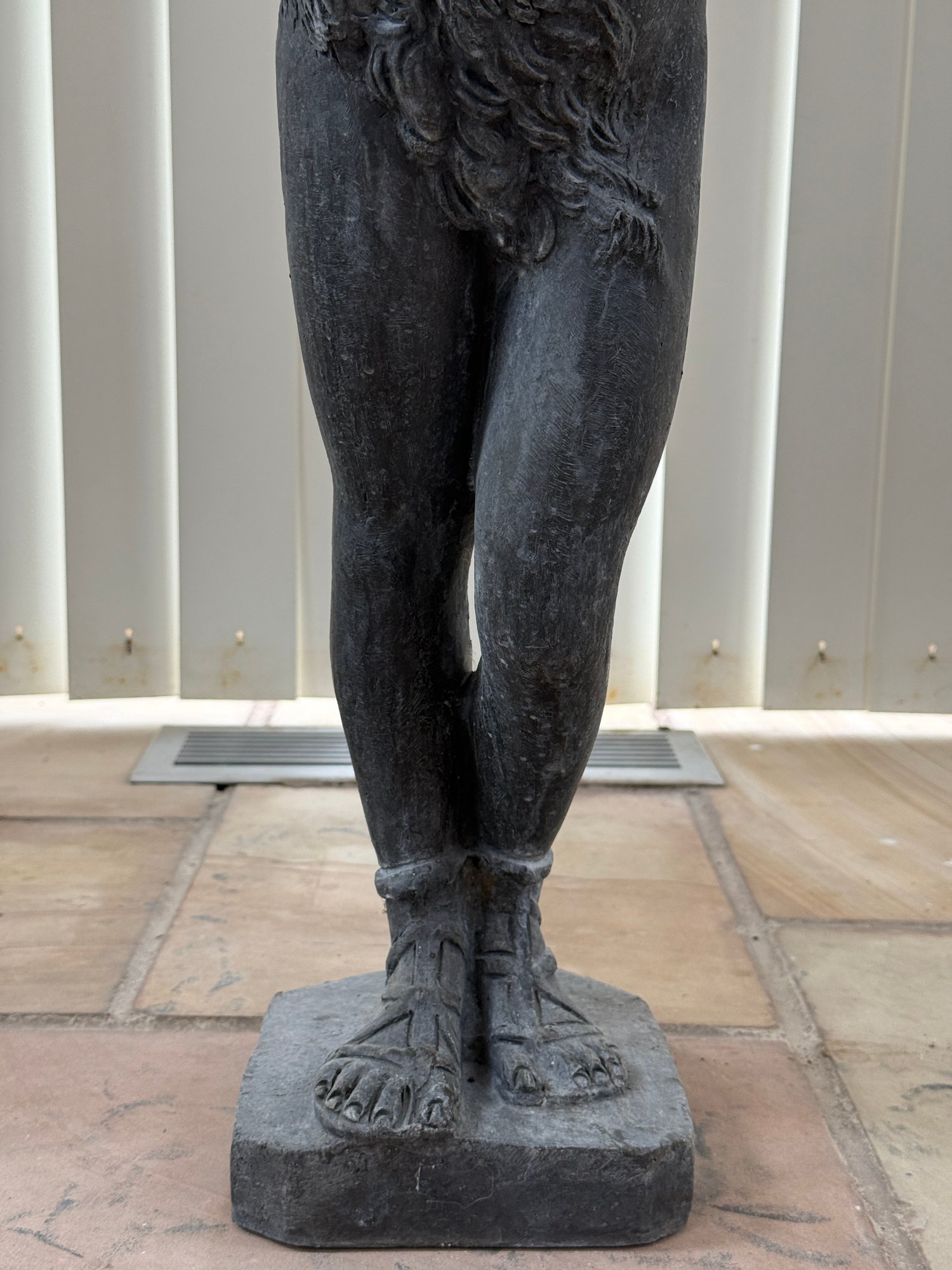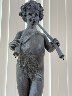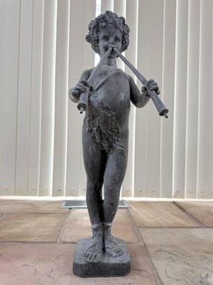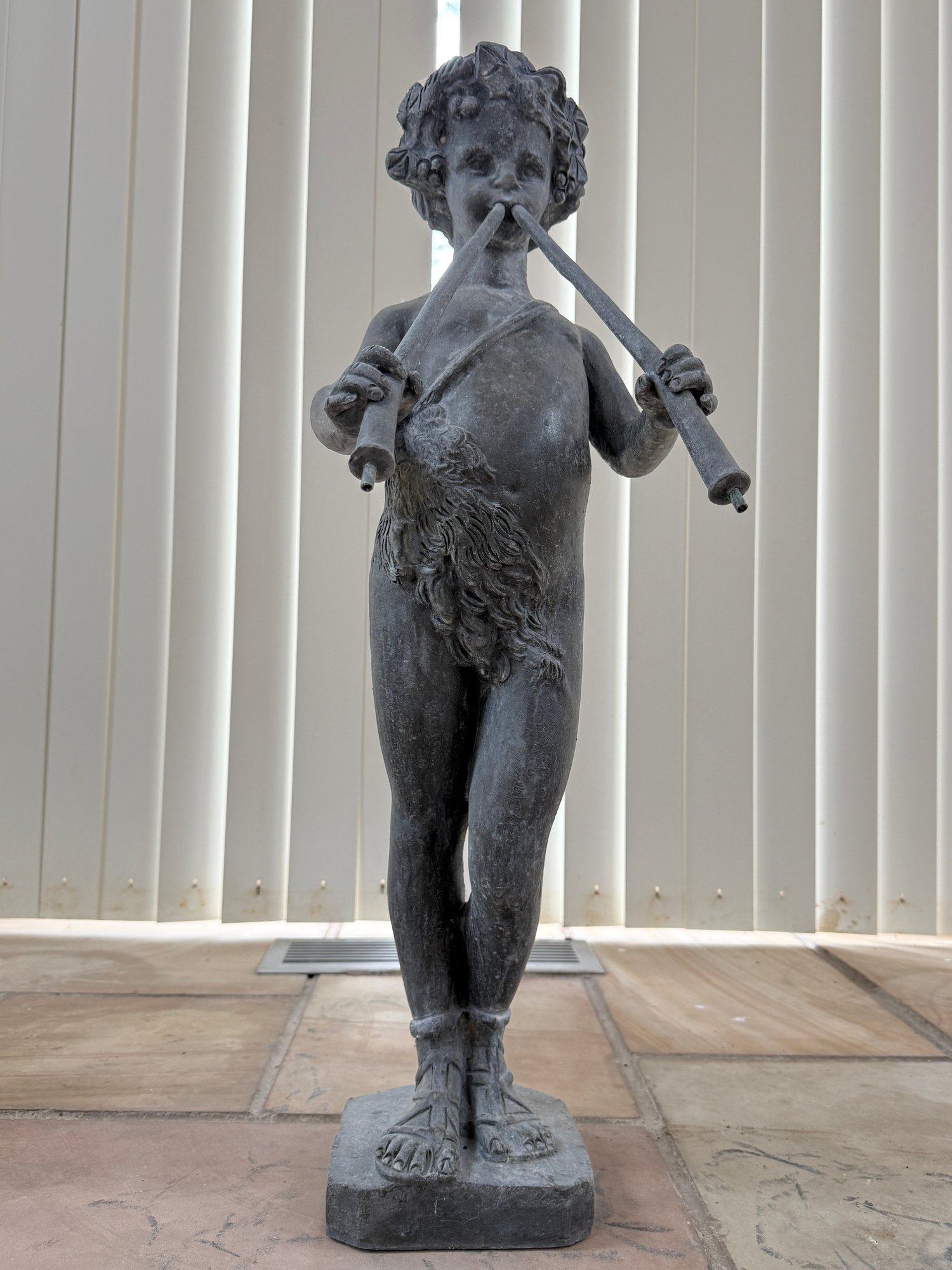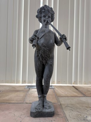 Vintage lead statue depicting a young boy, often identified as the mythological figure Pan, playing pipes.
