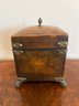 Wooden box with brass accents. Made of wood with a dark finish. Features brass corner brackets and decorative elements. Equipped with small feet made of metal. The lid has a decorative finial.