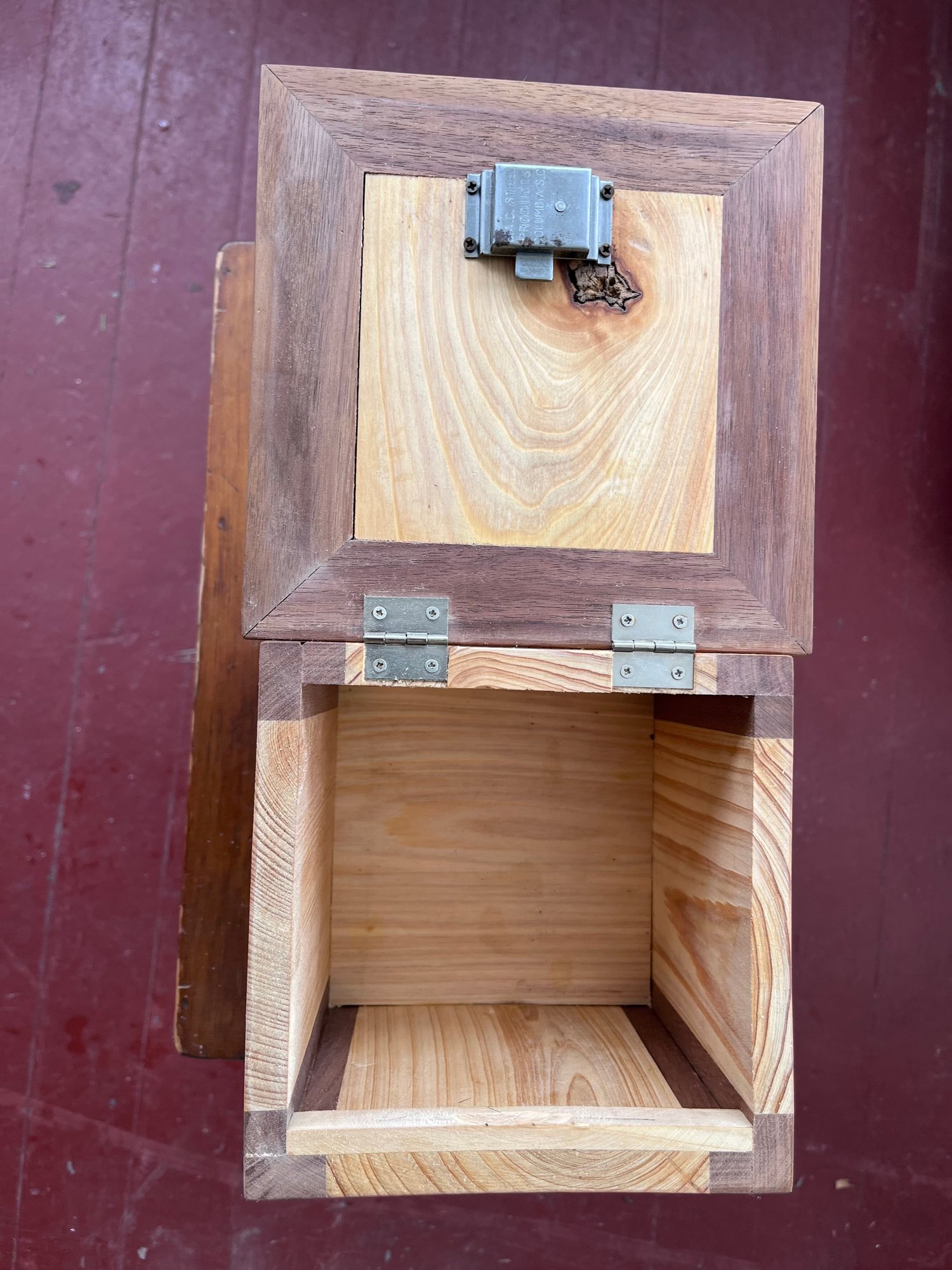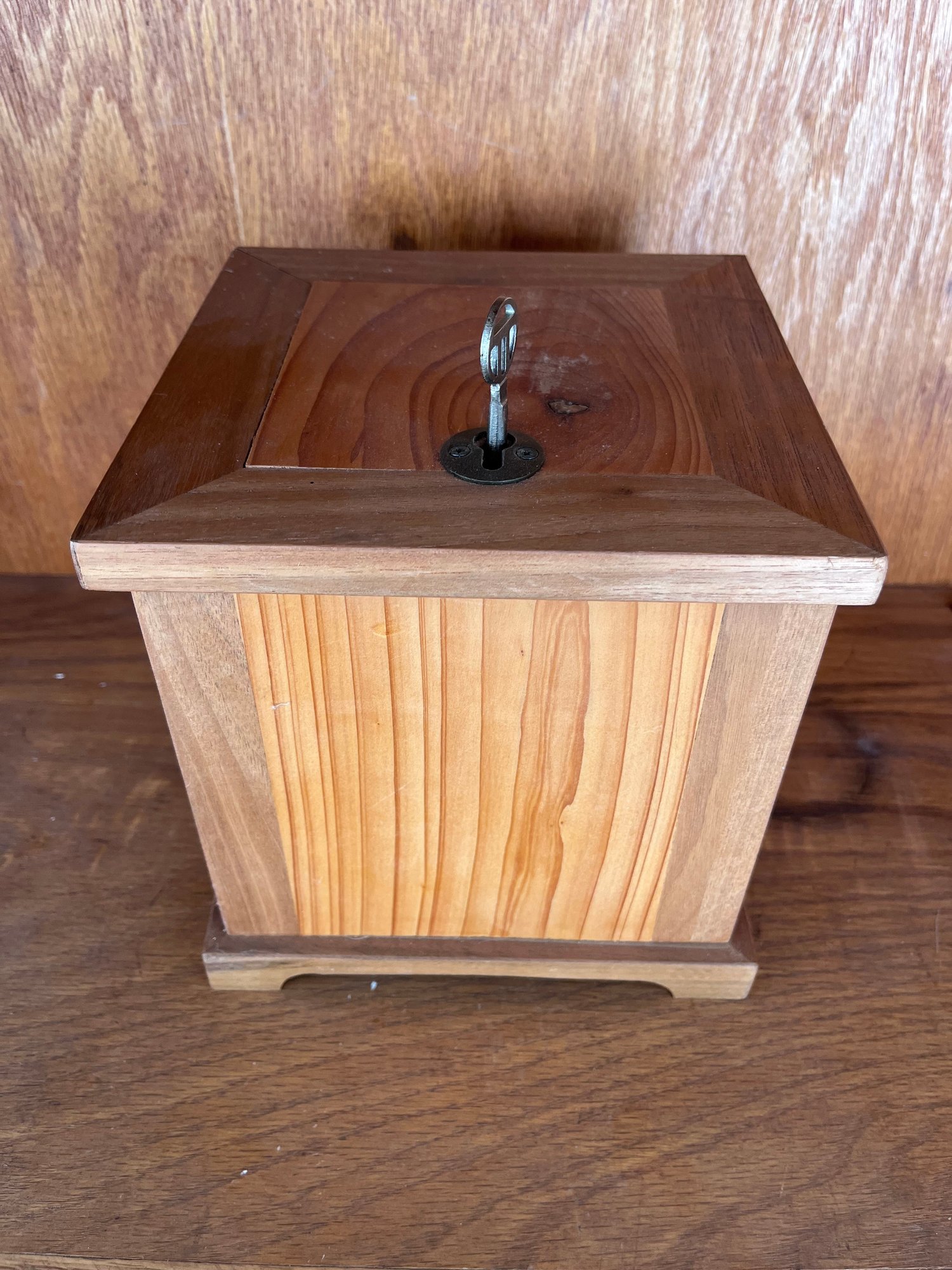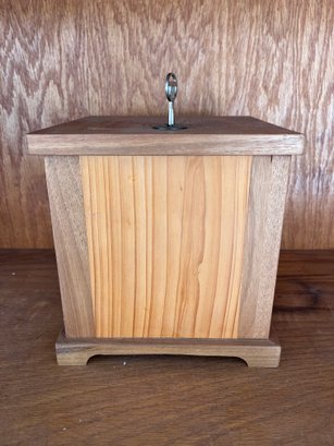 Box measures 7 inches across by 7 inches by 7 inches high. Locking mechanism works appropriately.