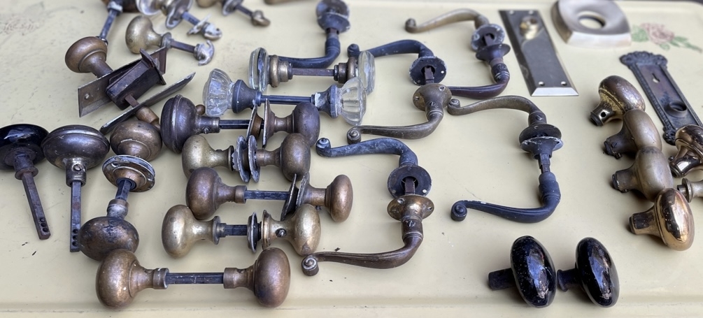 Nice sized lot of assorted brass, bronze and glass pull, handles & knobs. Great pieces to be used for their original purpose or can be used for up-cycle projects.