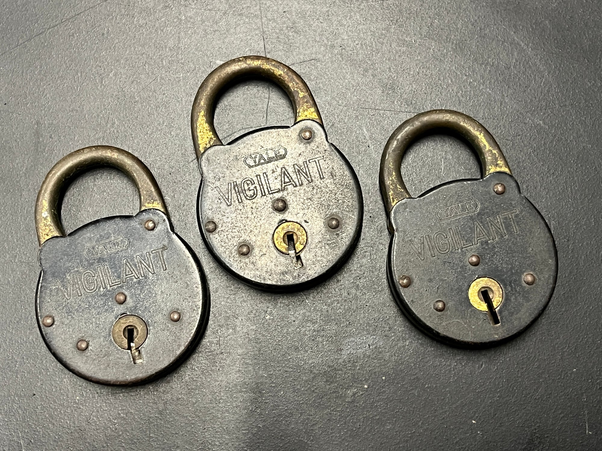 set of three vintage "YALE VIGILANT" 3 lever steel padlocks, each coming with a key. The padlocks are designed with three levers for security and are made of durable steel. This lot of padlocks is suitable for collectors or enthusiasts of vintage locks and keys, particularly those interested in the YALE brand. The inclusion of keys adds to the authenticity and usability of these padlocks.