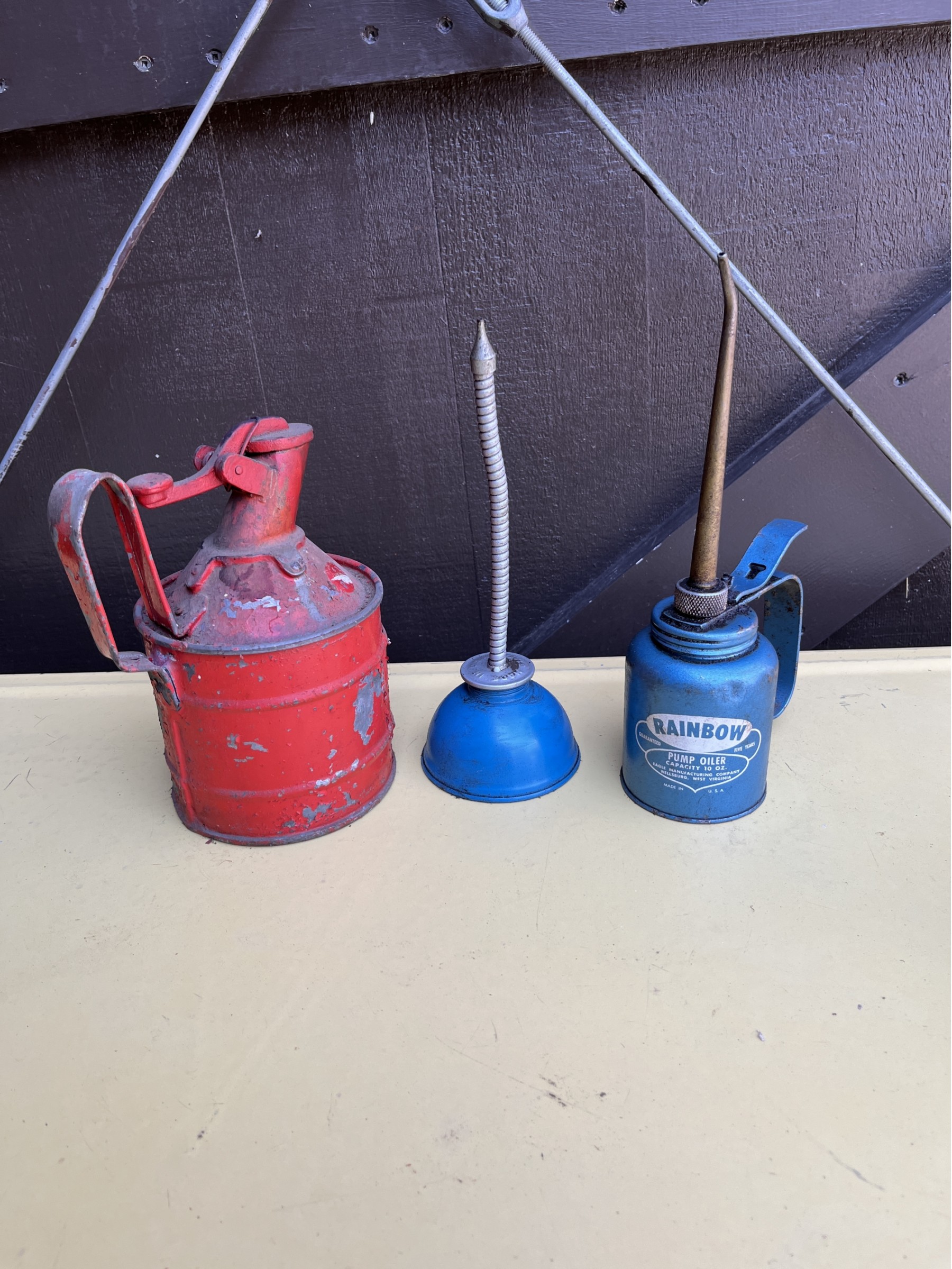 Red vintage quart oil can with distressed look. Blue vintage Rainbow oil pump container and vintage thump pump oil can.