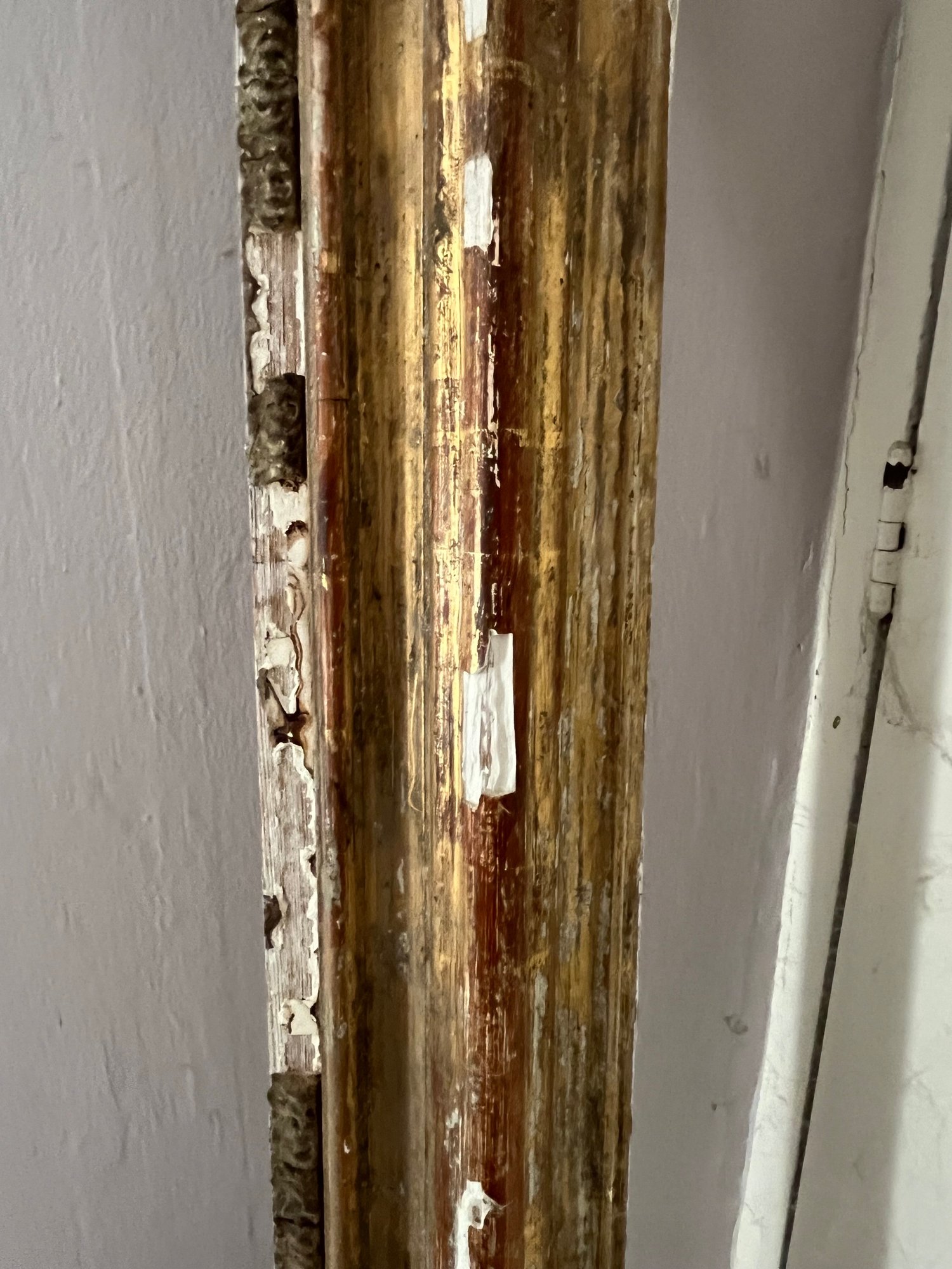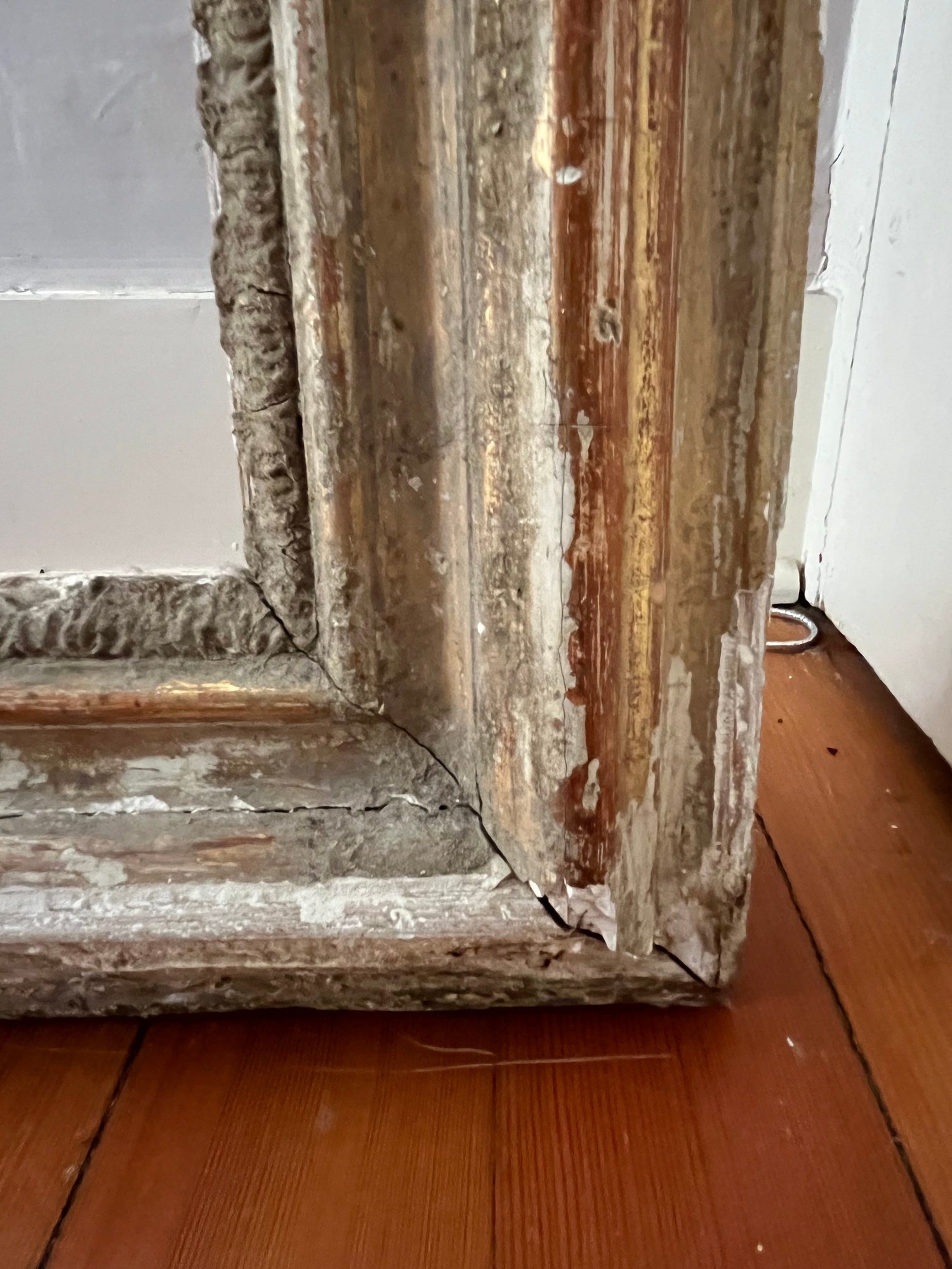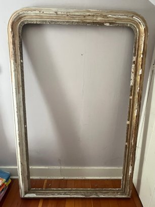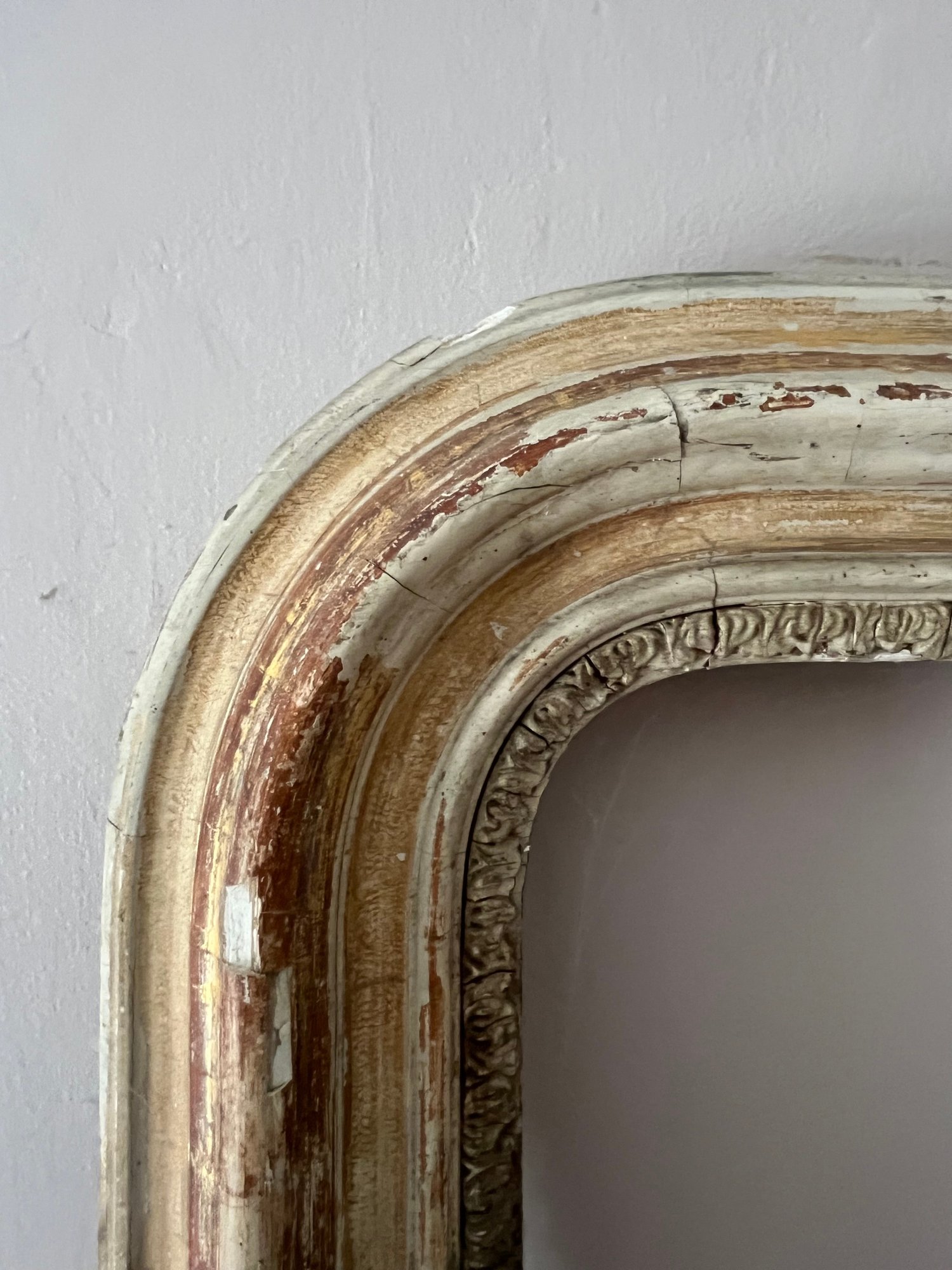 Finish: Frames are often gilded with gold or silver leaf over a gesso (plaster) and wood base. The finish on this one is heavily distressed, showing layers of white paint and gold gilt, with hints of the traditional red clay (known as "bole") peeking through where the gilding has worn away. This patina is often a sign of an authentic antique piece.