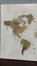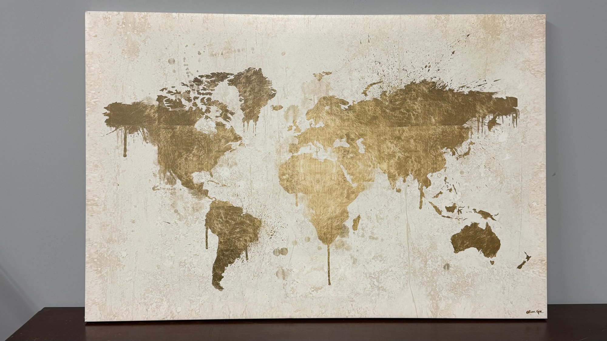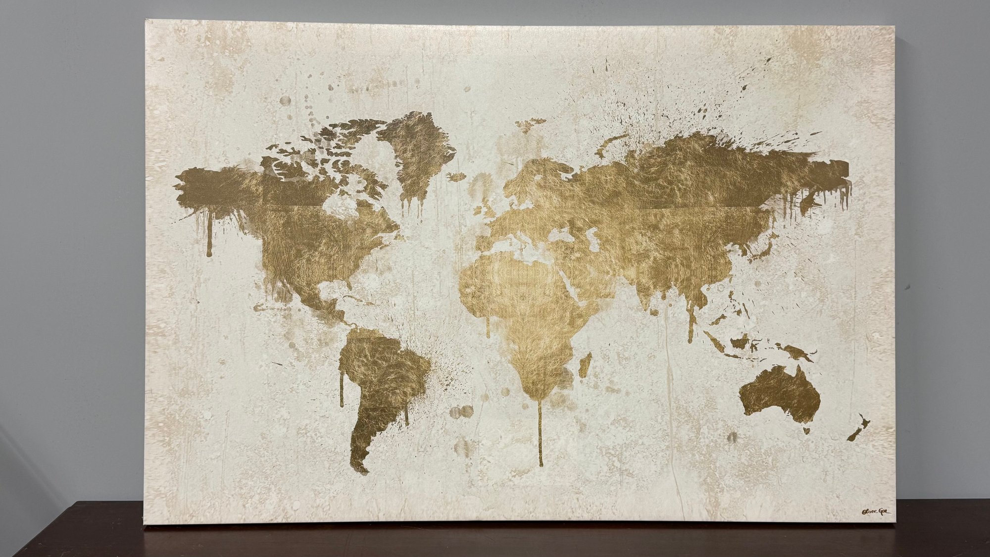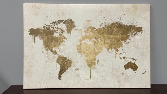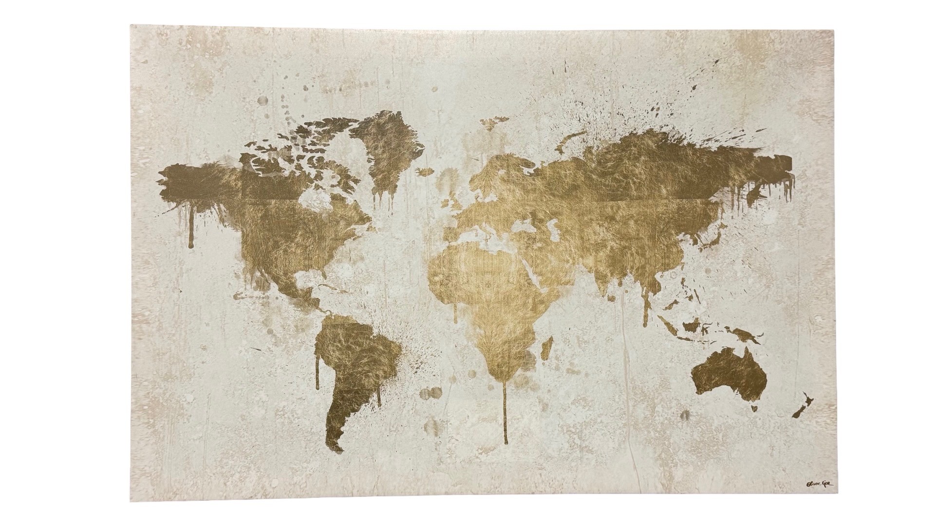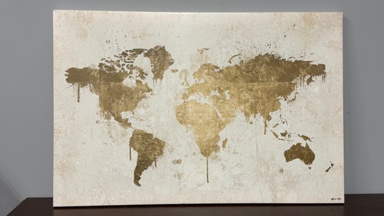 Art piece is titled "Mapamundi White Gold" and is part of the Maps and Flags Wall Art collection from The Oliver Gal Artist Co.. It is a modern-style world map designed with a metallic gold drip effect on a cream-white background, often printed on gallery-wrapped canvas.