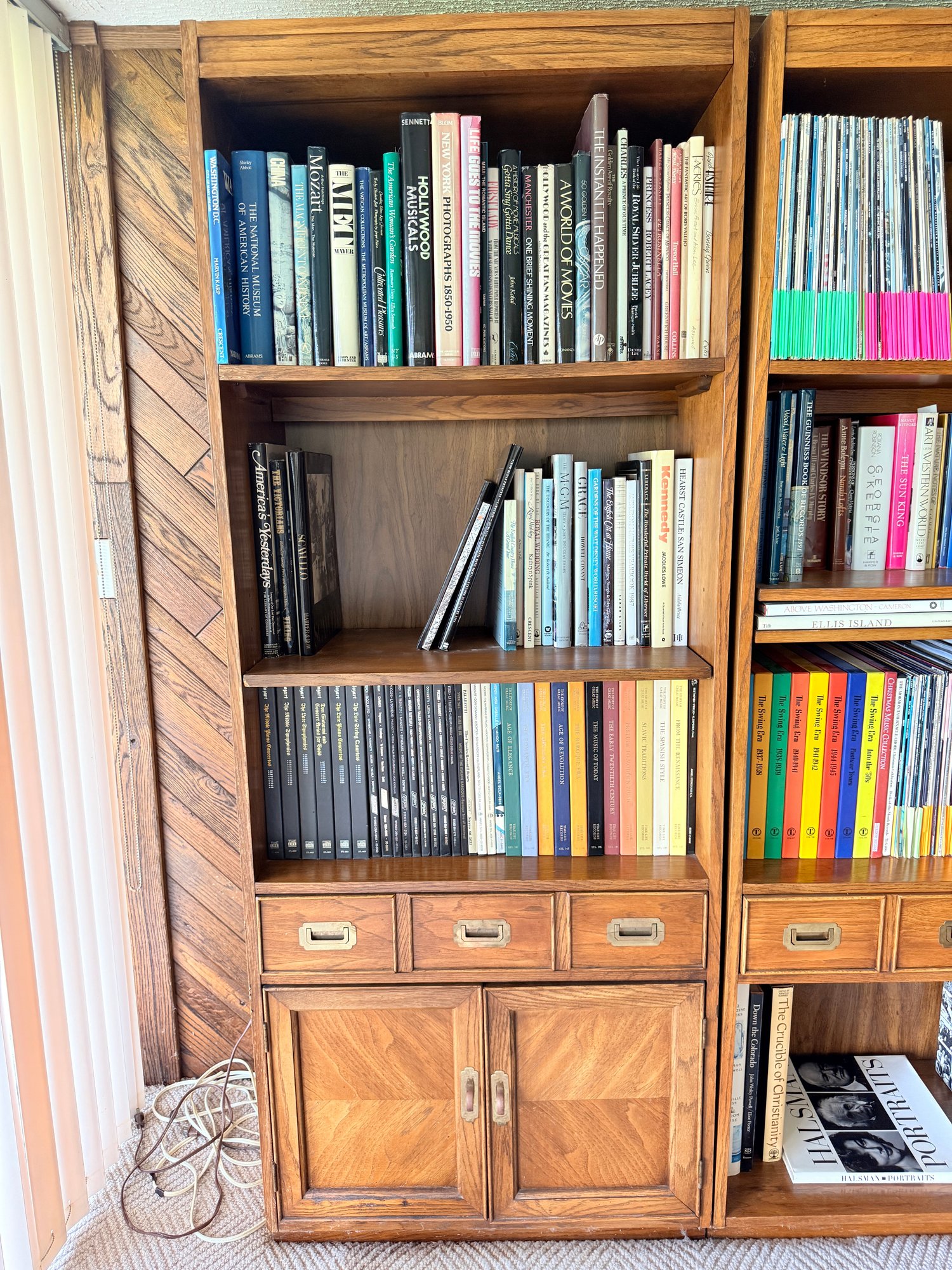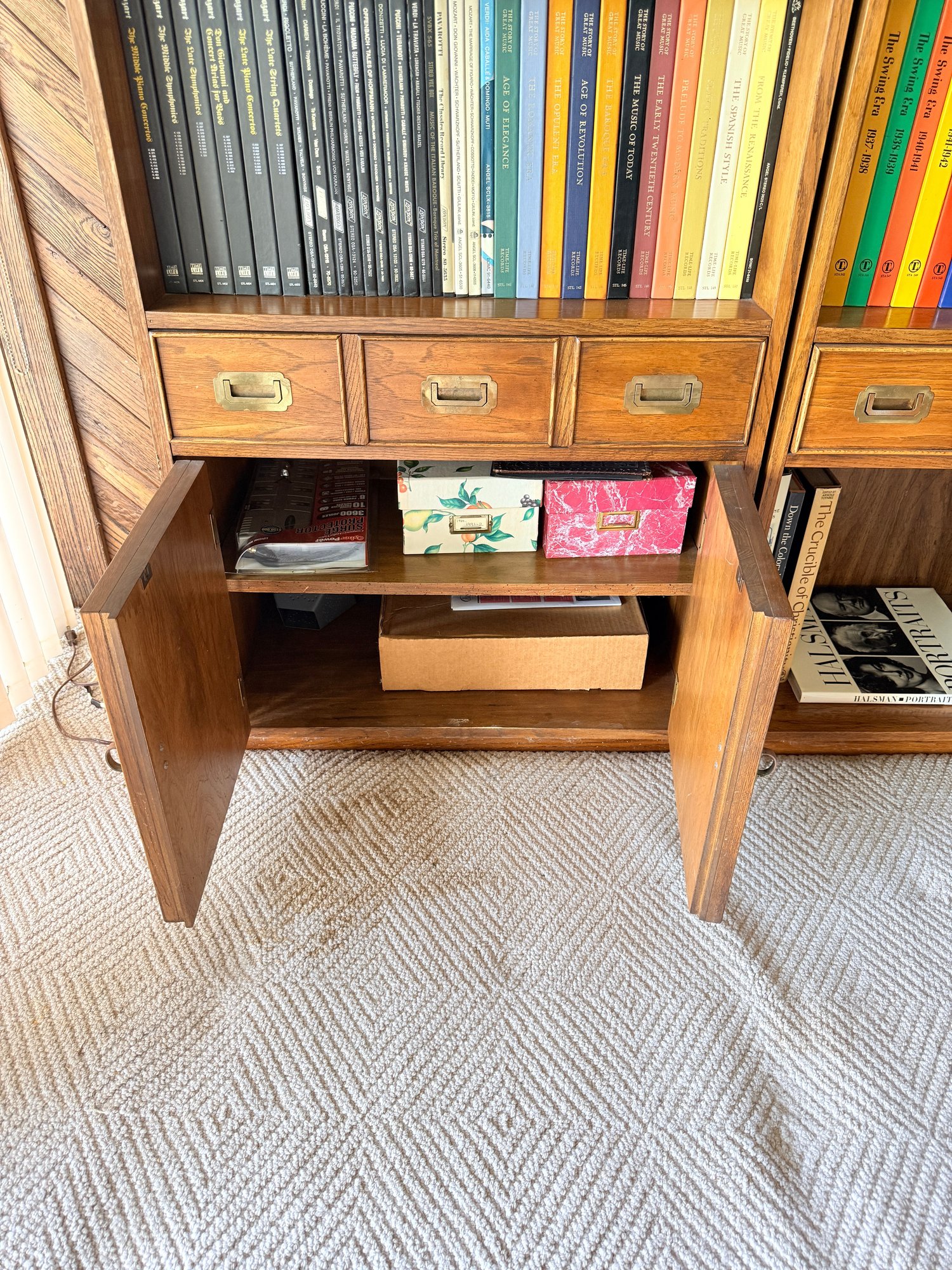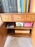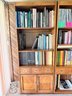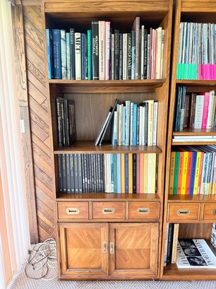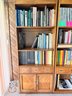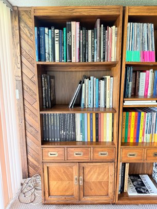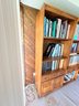 Functional mid-century modern bookshelf includes three shelves, one drawer in one cabinet.