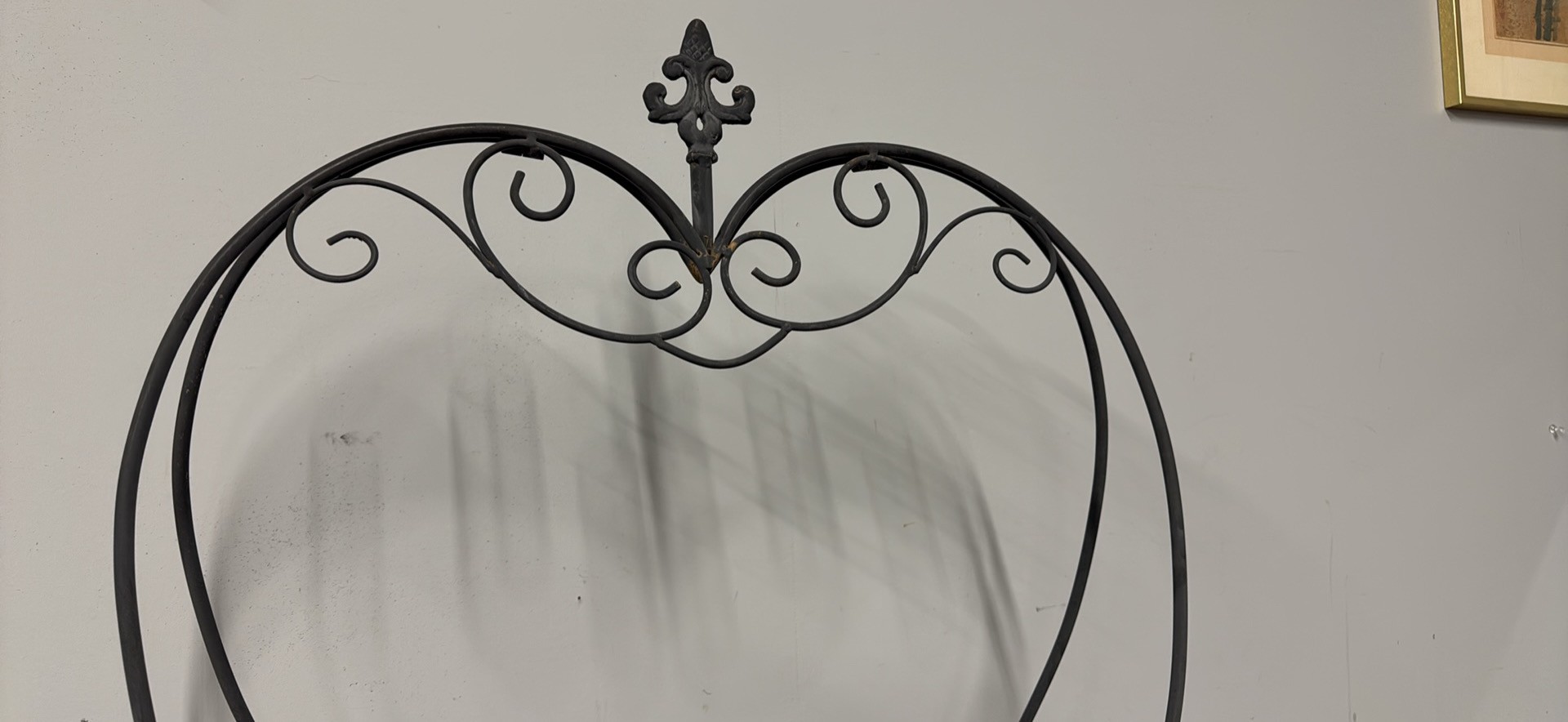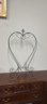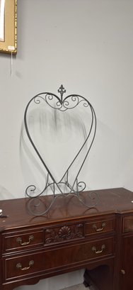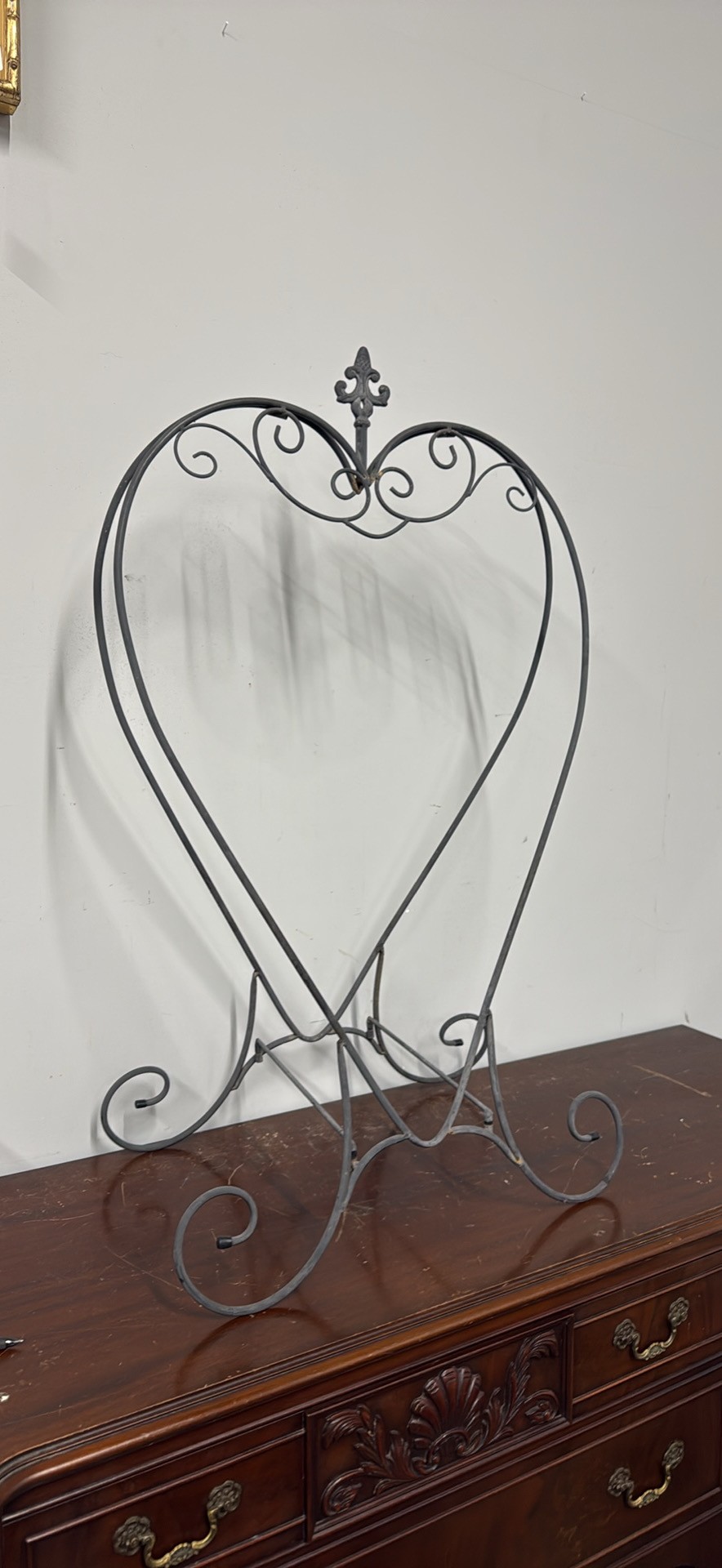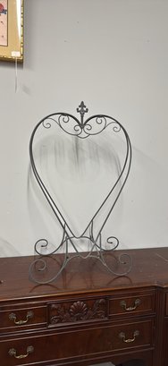 Decorative metal stand. Has a pretty heart shape with cool scroll details and a fleur-de-lis accent on top.