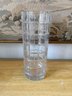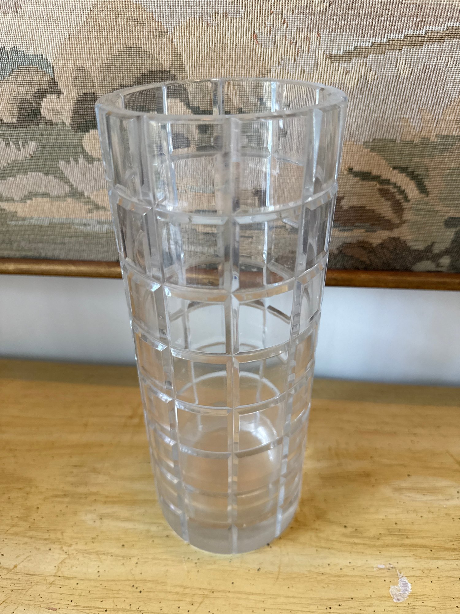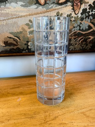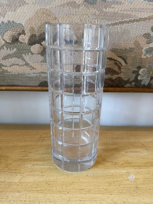 Feature a distinctive geometric checkerboard or tartan plaid pattern cut into the clear crystal.
