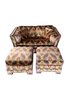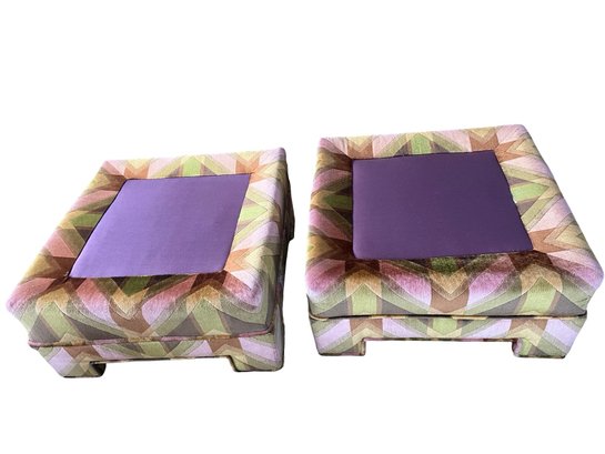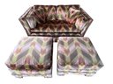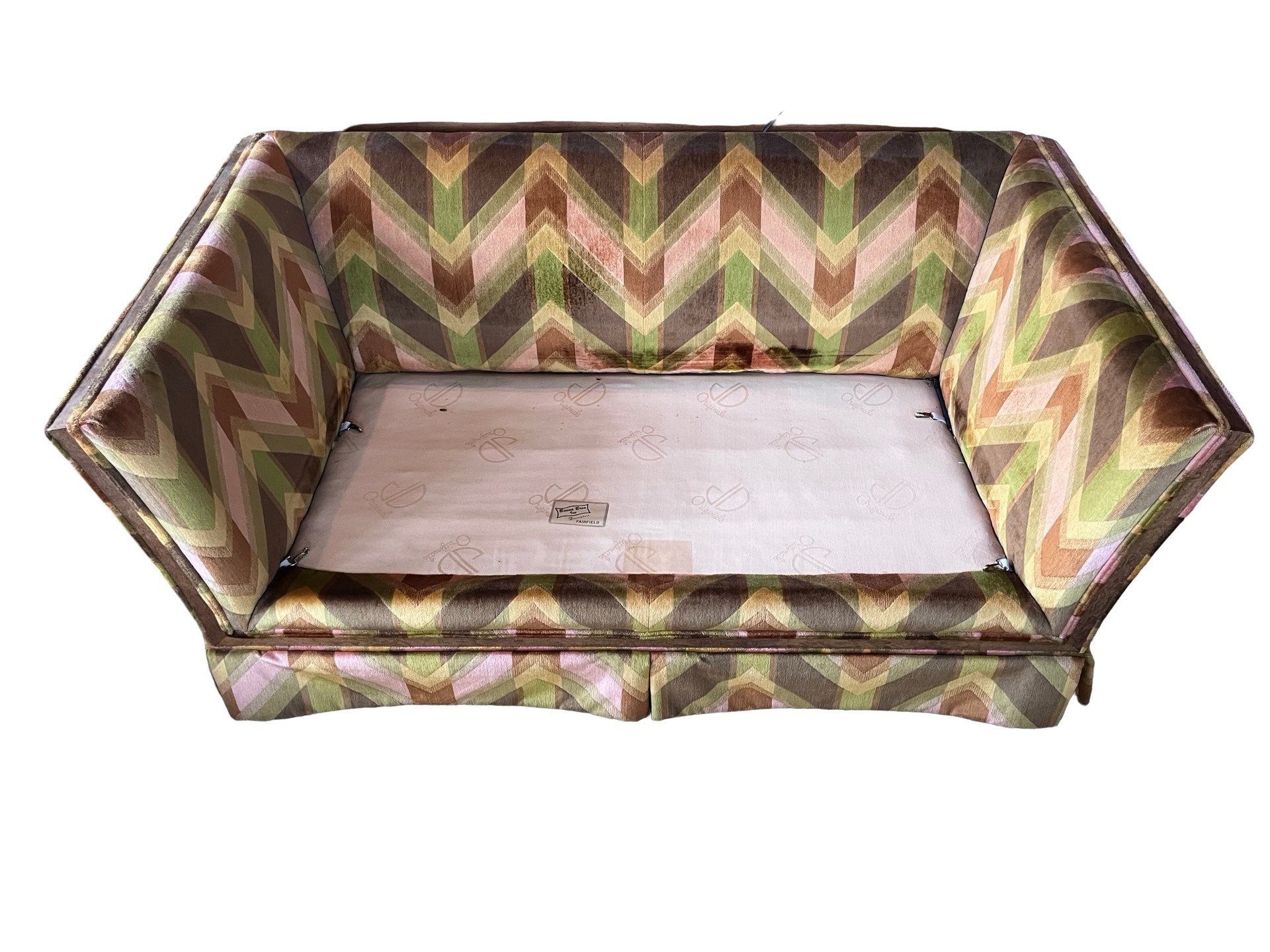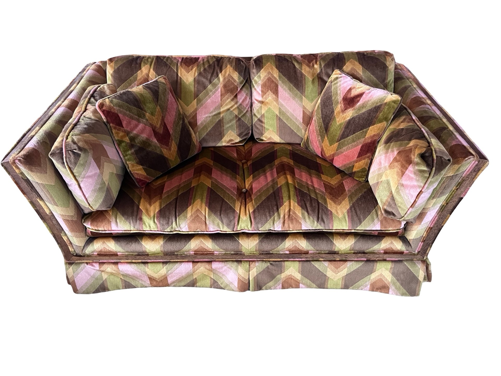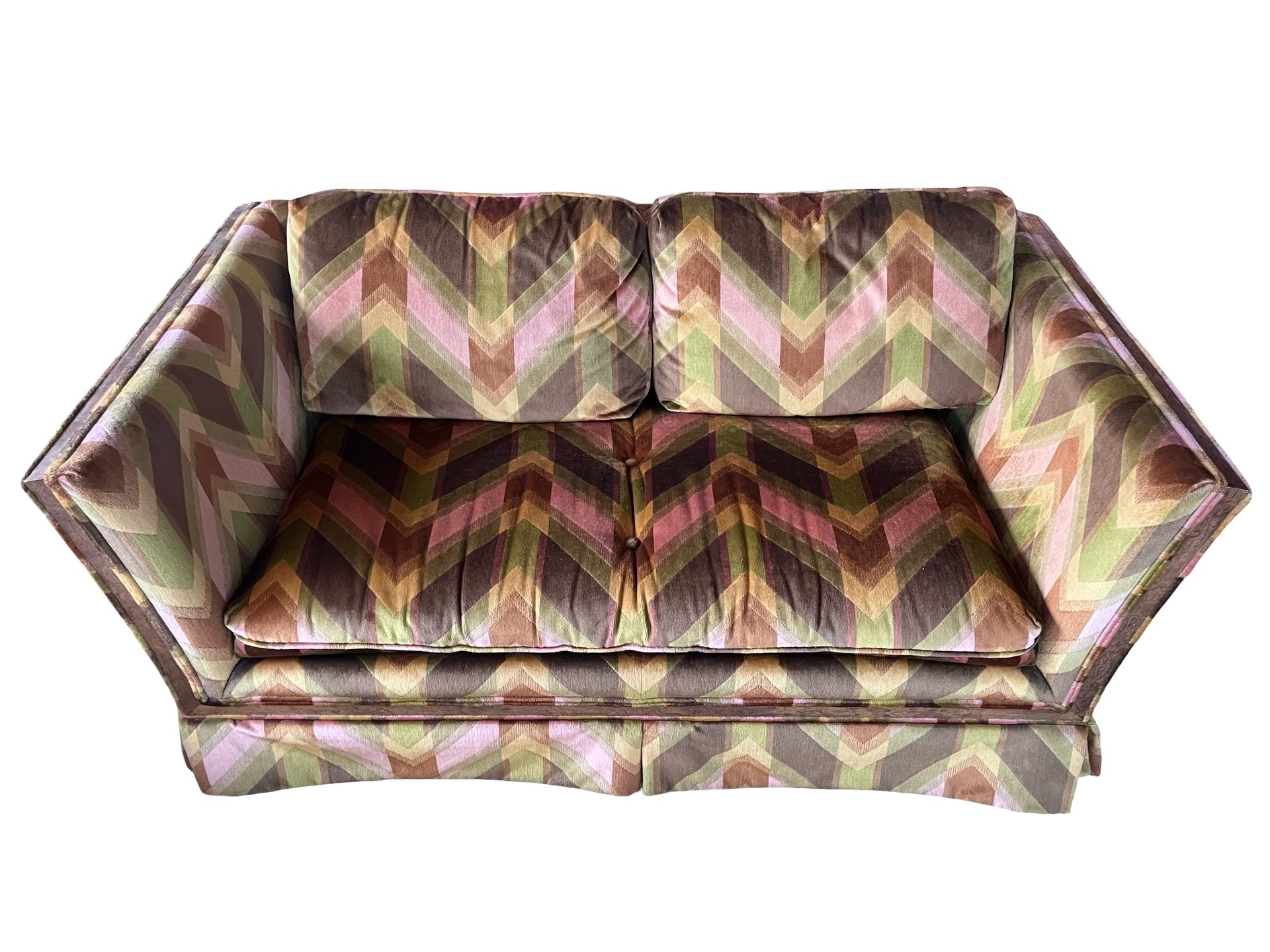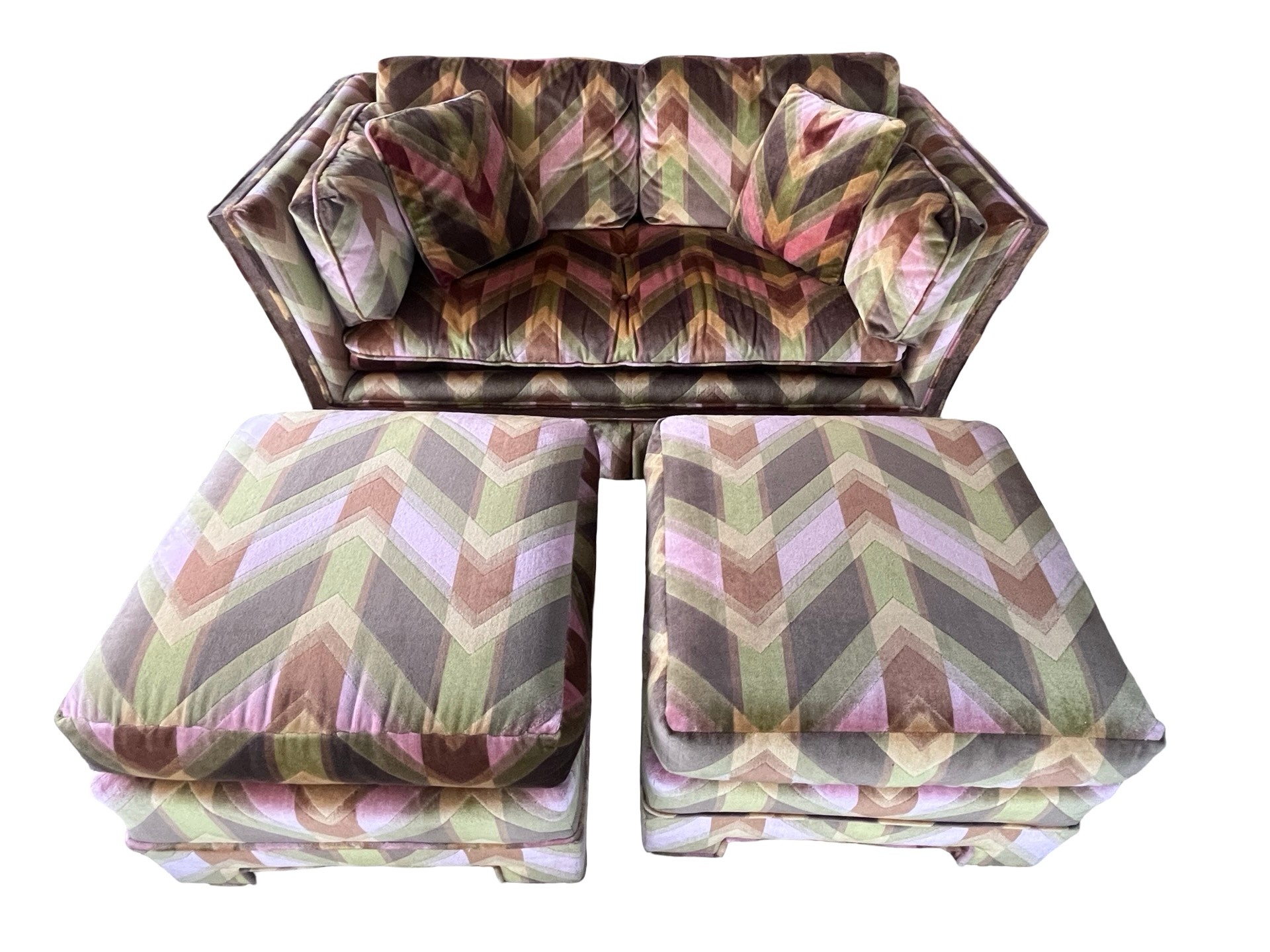 Vintage mid-century modern (MCM) tuxedo loveseat and ottoman set, often attributed to the style of designer Milo Baughman. This piece is characterized by its bold, 1970s-era geometric chevron or zig-zag pattern in shades of green, peach, pink, and brown velvet.