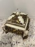 Old World-style trinket box with a gold finish and decorative elements. Plaster like material box is 8 inches square and 8 inches high.