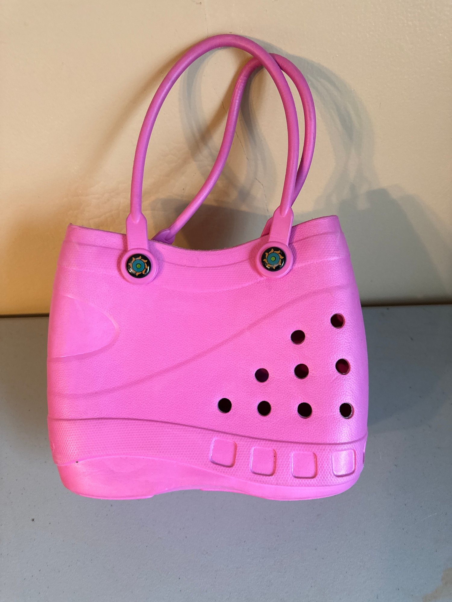Pink rubber bag is 11 inches wide and 9 1/2 inches tall.