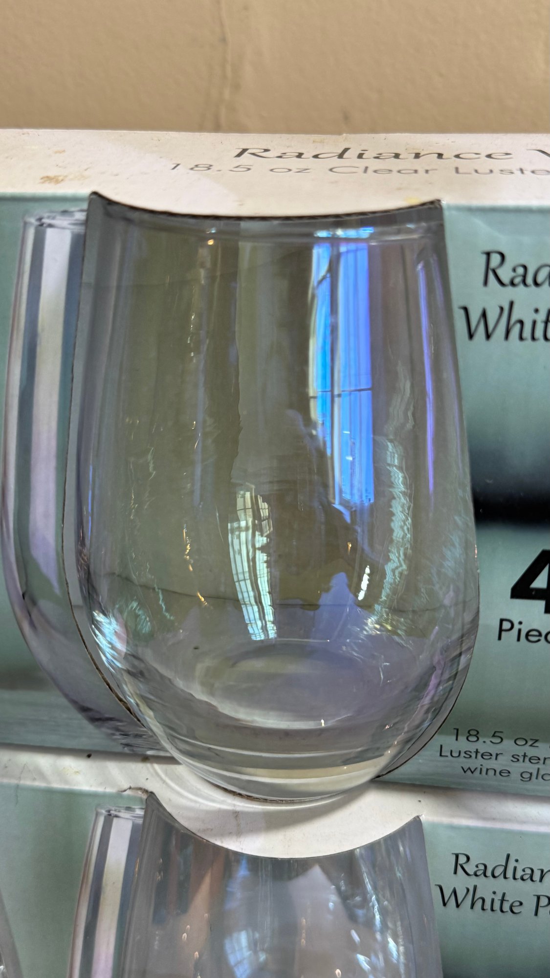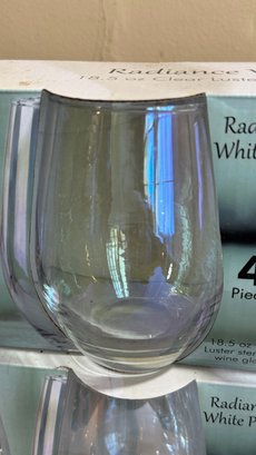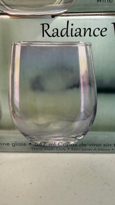 These 18.5 oz glasses feature a clear body with an iridescent, pearl luster finish that reflects rainbow colors when they catch the light. They are designed for casual entertaining and are versatile enough for wine, juice, or other beverages.