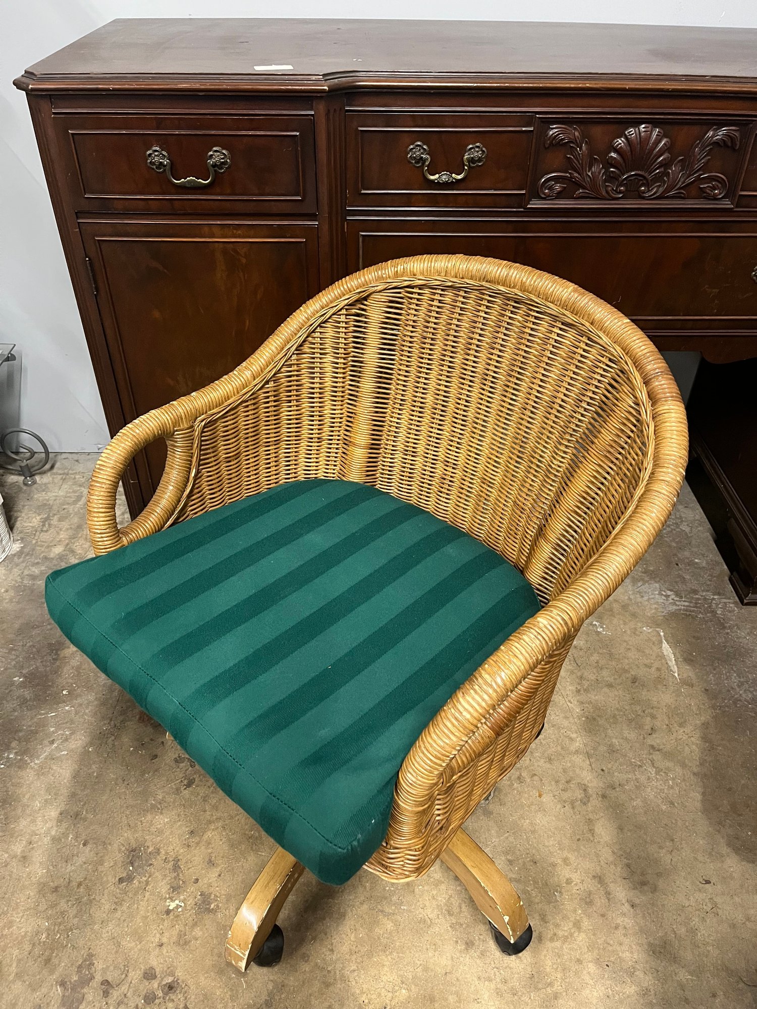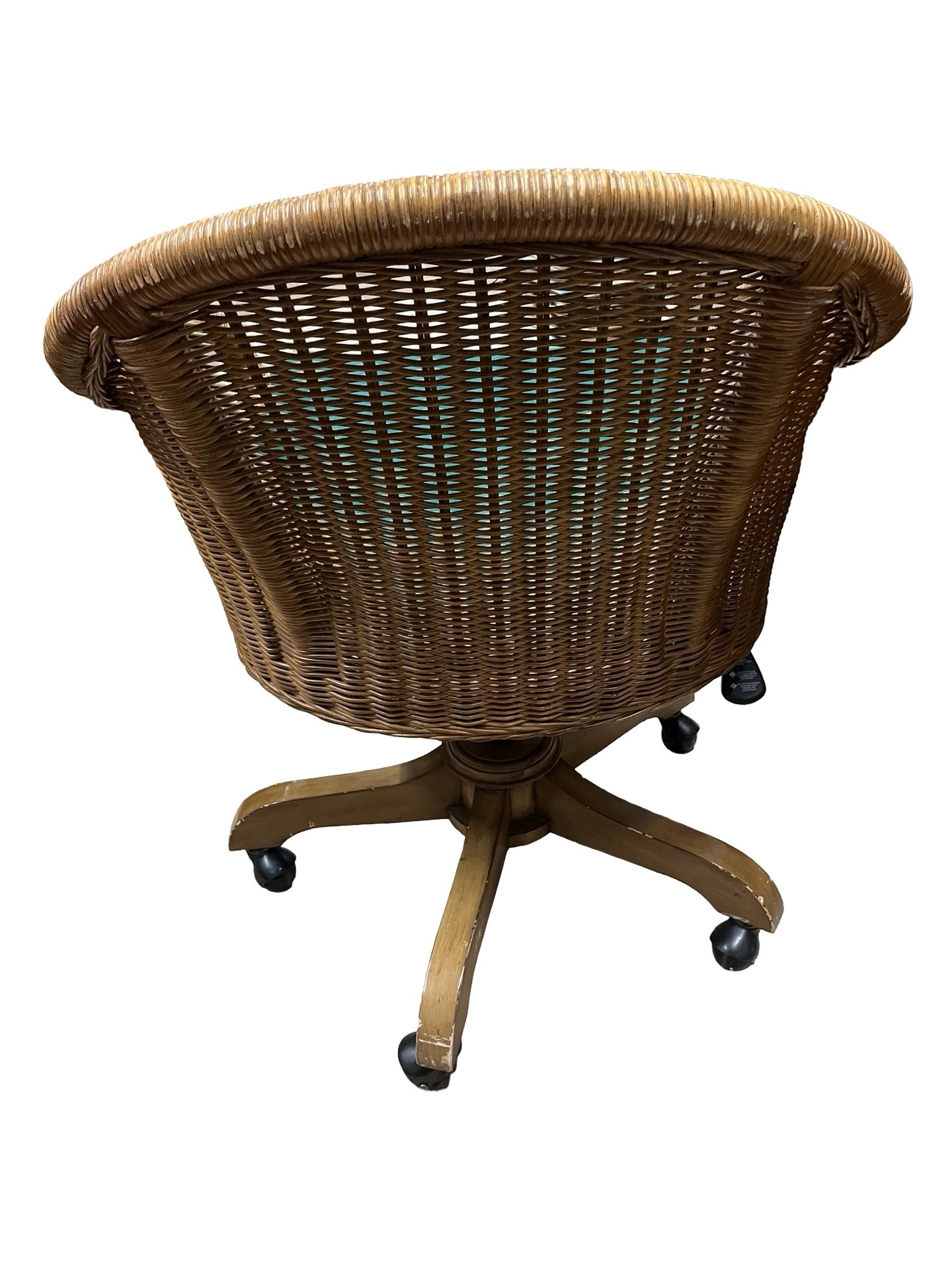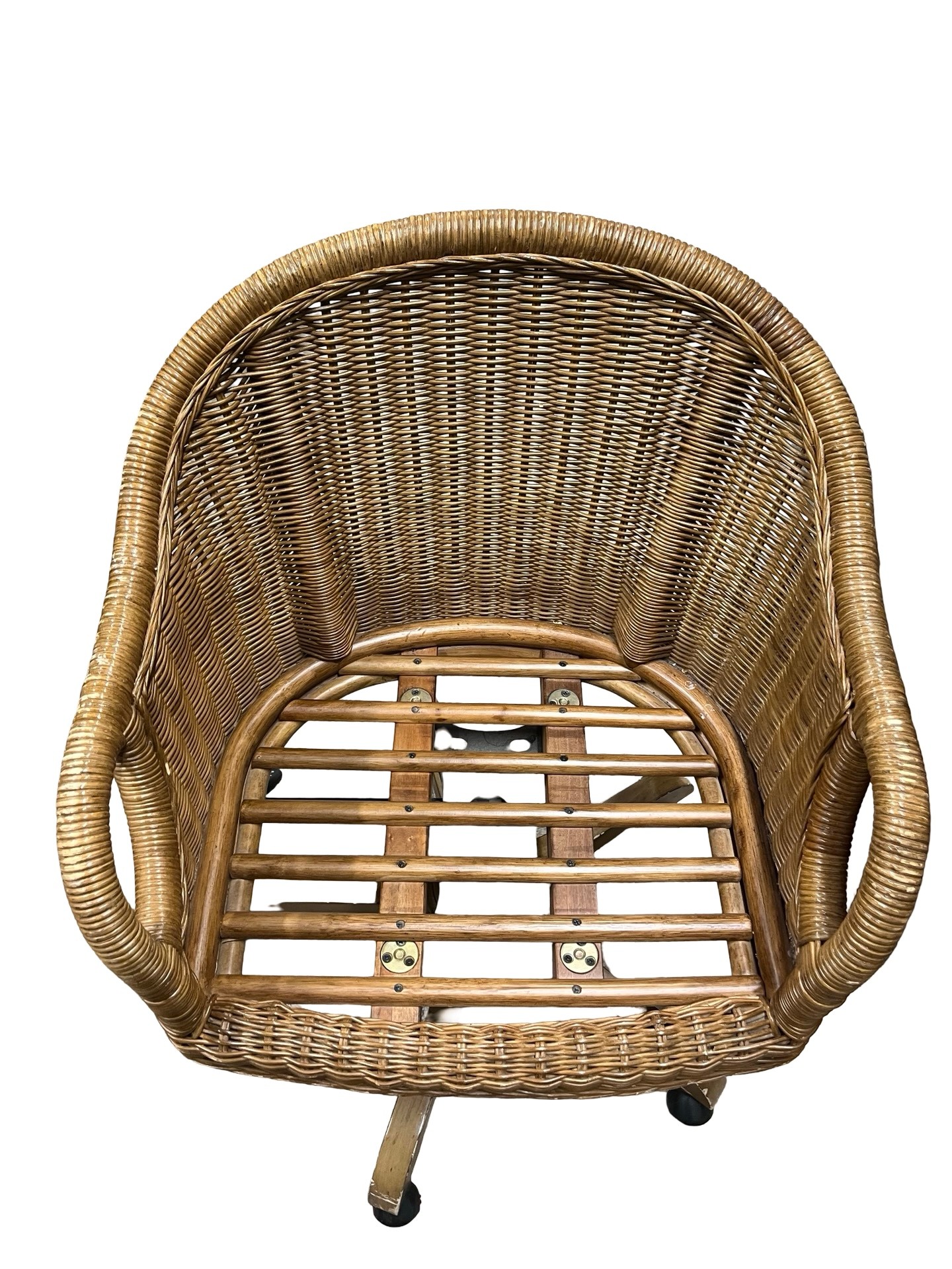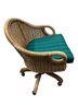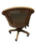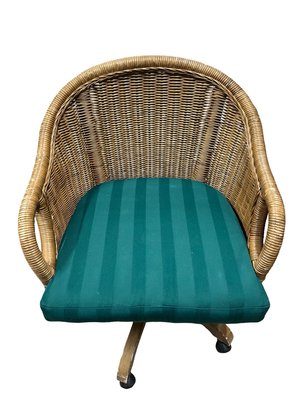 Rattan Swivel Desk Chair. It features a classic woven rattan or wicker construction with a curved back and supportive armrests, paired with a swivel base on casters for easy movement.