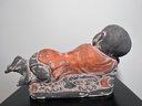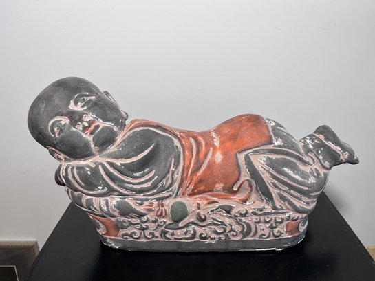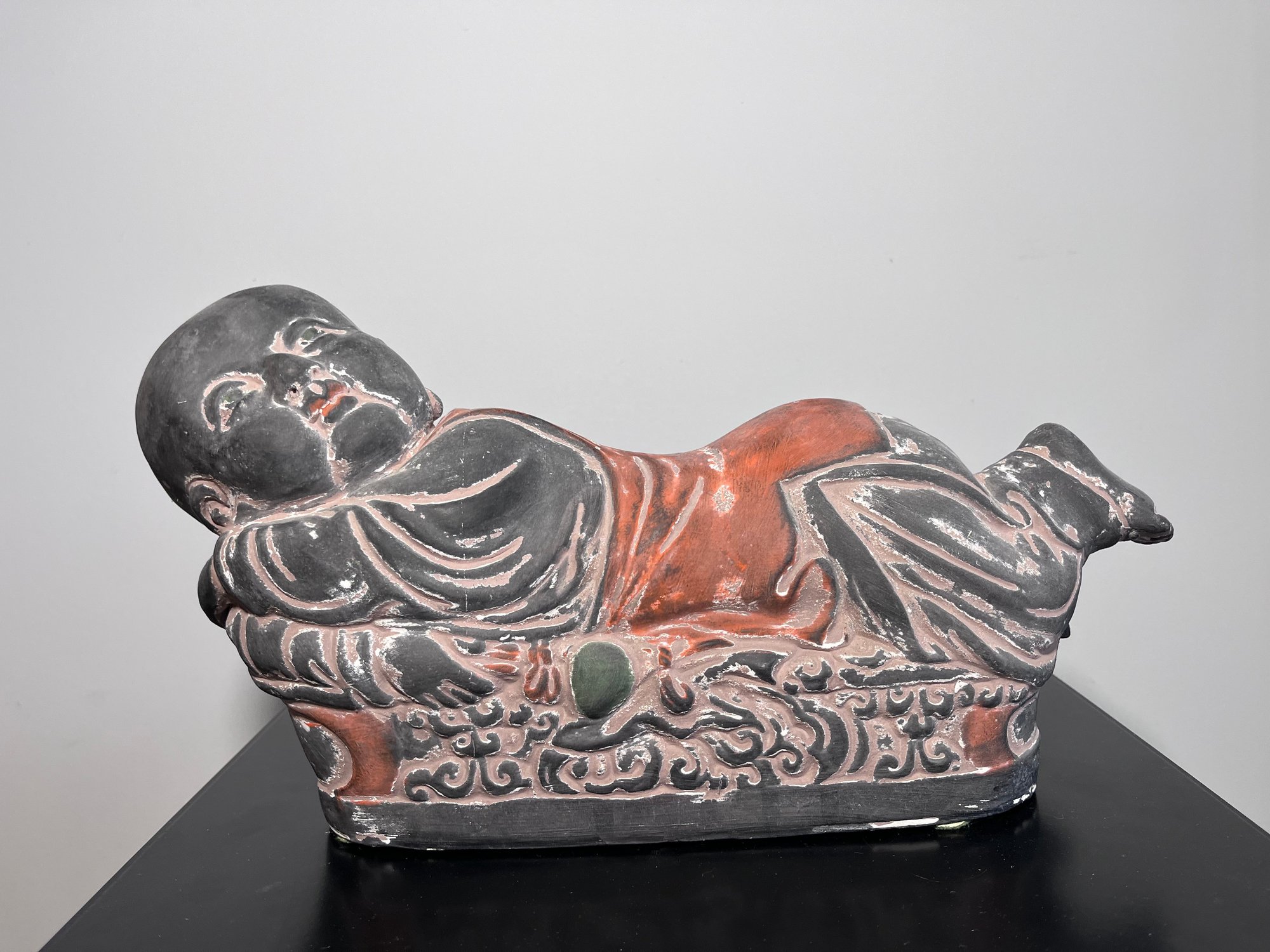 Reclining Chinese figure, likely representing a Buddha or a monk in a decorative style similar to traditional Chinese Buddhist art.