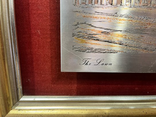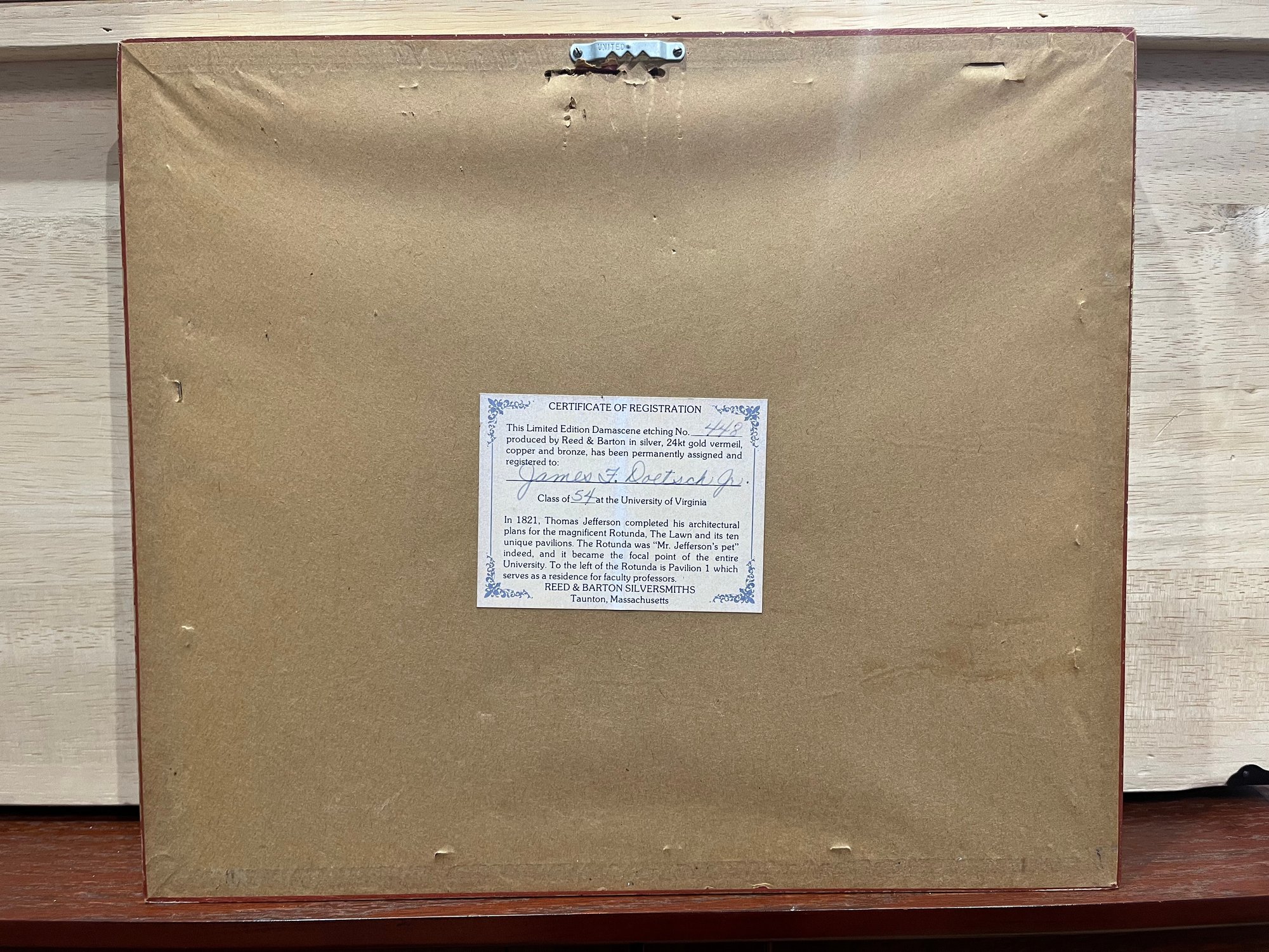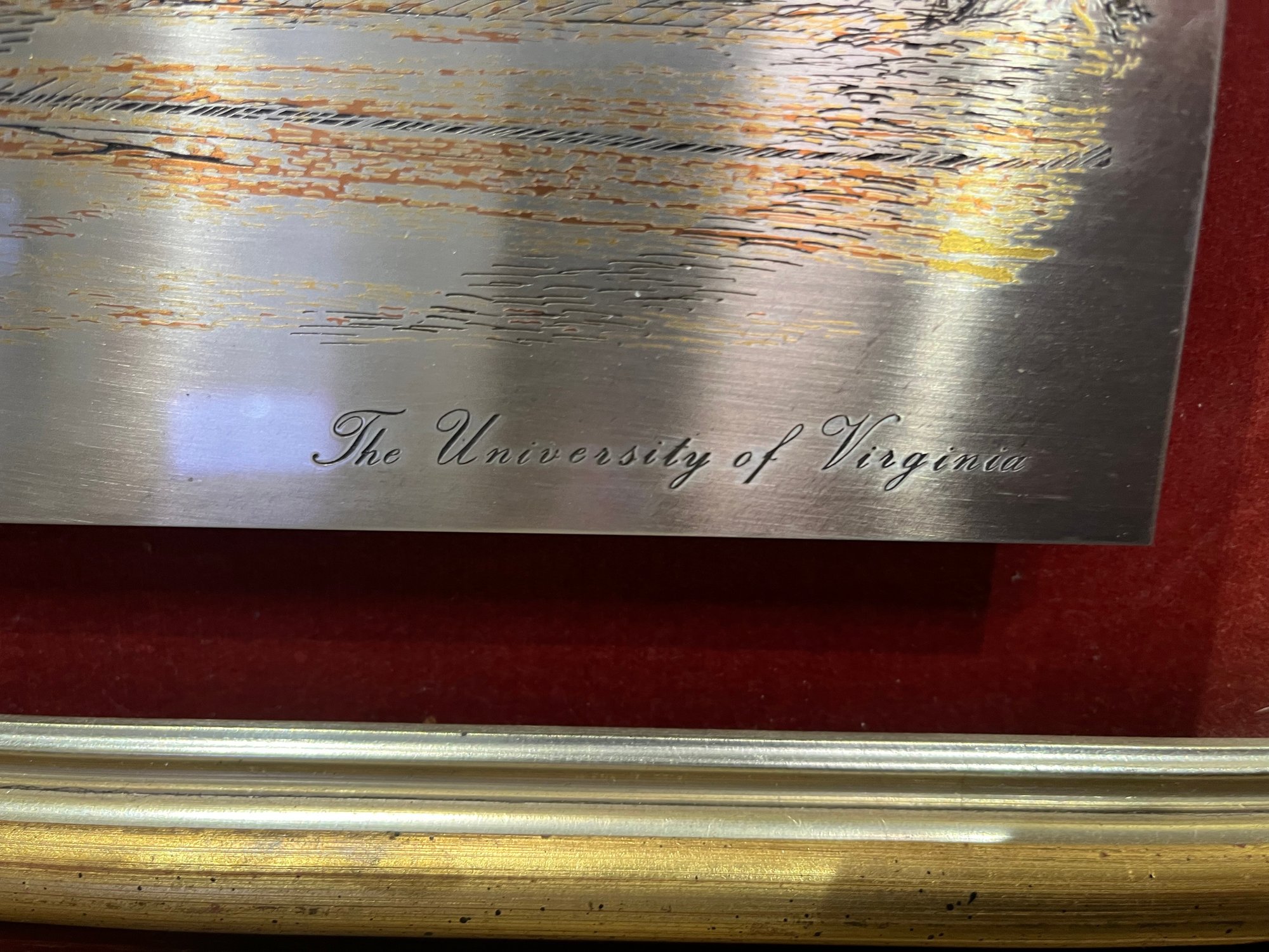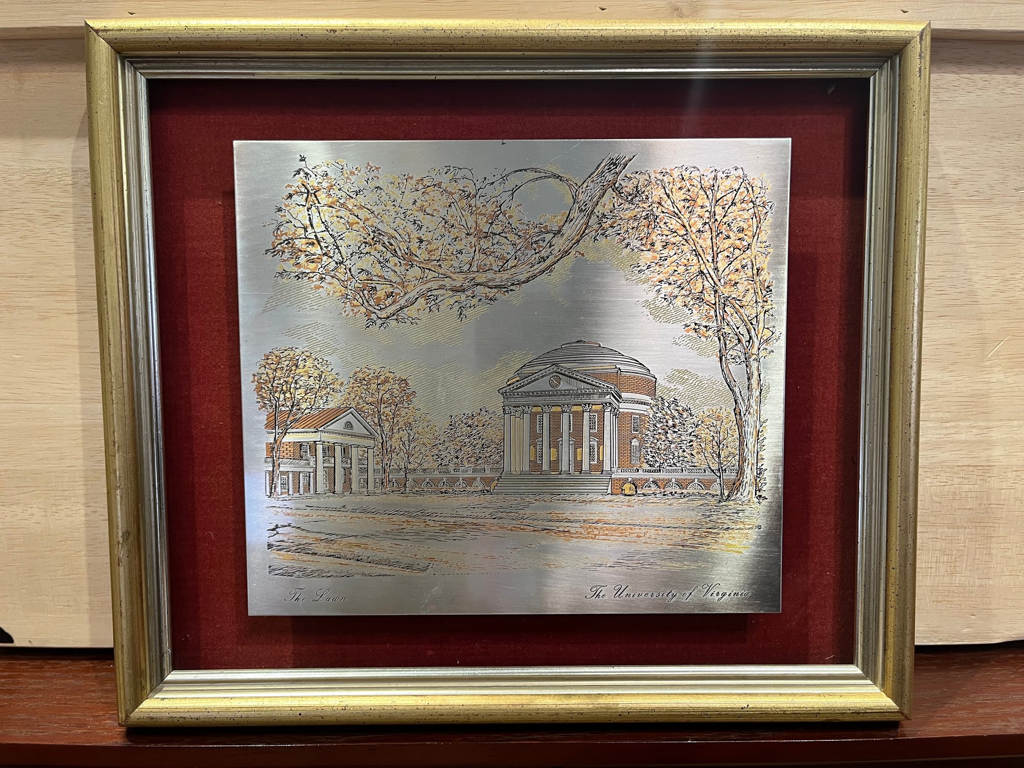 The Reed & Barton Damascene Etching featuring the University of Virginia's The Lawn is a collectible item that showcases the rich history and architectural beauty of the prestigious college. The intricate design of the etching captures the essence of the university, making it a unique and valuable piece for collectors of historical memorabilia. This product serves as a reminder of the legacy of the University of Virginia and its iconic landmarks, making it a prized possession for those passionate about teaching and education.