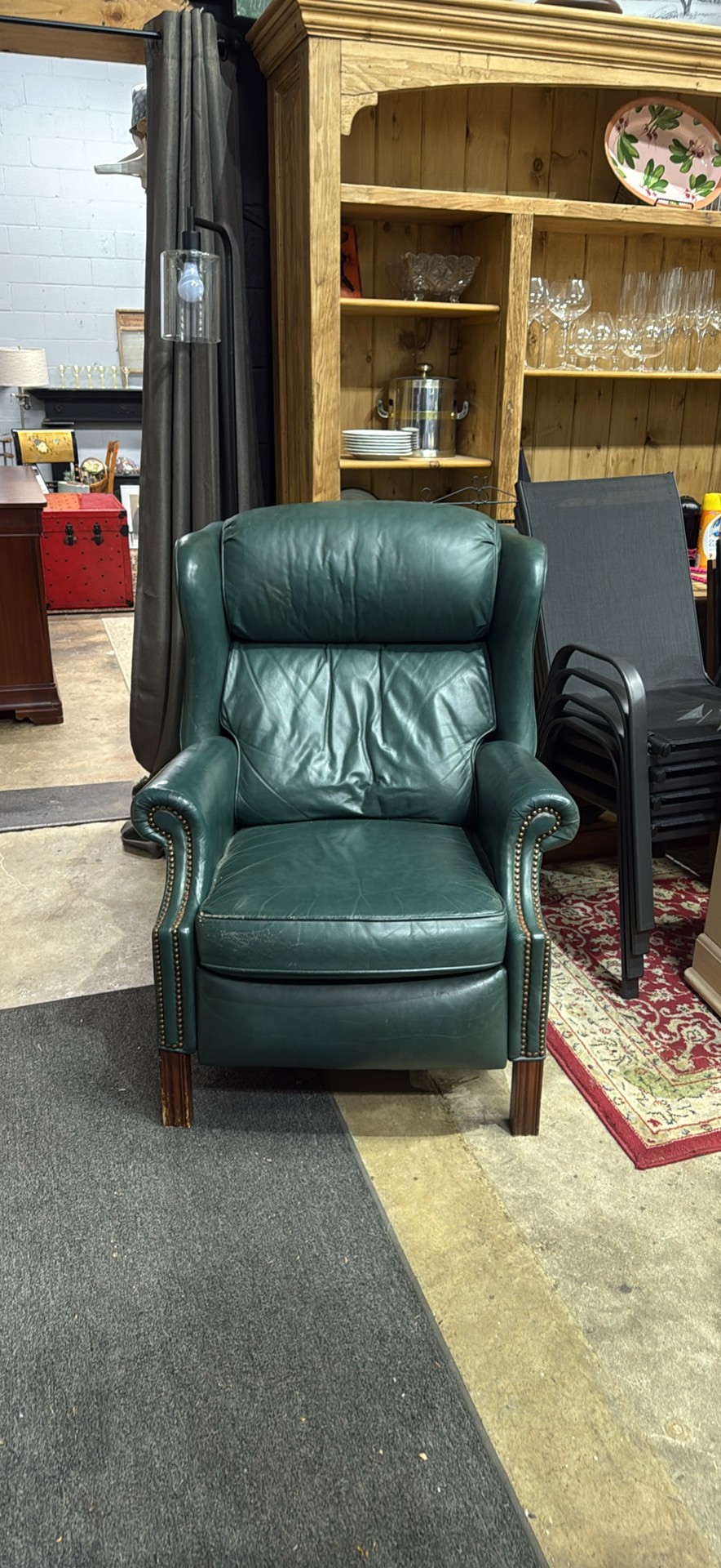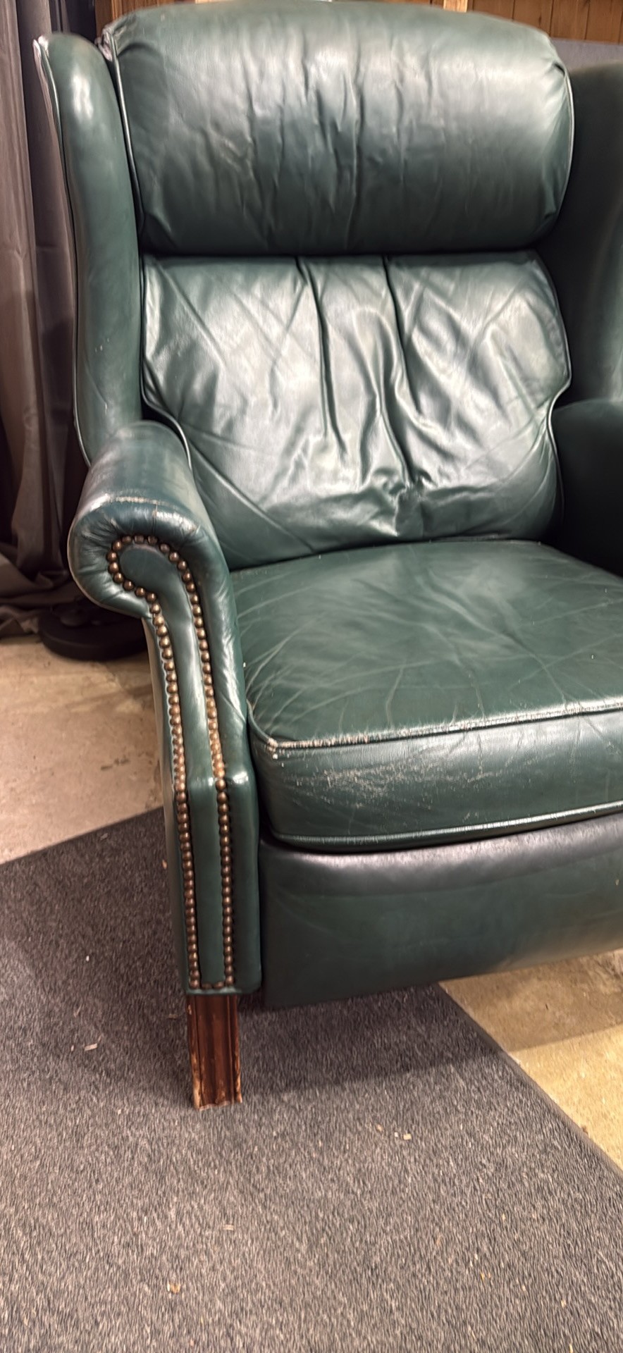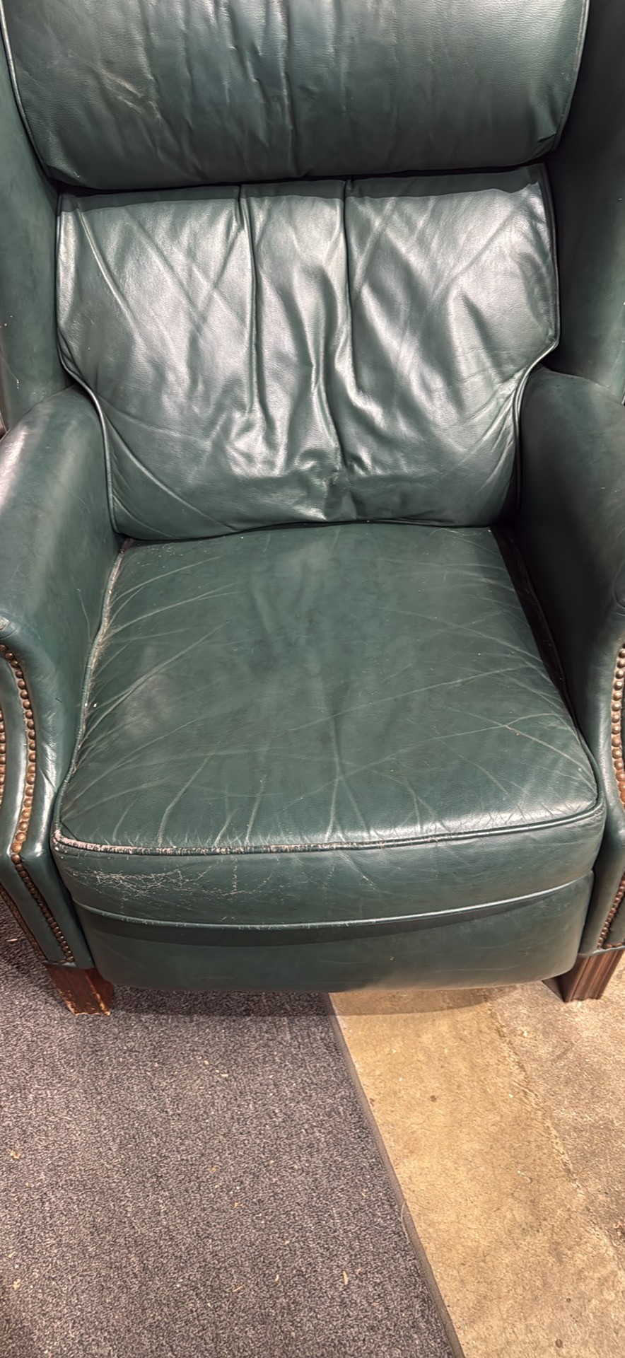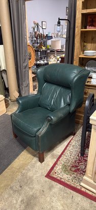 Comfy green leather armchair. Has cool nailhead trim detail. Great for a living room or study. Super soft leather. Classic style.