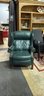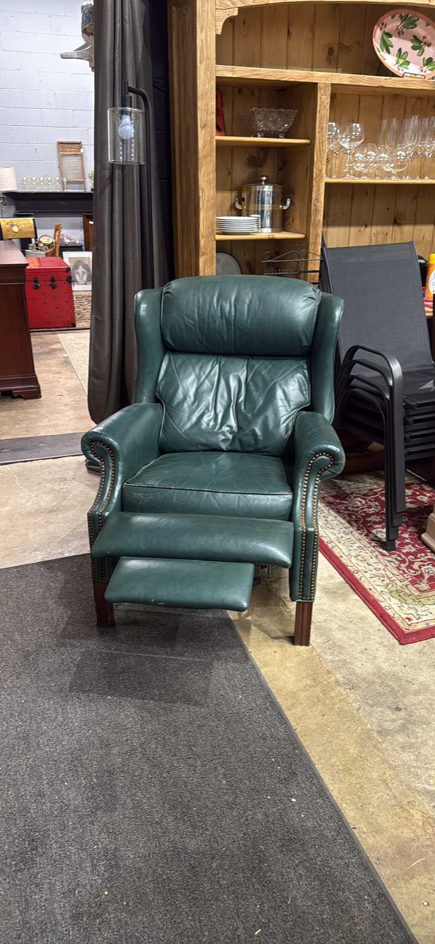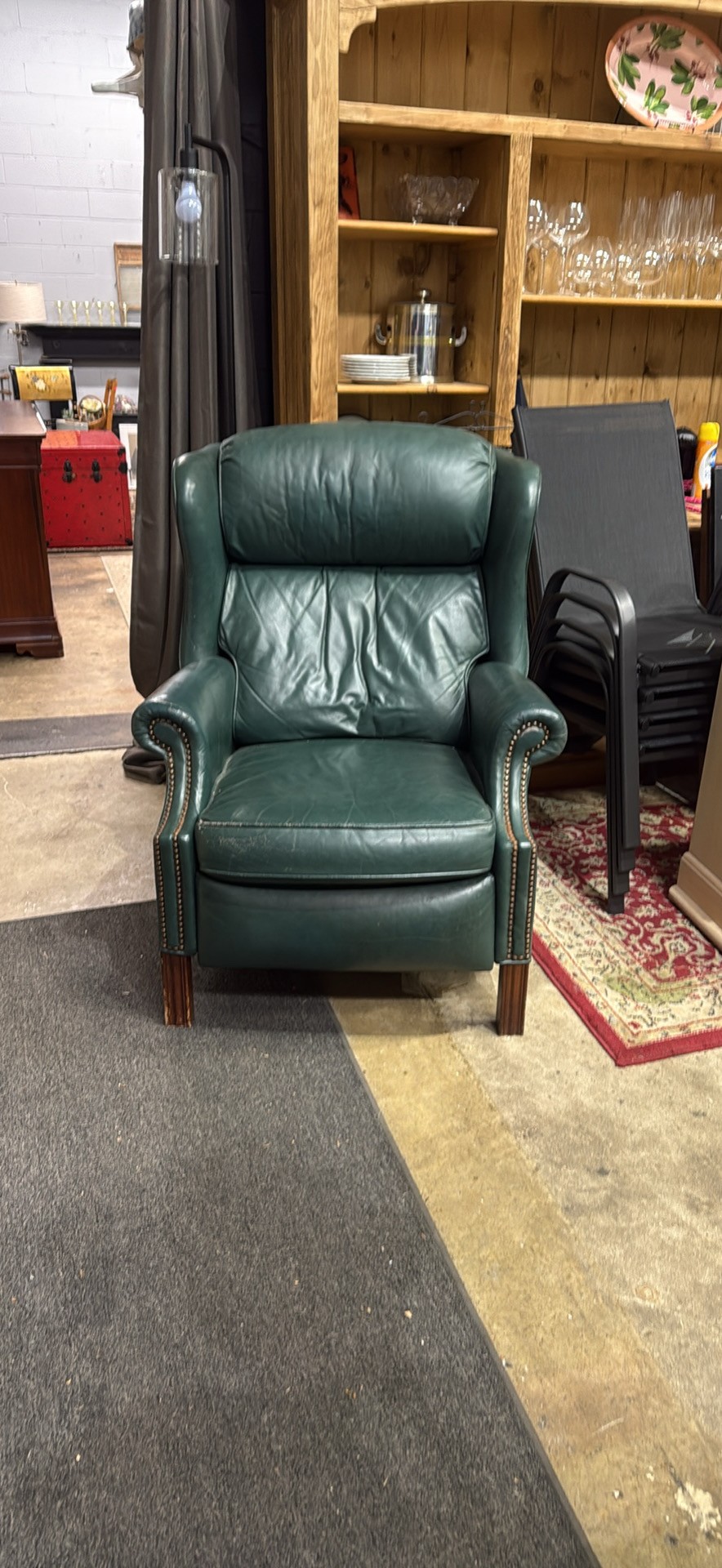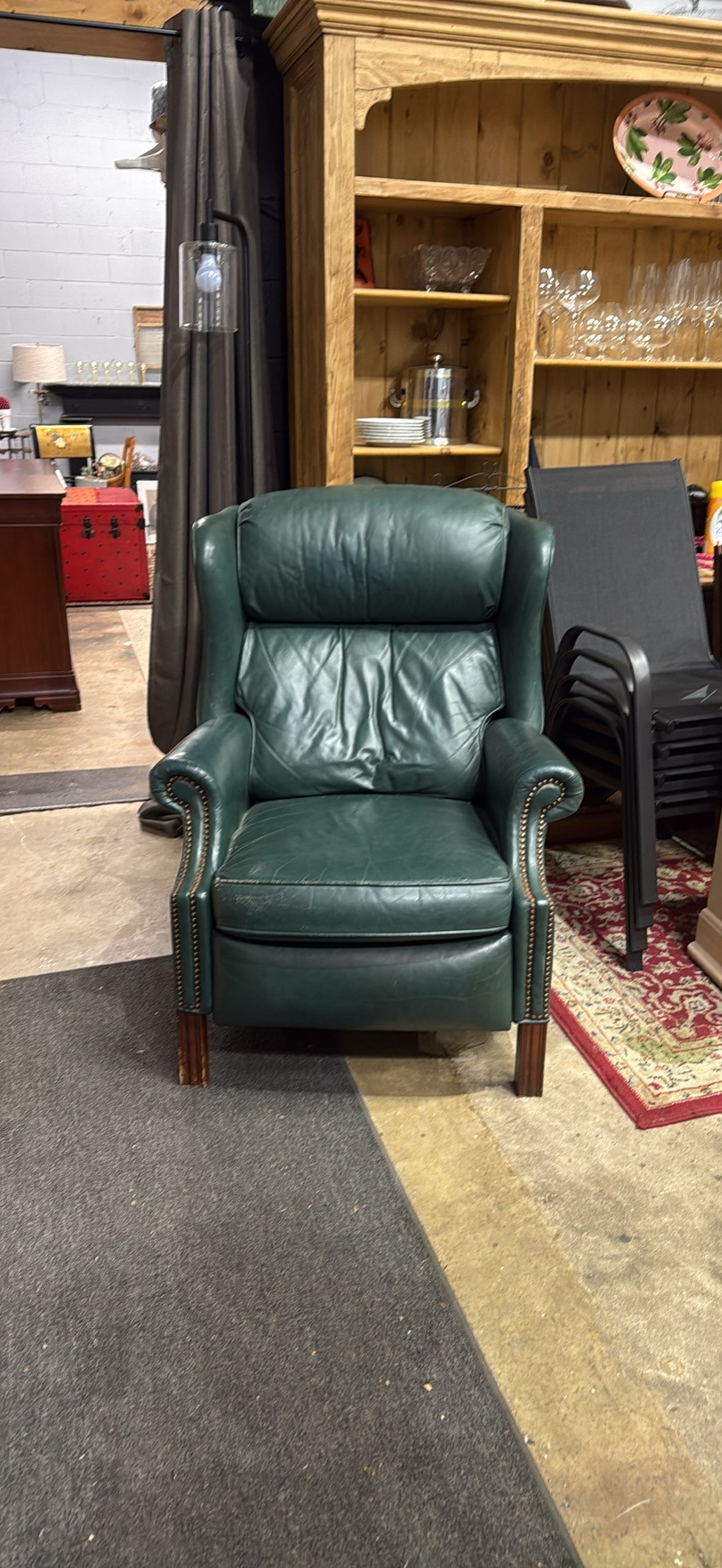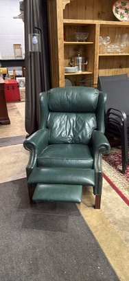 Comfy green leather armchair. Has cool nailhead trim detail. Great for a living room or study. Super soft leather. Classic style.