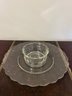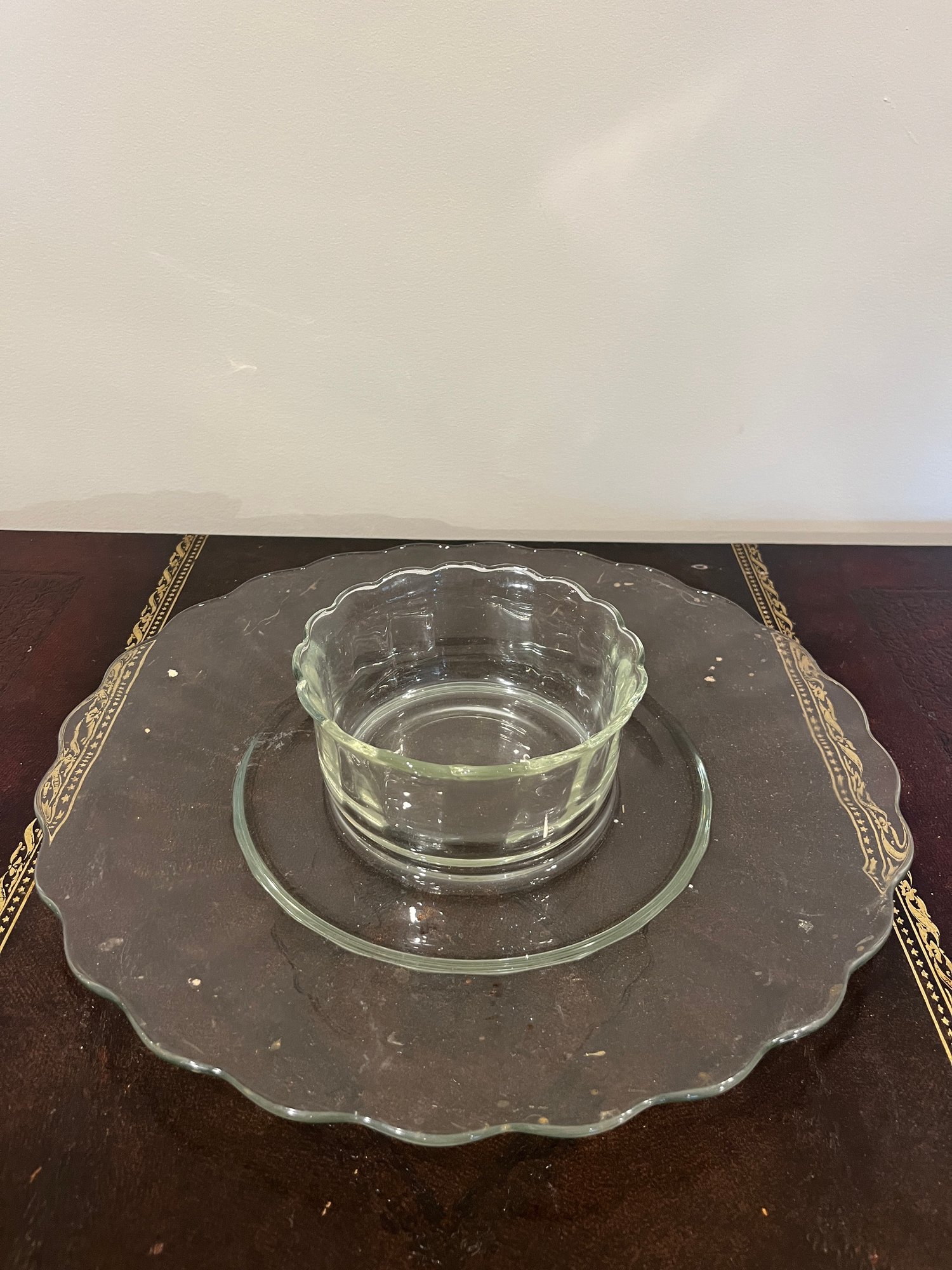 Dish is 14 inches in diameter. Bowl matches 5.5 inches in diameter by 2.5 inches high.