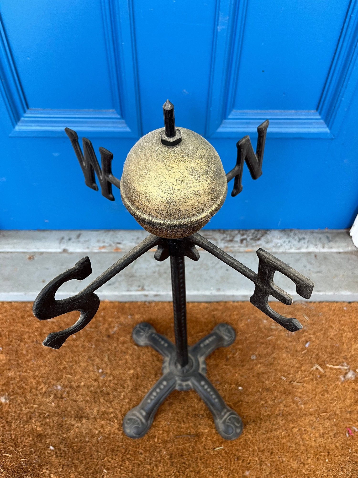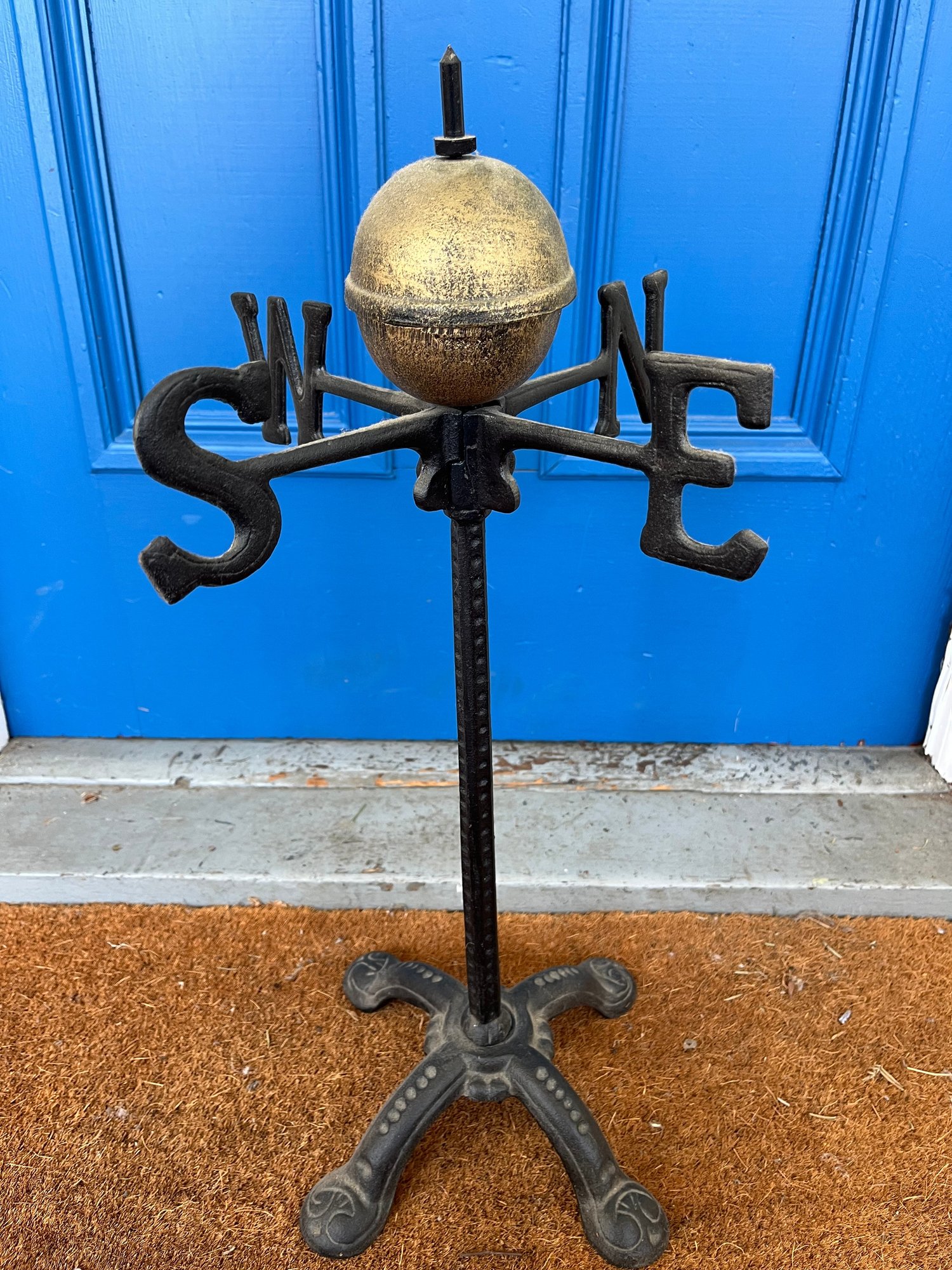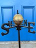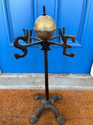 Metal weathervane typically used as garden decor, featuring directional letters (N, E, S, W) around a central globe. Historically used to indicate wind direction, often placed on high structures.