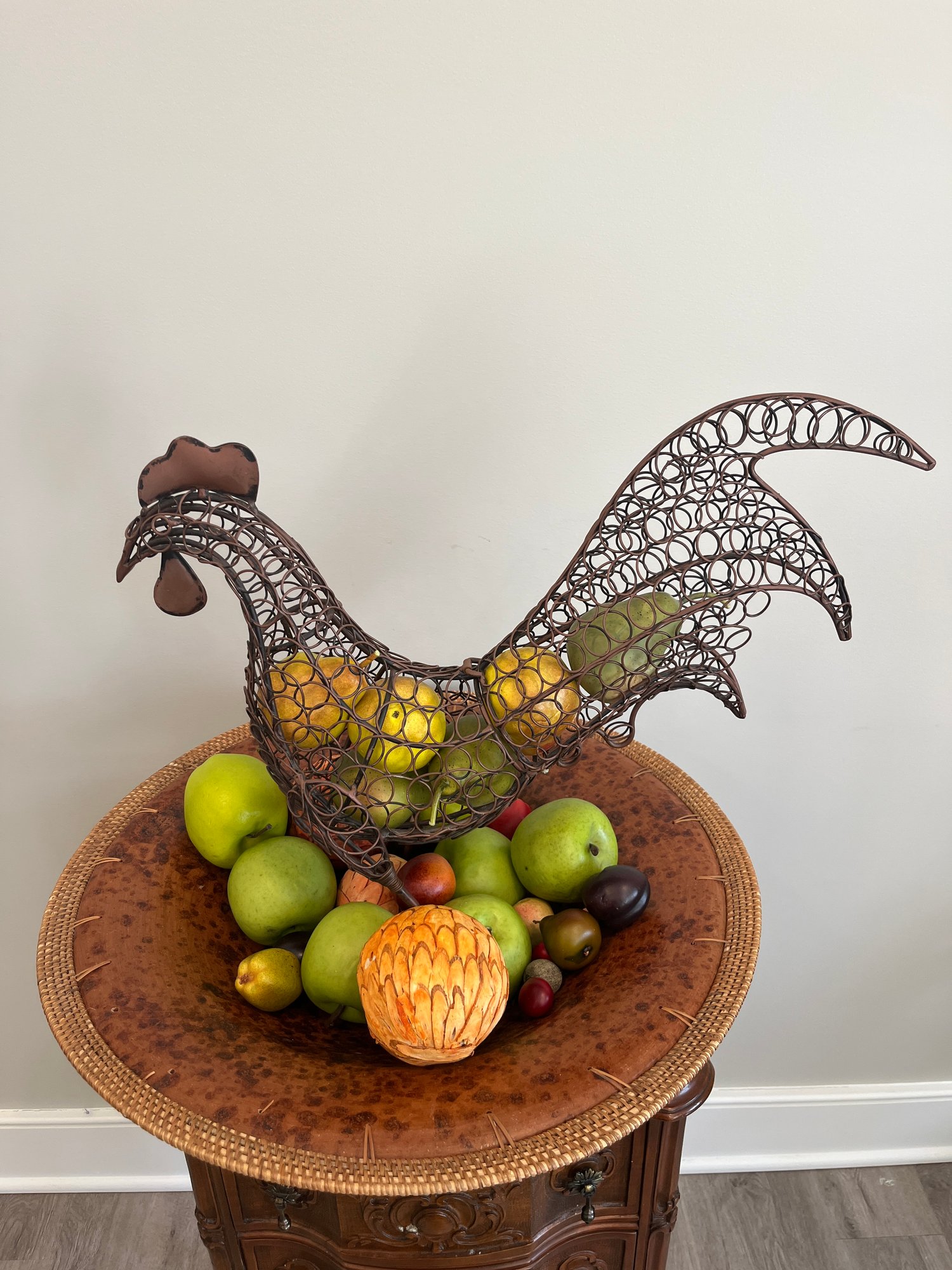 Bowl measures 21.5 inches across by 4.5 inches high. Metal rooster measures 19 inches across by 18 inches high.