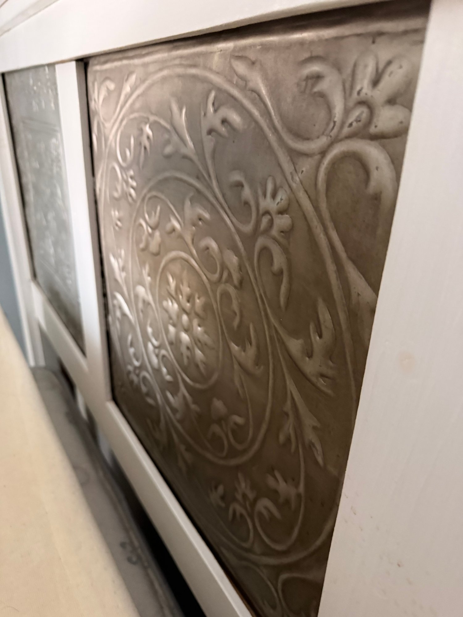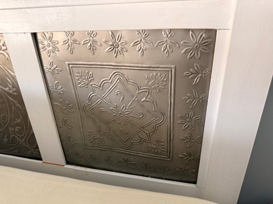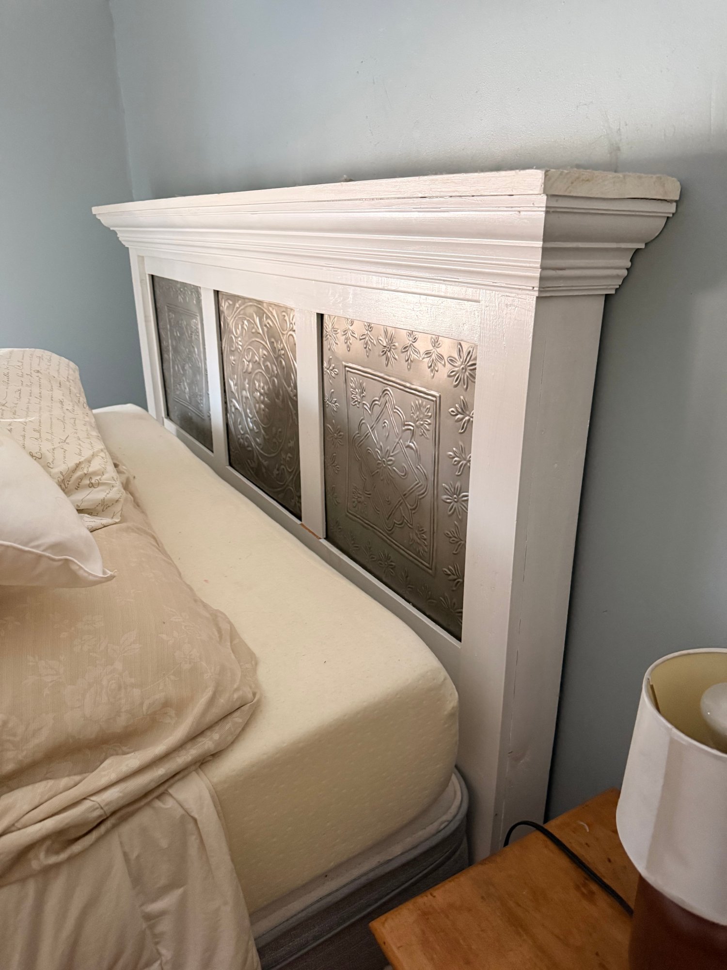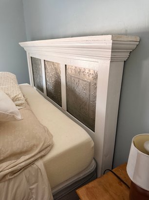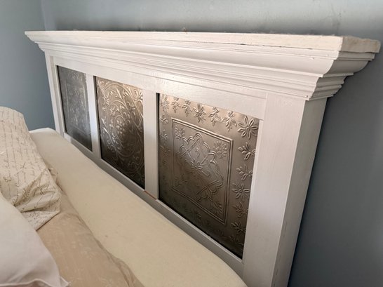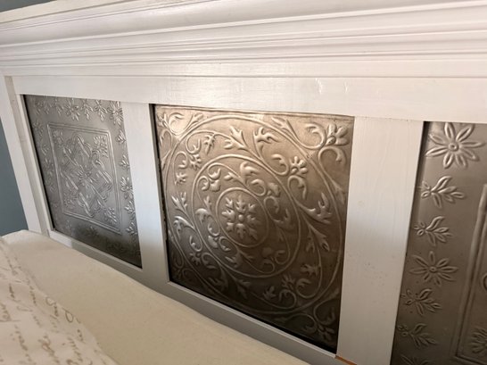 A hand‑made white headboard with tin decorative inserts. Headboard is a stylish piece that blends rustic charm with vintage flair. It’s both functional and decorative with a farmhouse, shabby‑chic, coastal, or cottage‑style.