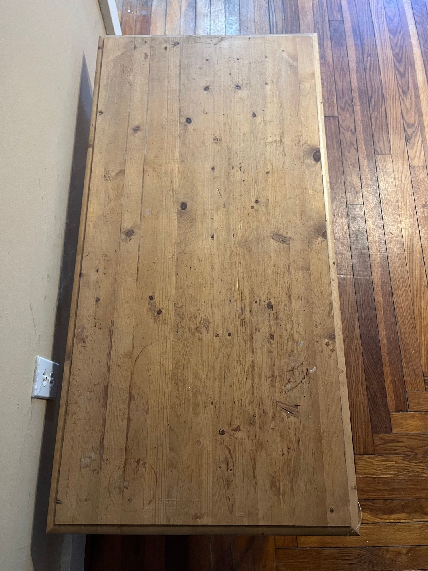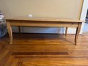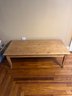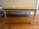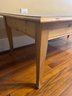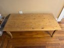 Rustic wood table, commonly referred to as a farmhouse or harvest table.