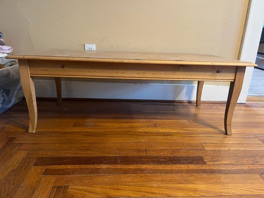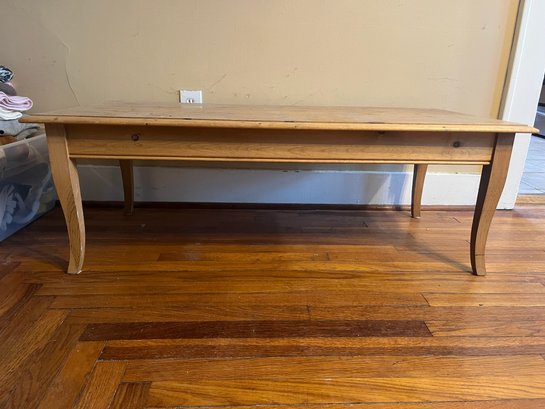 It features a minimalist frame with curved cabriole legs. The table is crafted from solid wood, appears to be pine, featuring a natural or distressed finish. The top is definitely rustic with some water margs and a distressed took.