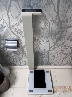 Design & Technology: Features a sleek column design with a glass platform and four power sensors for a stable stance.