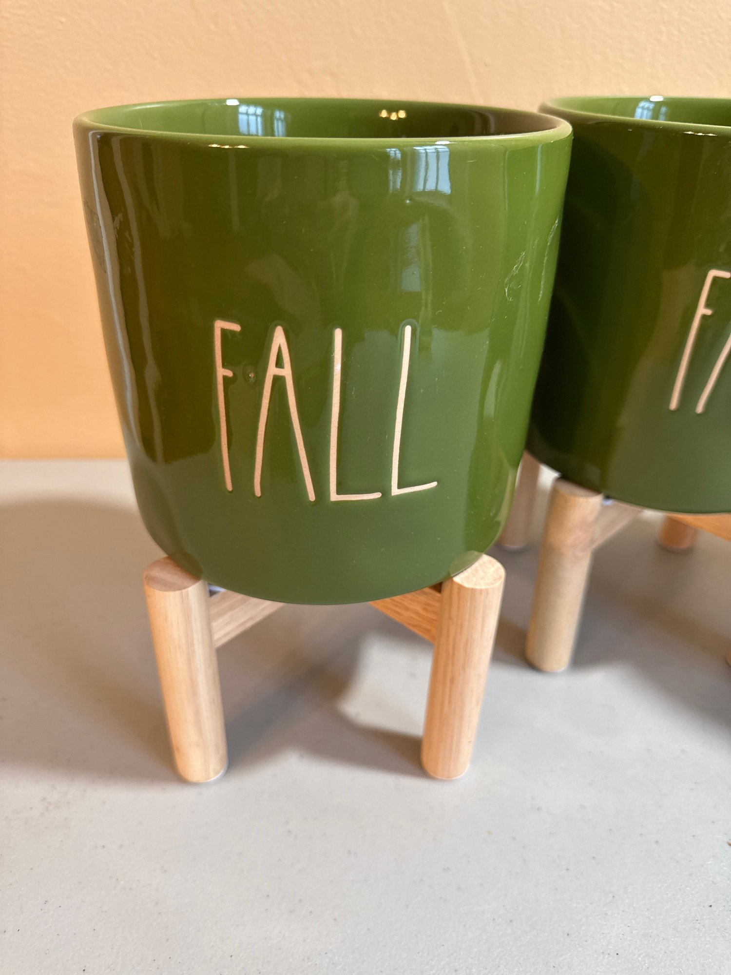 Set of 3 Rae Dunn planters with wood stand is a perfect seasonal accent for any home. Display them on a countertop, windowsill, or table to bring a touch of farmhouse charm and fall elegance to your décor.
