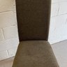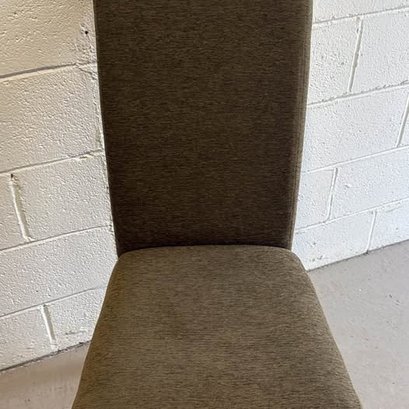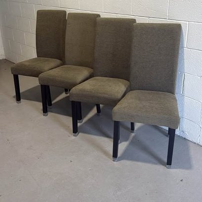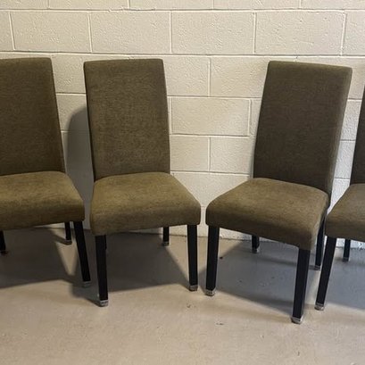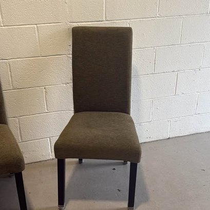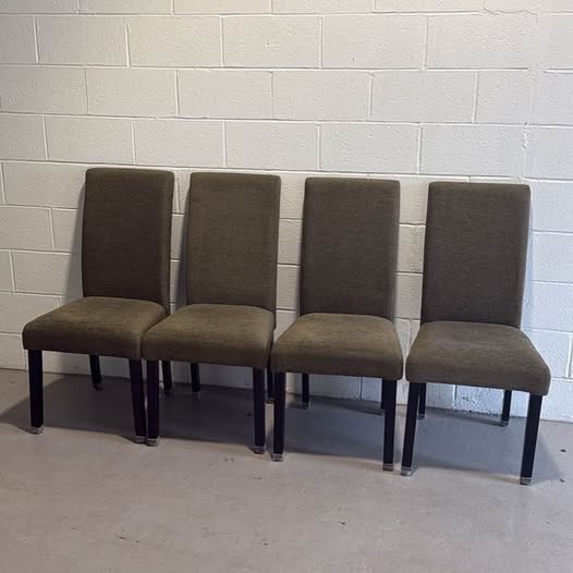 Comfy set of 4 olive green dining chairs. Upholstered fabric is nice and solid. Dark legs with silver caps on bottom. Great for a dining room table or extra seating.