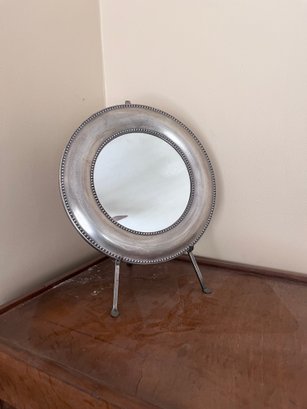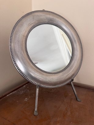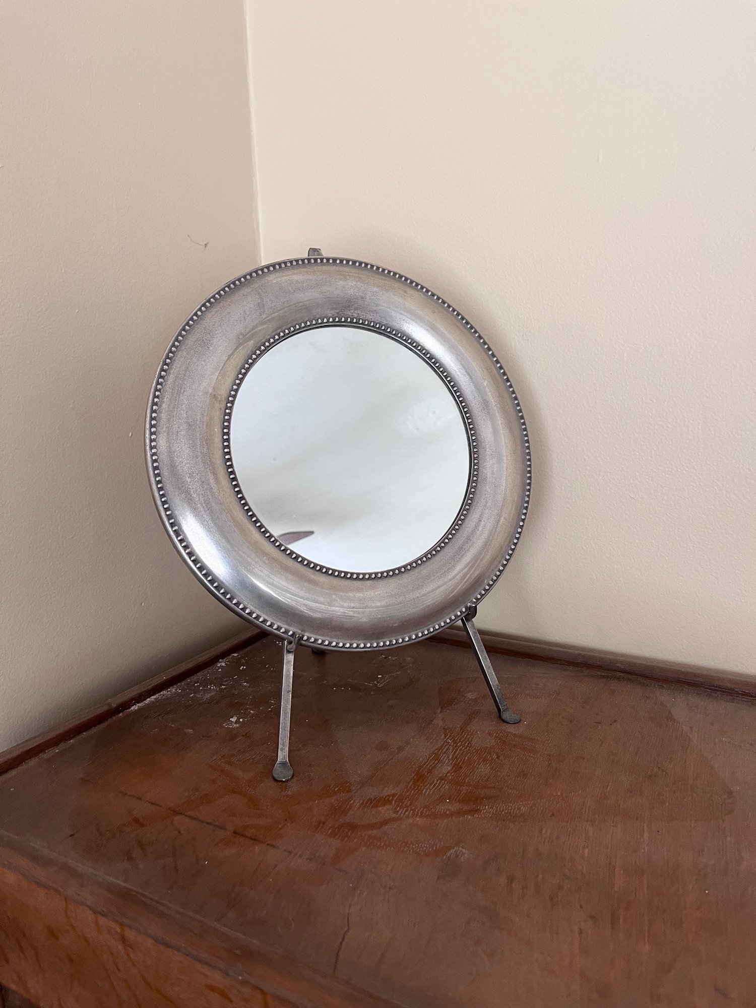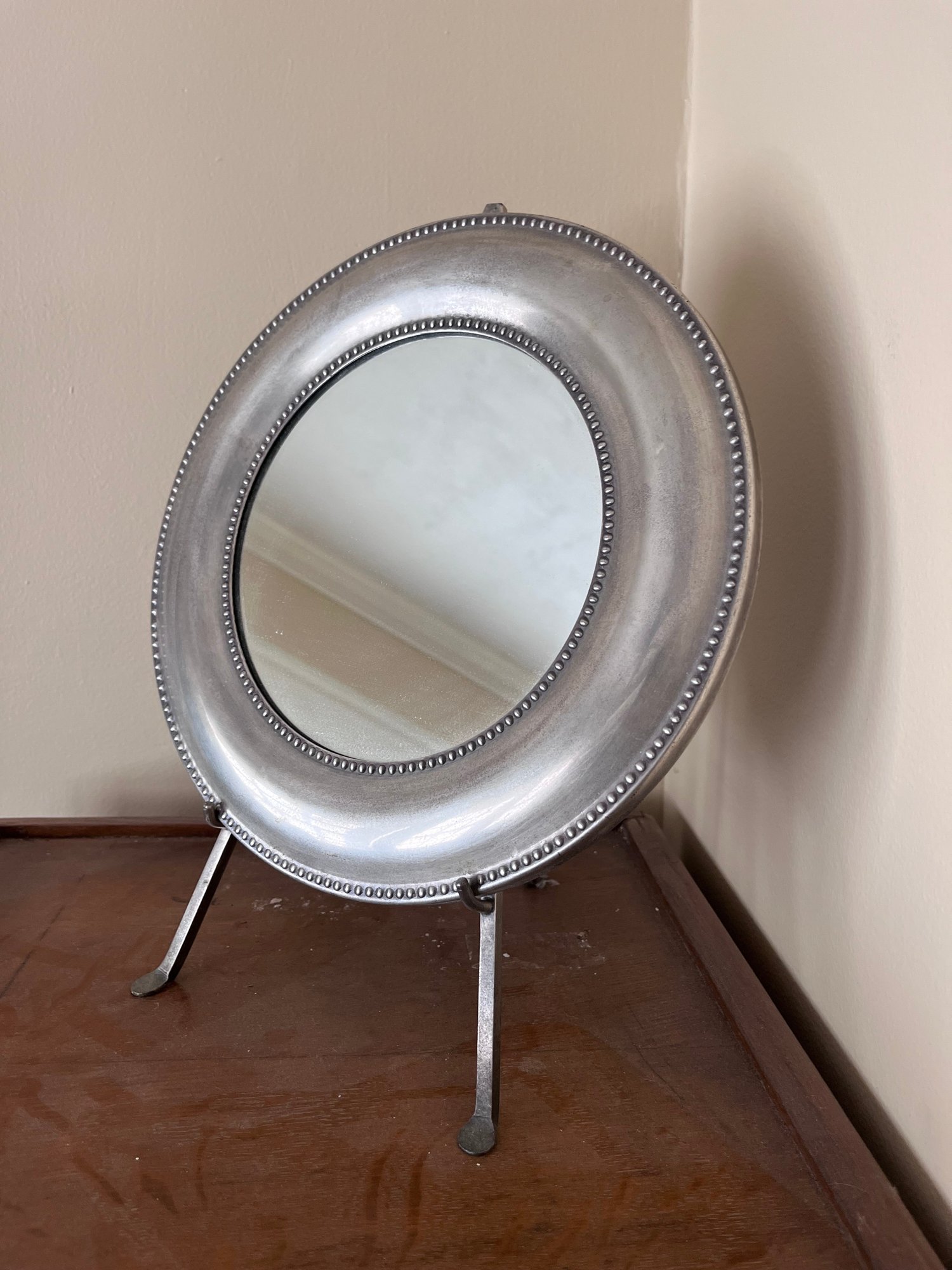 Silver Beaded Round Mirror on a separate easel-style stand. The frame is made of stainless steel and iron with an antique-silver finish and features a classic beaded border.