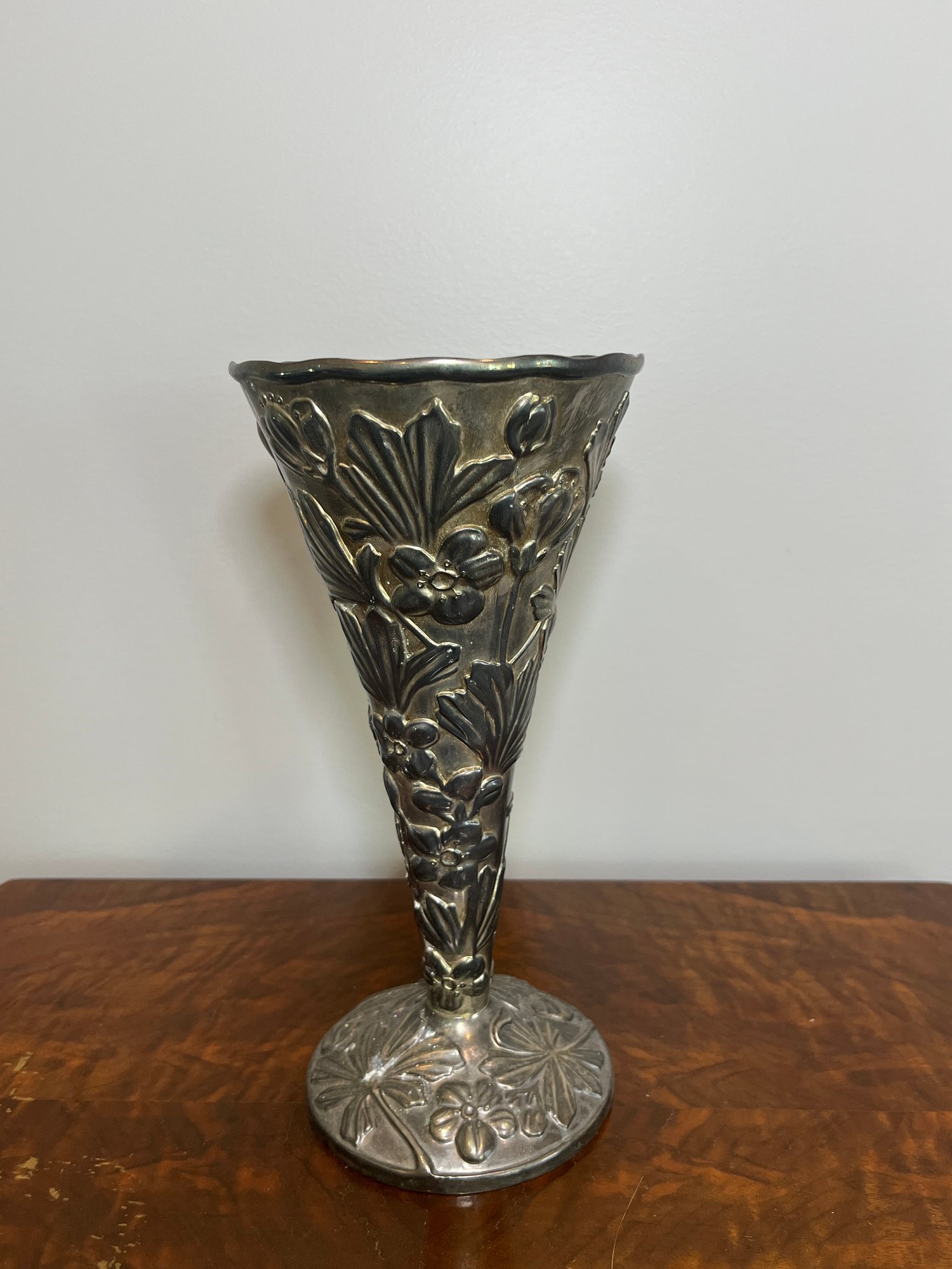 Silver plated vase,. These vases gained popularity during the 1800s, with production in England, America, and Japan, each region incorporating its design elements. Features a 3-D floral pattern, possibly influenced by Art Nouveau or Victorian styles.