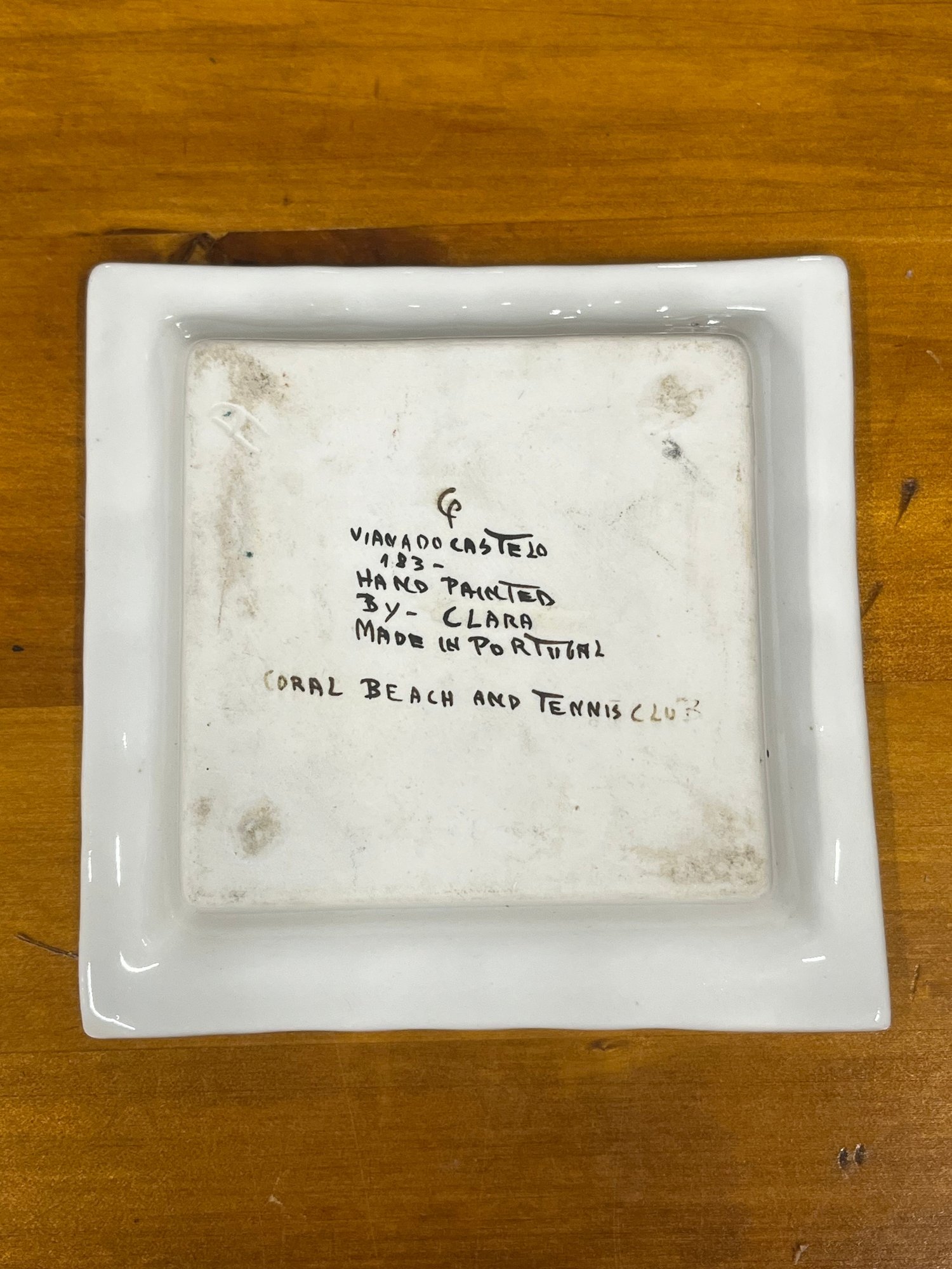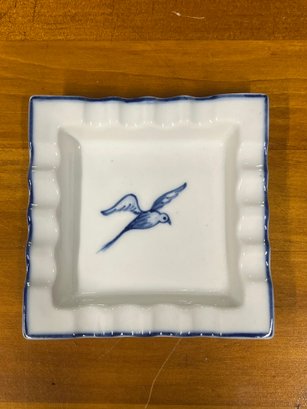 Square porcelain trinket dish or tray featuring a hand-painted blue bird motif, closely resembling designs found in vintage blue and white ceramic collections.