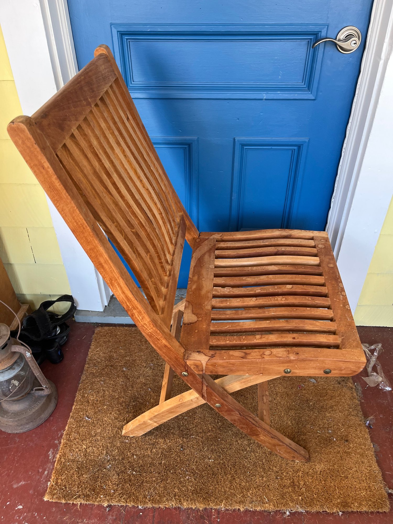 Features a slatted back and seat for drainage, with a foldable frame for easy storage. Please note. I’ve seen in photographs. This chair has watermarks and should be retained. That being said it is very sturdy and has a lot of life left to it.