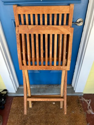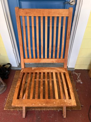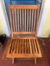 Teak folding patio chair, a popular choice for outdoor furniture due to the wood's natural durability and resistance. Typically crafted from solid Grade A teak wood, often finished with a hand-rubbed wax or natural oil to highlight the honey-brown grain.