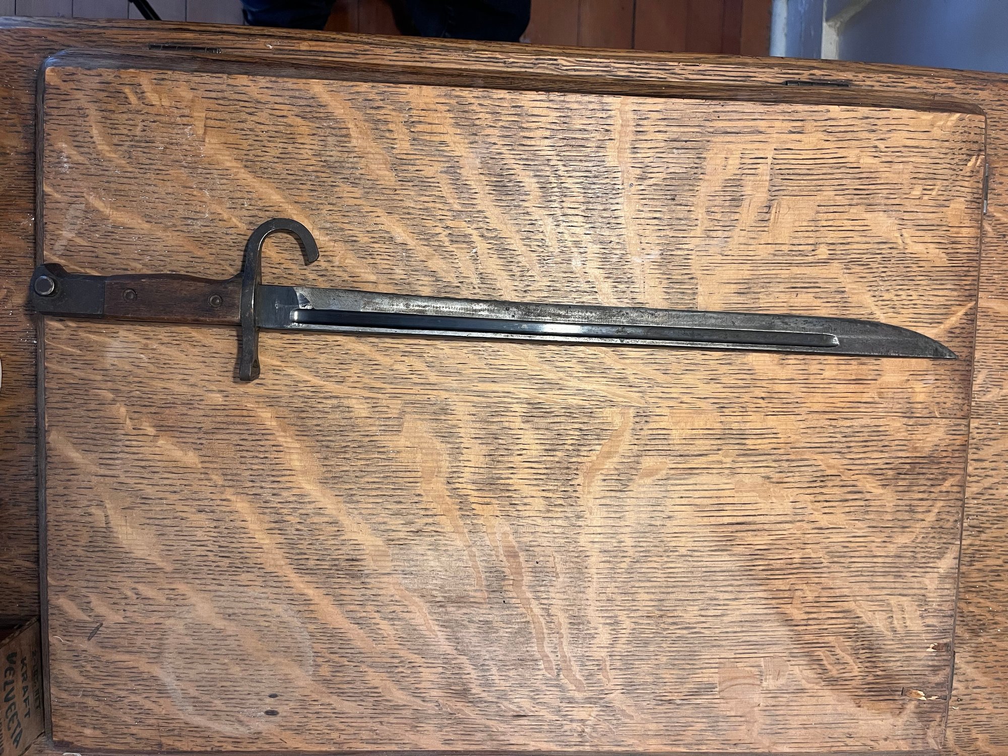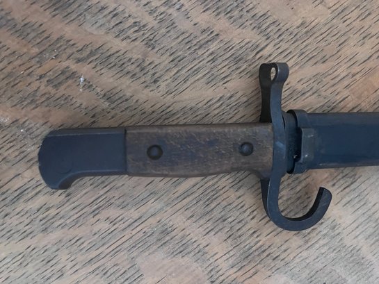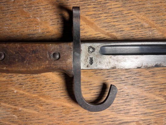 Hooked Quillon: The bayonet in the image features a distinct J-shaped hooked quillon, a characteristic of early models produced before 1942, when the feature was eliminated to save materials.