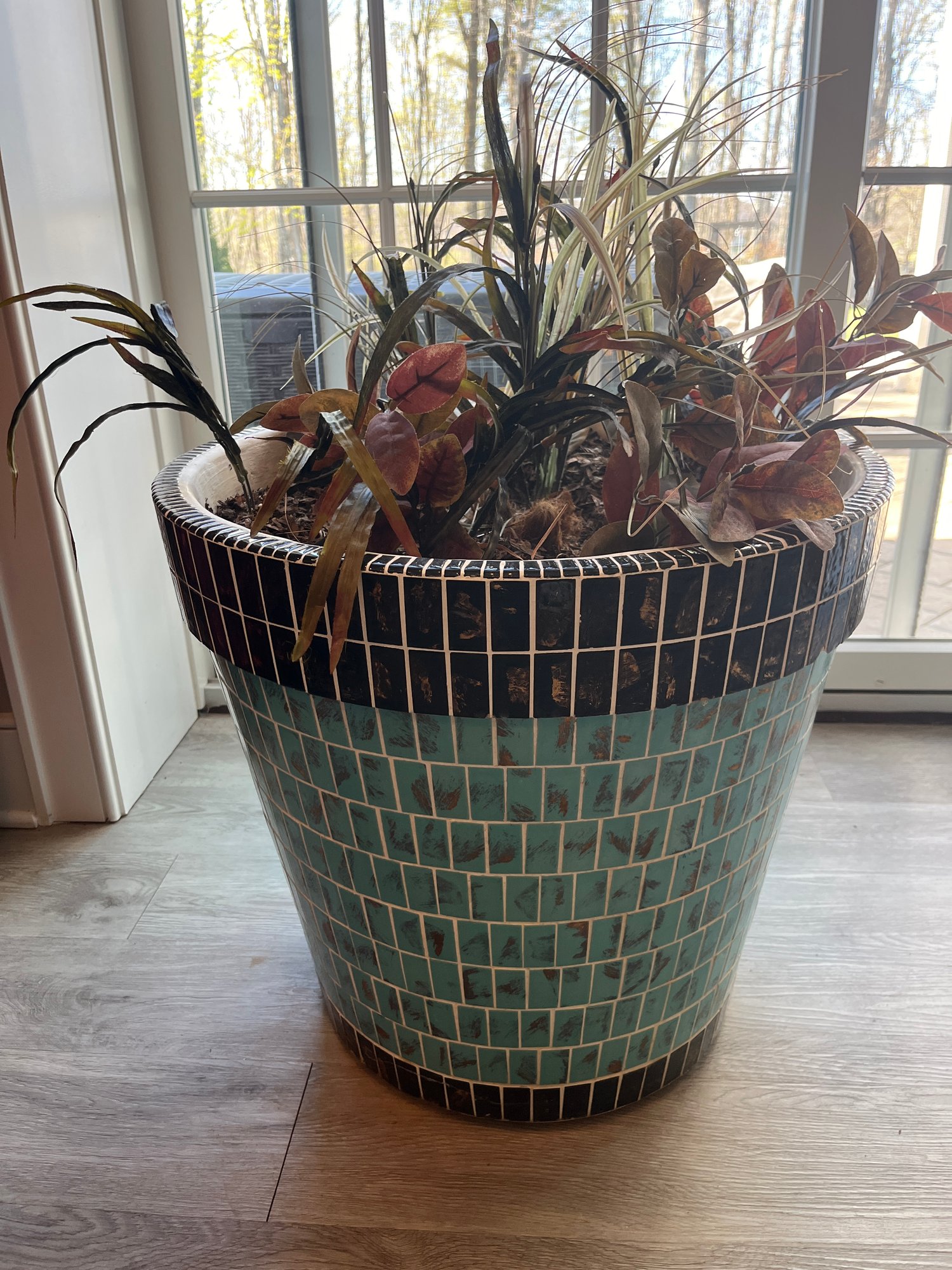 Large tile flower pot with a mosaic design. Ceramic tiles are durable and retains moisture well.