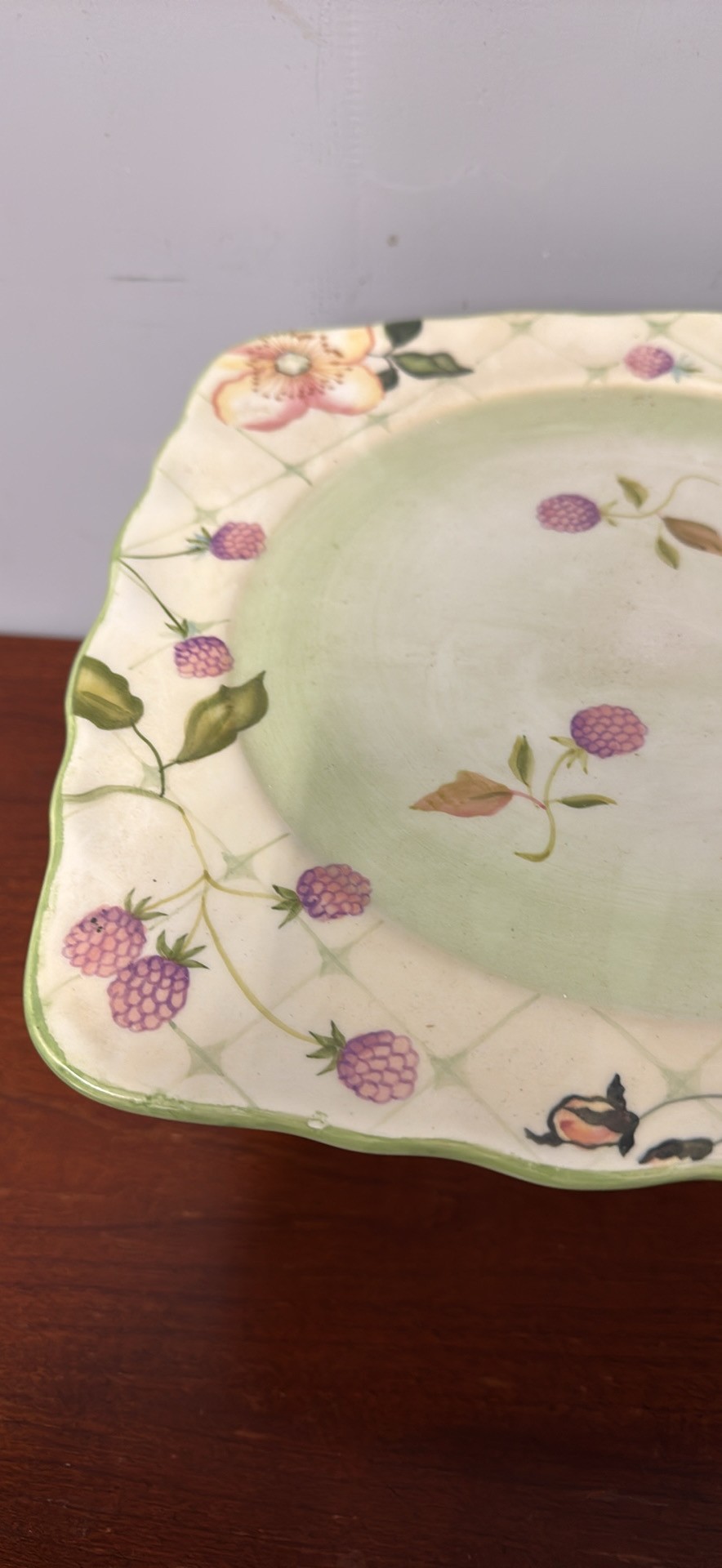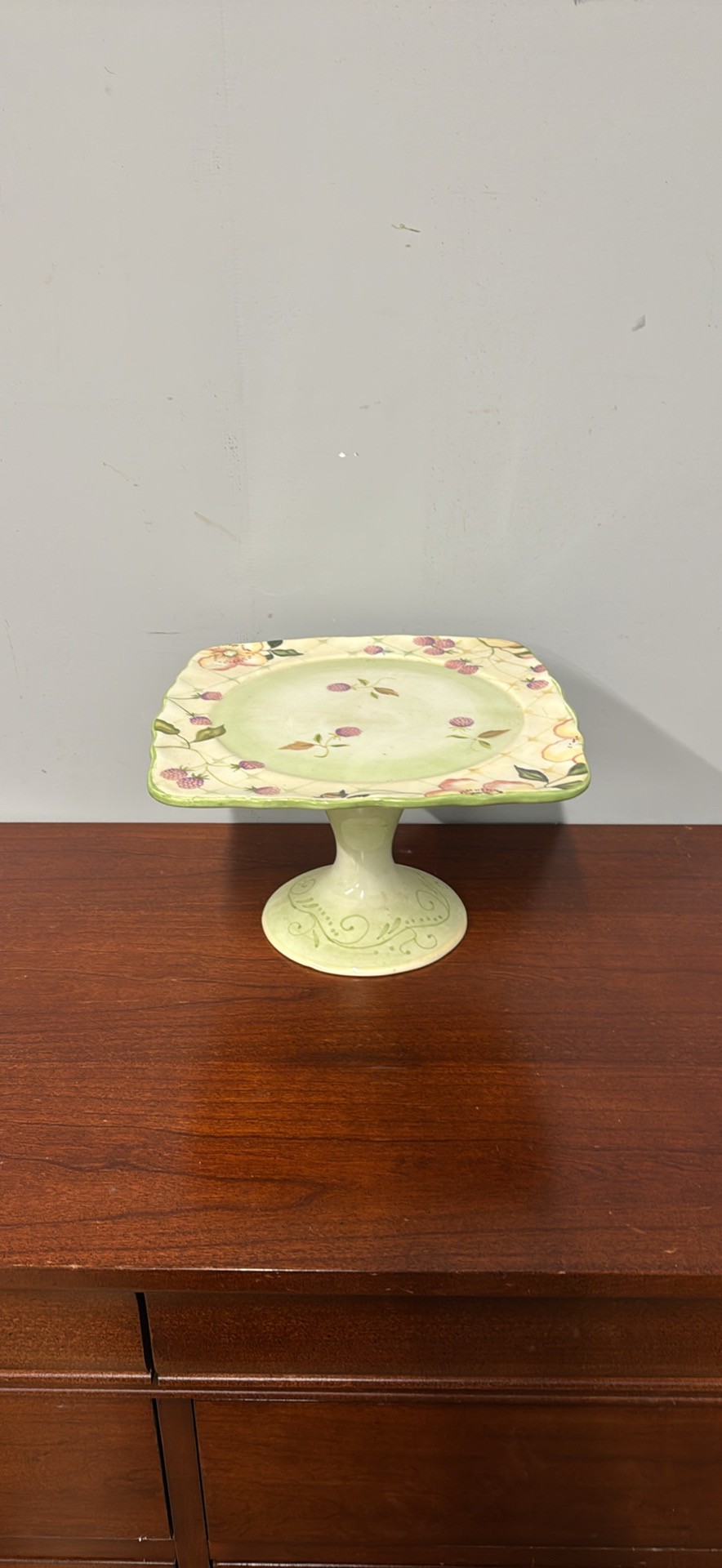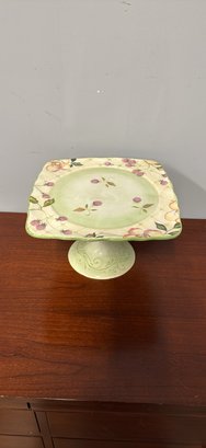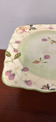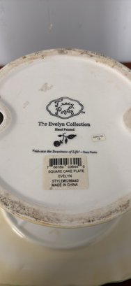 Charming Tracy Porter Evelyn Collection square cake plate stand. Hand painted design with berries and flowers. Great for desserts or display.