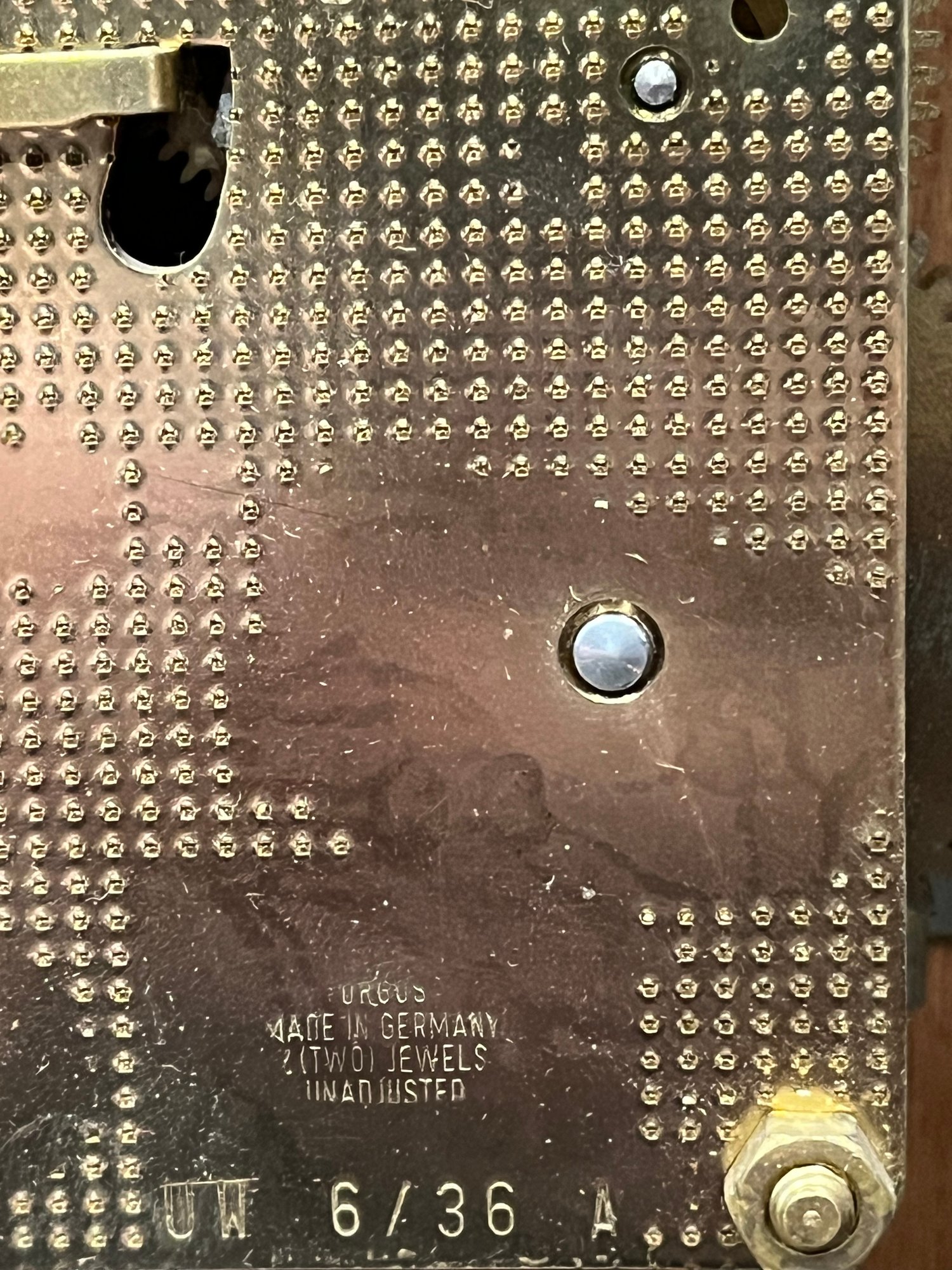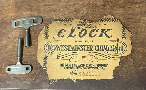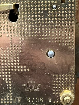 Dial marked New England Clock Company. Movement stamped Urgos Made in Germany with jeweled mechanism — known for reliability and smooth operation.